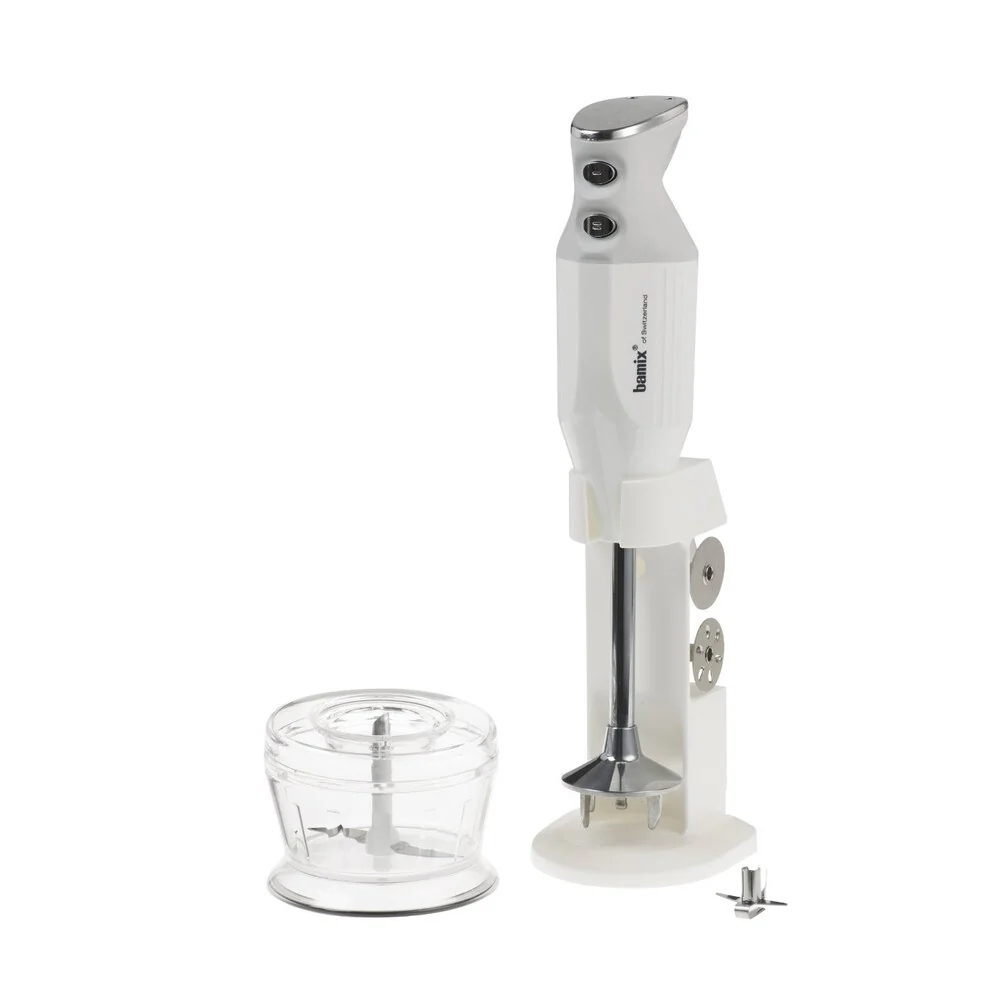 - Package includes Bamix deluxe unit in black, 3 blades for aerating, blending and chopping, a dry grinder and a table stand in black