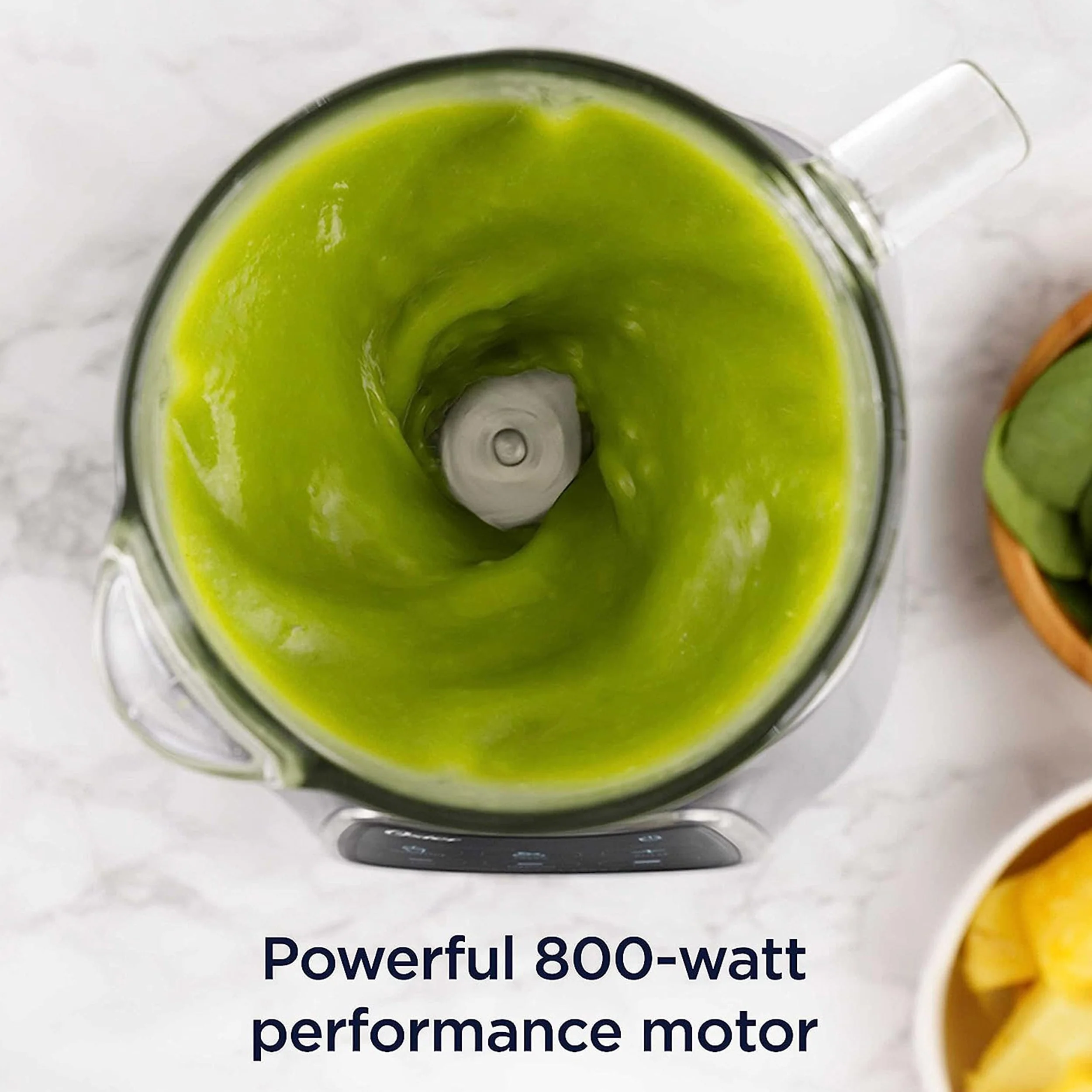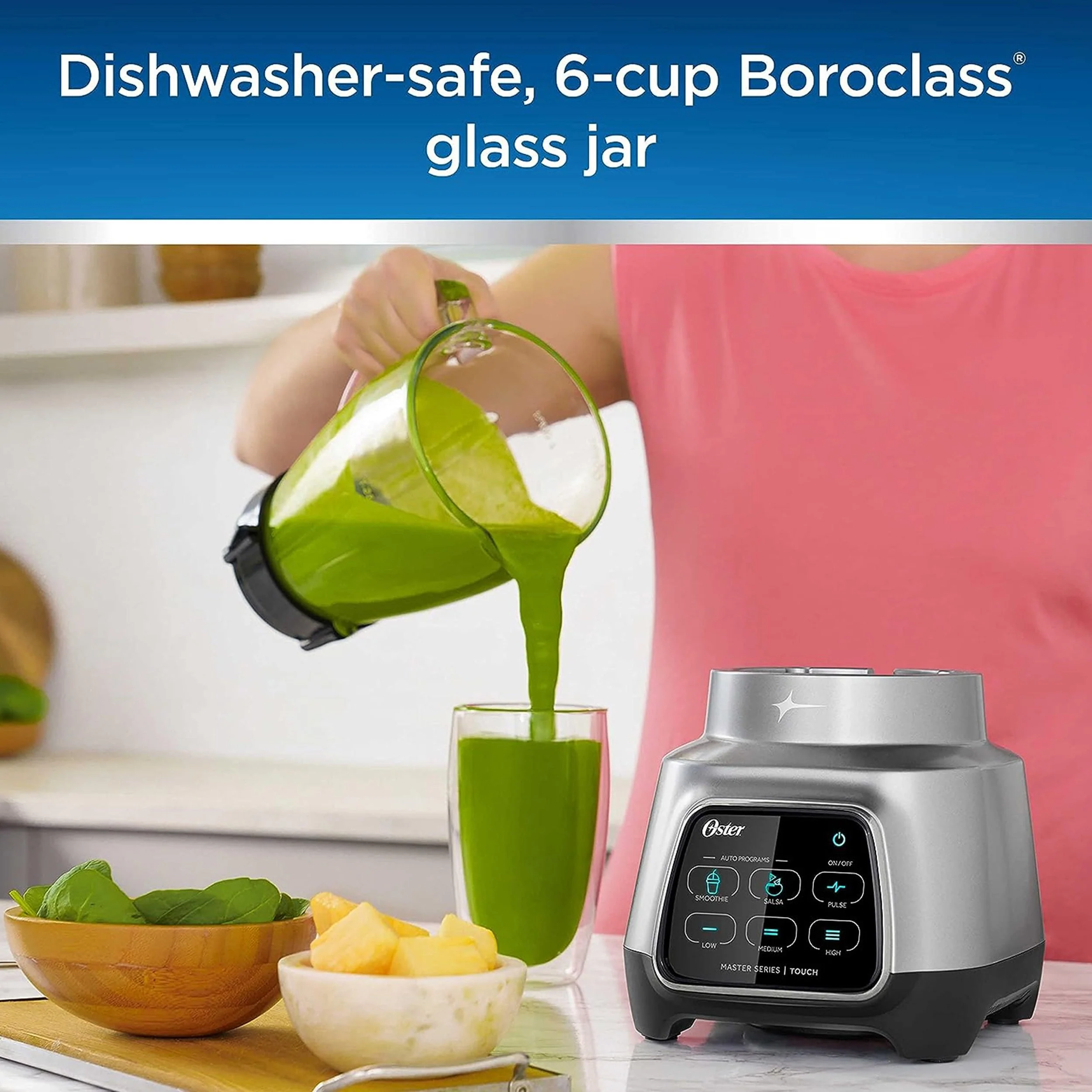 This Oster Power Blender features 800 watts of powerful blending performance with intuitive touchscreen controls. The simplified touchscreen uses Easy Touch Technology to help you blend your favorite treats with ease. Just press the Power button for 1 second, and then release for smoothies and salsa in no time. With 6 speed settings and pulse functionality, the power blender is perfect for creating smoothies, frozen drinks, salsas, and more. No slip rubber stoppers on base keep this blender in place for ease of mind while prepping your smoothies and sauces.Color: Matte MetallicMaterial: Plastic, Metal, Boroclass Glass Jar6 Speed Options including: smoothie, salsa, pulse, low, medium, highEasy to Use TouchscreenAuto ProgramsPowerful MotorExtra Wide BladeAll Metal DriveCustom Speed ControlSet Includes: One blending base, One glass jar, one metal blade, one lid with removable 20oz topper cupPer Item Measurements:Blender Base- 7.25in length, 7.25in width, 7in height, 3.2lb weightJar- 7.5in length, 5.25in width, 8in height, 3.15lb weightOverall- 7.25in length, 7.25in width, 14.25in height, 6.4lb weight