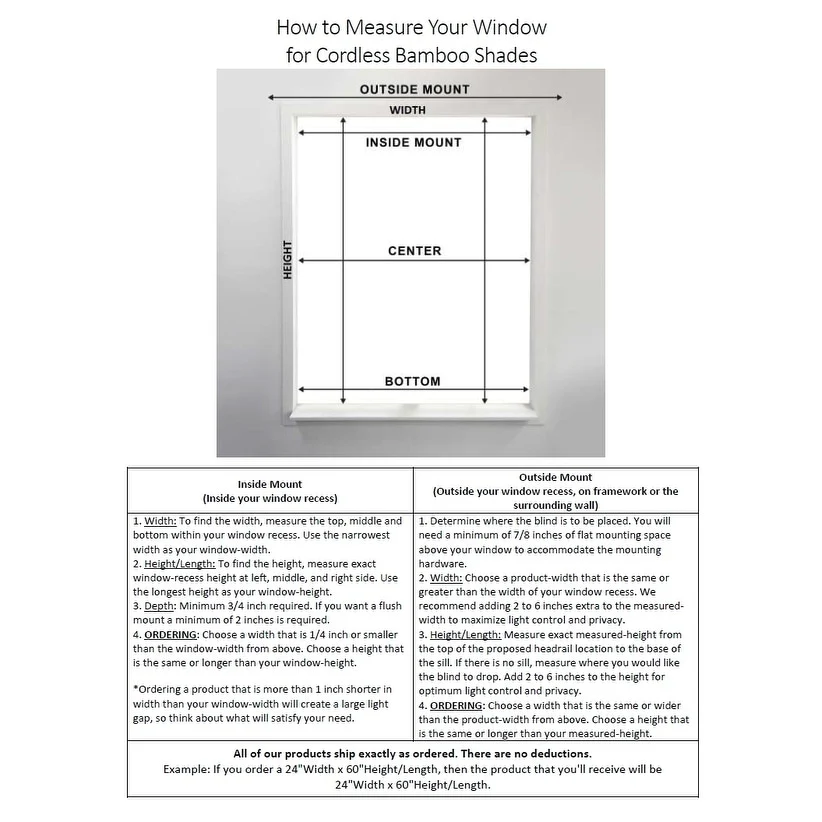 - We recommend you to refer to the guide in order to select the appropriate size for your window. For an inside mount, please choose a width that is 1/4 inch or smaller than the window-width from what you measure.