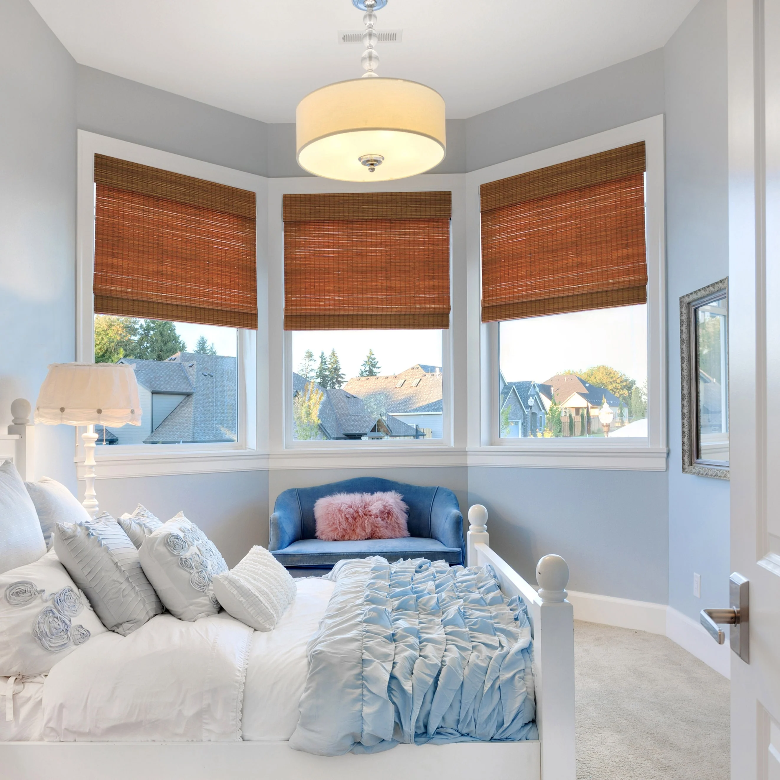 - Designer tip: add additional depth and texture to a room by layering Bamboo roman shades under curtain panels or cornice boards; to make a window look larger, outside mount the shades on the window molding or up to the ceiling.