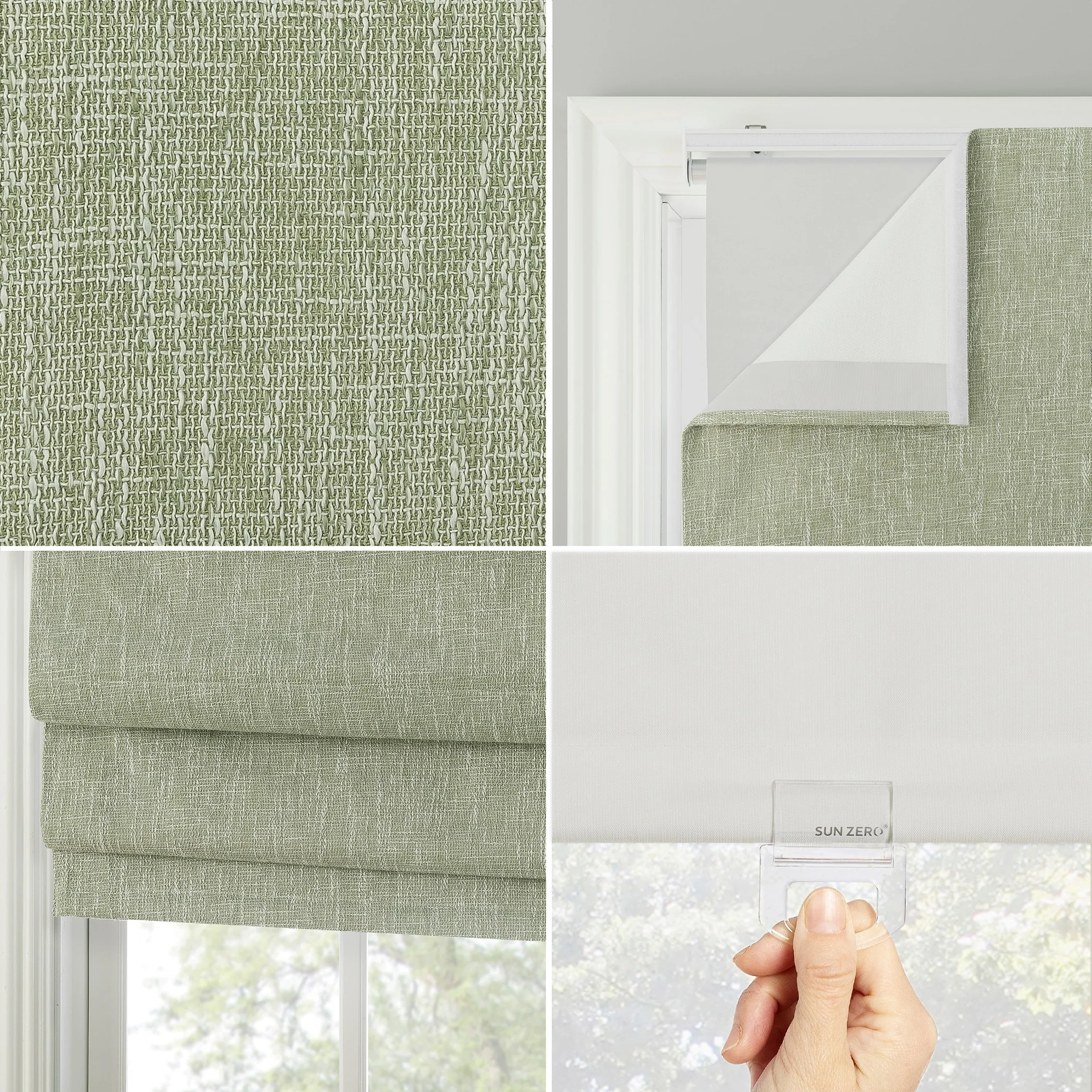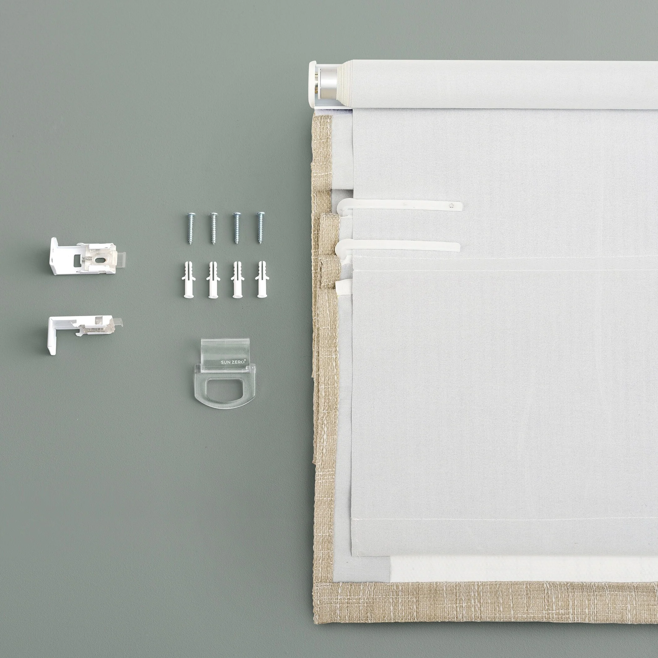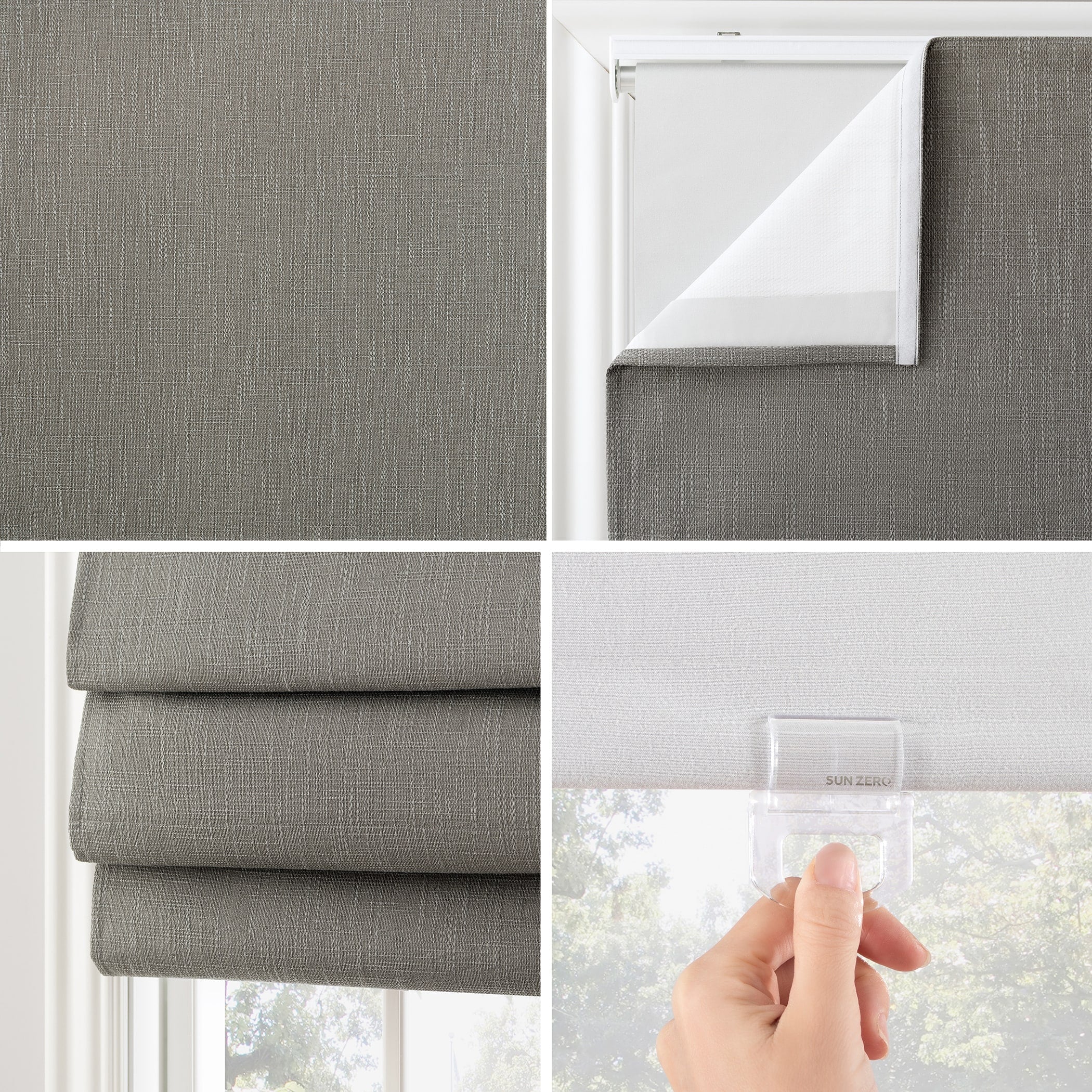 Featuring a subtle linen-like textured fabric, Sun Zero Pryer Textureds add sophisticated style and function to windows in any room for your home. Sun Zero Total Blackout technology is laboratory tested to block out 100% of light, reduce outside noise by up to 50%, and decrease energy lost through your windows by up to 45%. Comfort is optimized with thermal properties that help keep summer heat and winter chill out of your home. Best for Kids Certified cordless design with included handle pull for easy adjustment. Use in your entertainment room to eliminate screen glare and reduce distracting outside noise, or in your bedroom for enhanced privacy and a sounder, more uninterrupted sleep. Mounting hardware included for inside or outside mount as desired.