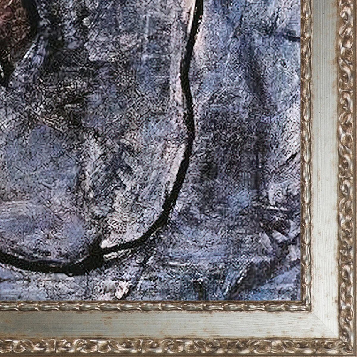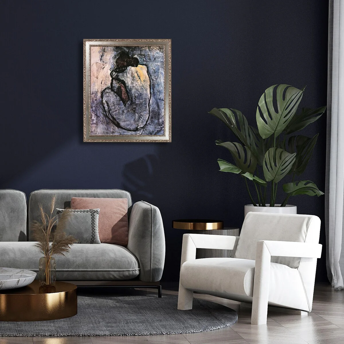 Painted during Picassos Blue Period which spraing from early years of poverty uring the time he first moved to Paris Picasso was a melancholic soul who devoted himself to painting other lost souls. Before this time period when he practiced art Picasso would ruthlessly observe people - but after experiencing poverty and melancholy his tone changed to viewing them with sympathy and tenderness. During this period of sadness he painted solitary emaciated fiures often alone with vague and empty backgrounds. Frame Description Versailles Silver Salon Frame