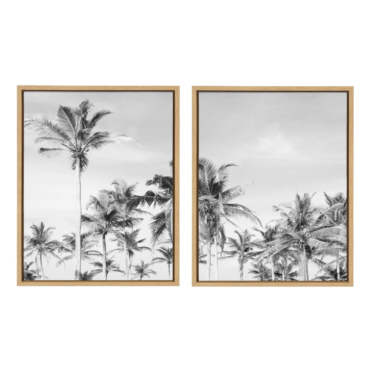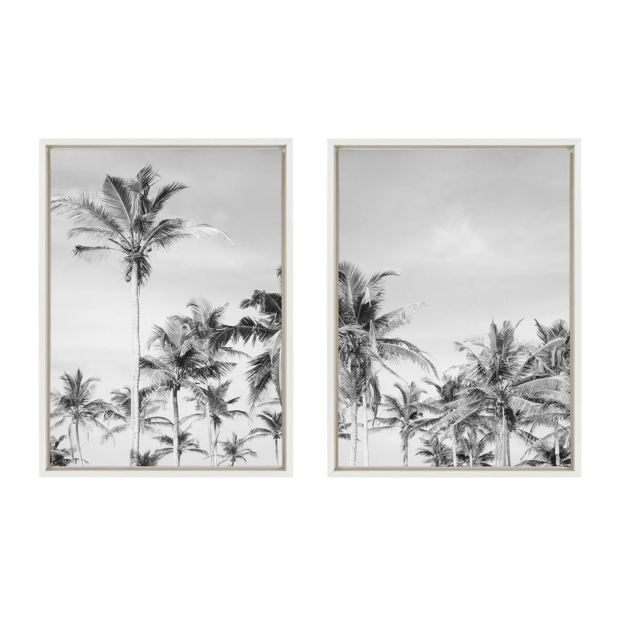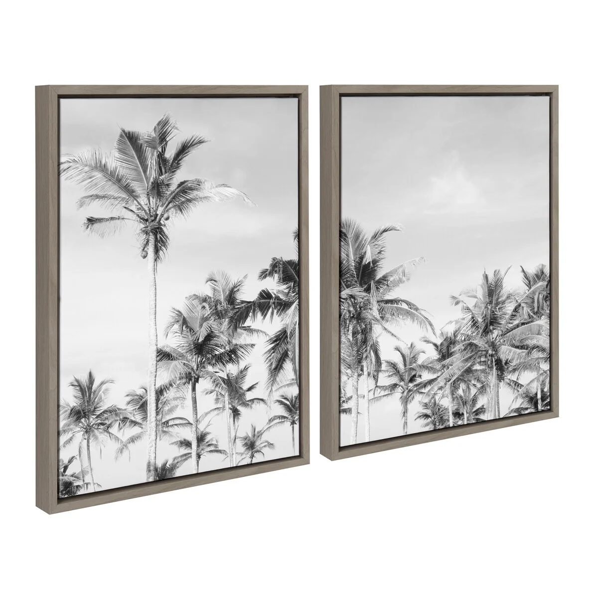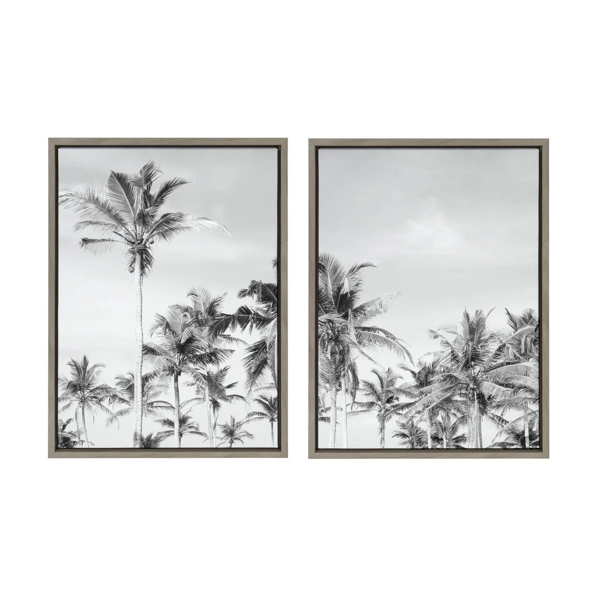Reminisce about warm breezes, palm trees, and coastal beachscapes with this beautiful set of art. Framed in the USA in Waunakee, Wisconsin, this floating canvas art will be a pleasure to look at every day in your living room, bedroom, nursery, or any room in the home. Printed on gallery-wrapped canvas and framed with a lightweight polystyrene frame, this wall art has two hangers already attached to the MDF back for easy wall display. The outer dimensions of each frame are 24 inches tall by 18 inches wide by 1.63 inches deep. Print Names: 'Coastal Coconut Palm Tree Beach BW Left' and 'Coastal Coconut Palm Tree Beach BW Right'