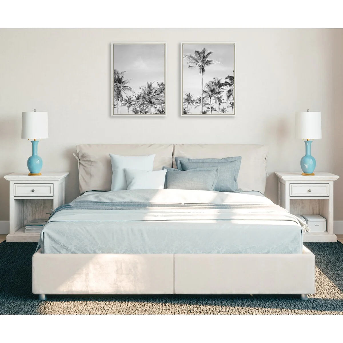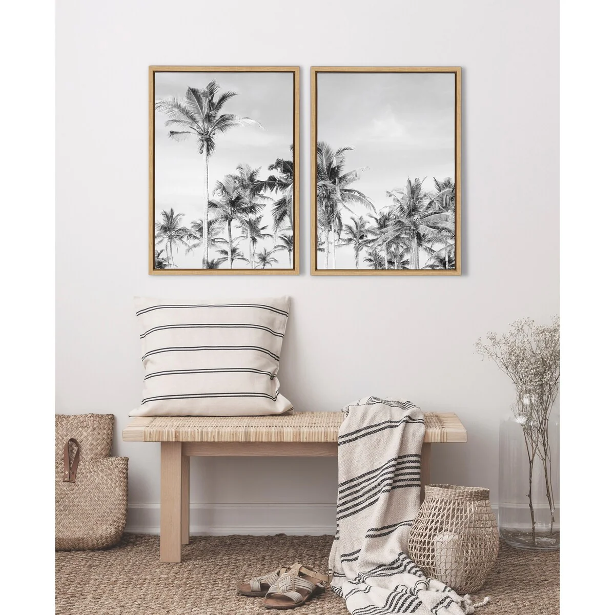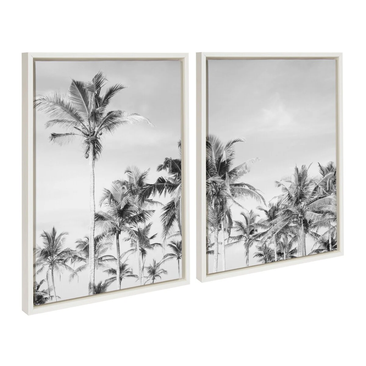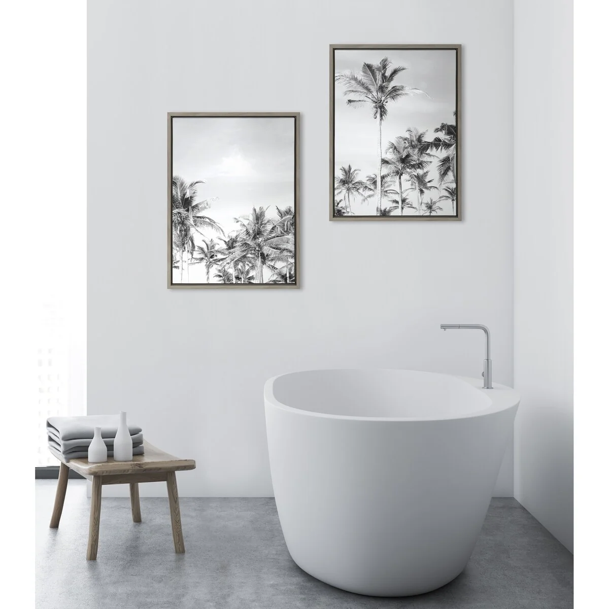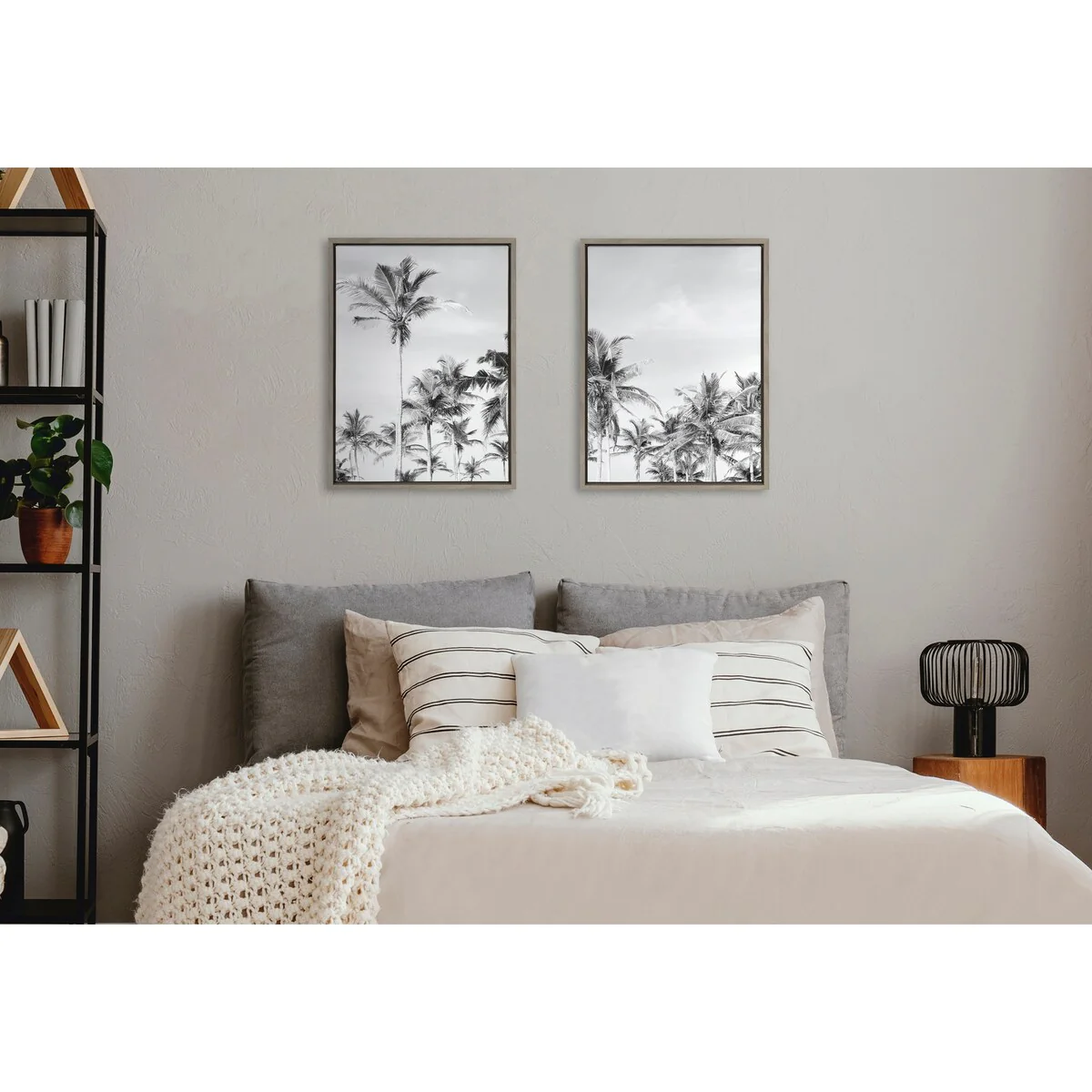 Reminisce about warm breezes, palm trees, and coastal beachscapes with this beautiful set of art. Framed in the USA in Waunakee, Wisconsin, this floating canvas art will be a pleasure to look at every day in your living room, bedroom, nursery, or any room in the home. Printed on gallery-wrapped canvas and framed with a lightweight polystyrene frame, this wall art has two hangers already attached to the MDF back for easy wall display. The outer dimensions of each frame are 24 inches tall by 18 inches wide by 1.63 inches deep. Print Names: 'Coastal Coconut Palm Tree Beach BW Left' and 'Coastal Coconut Palm Tree Beach BW Right'