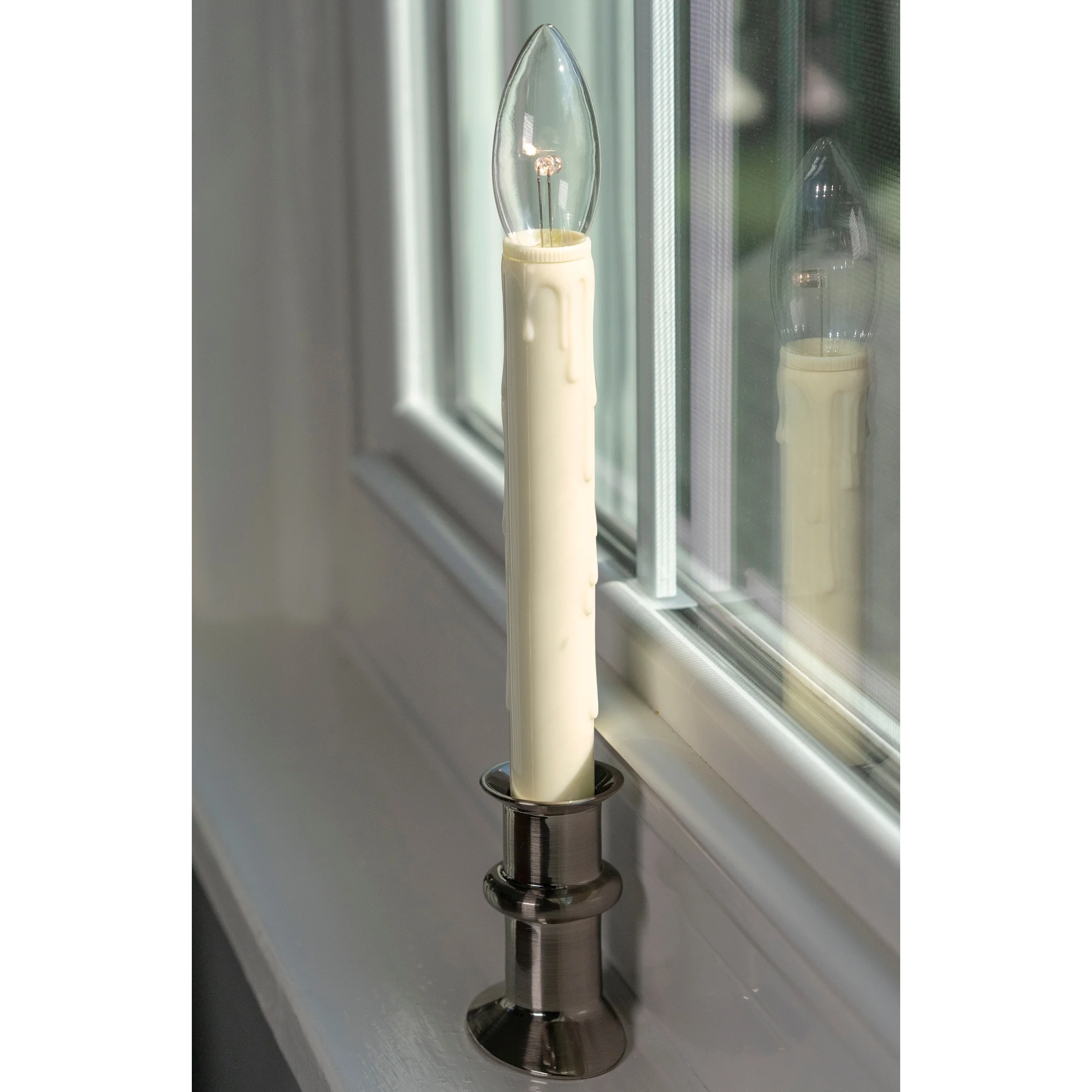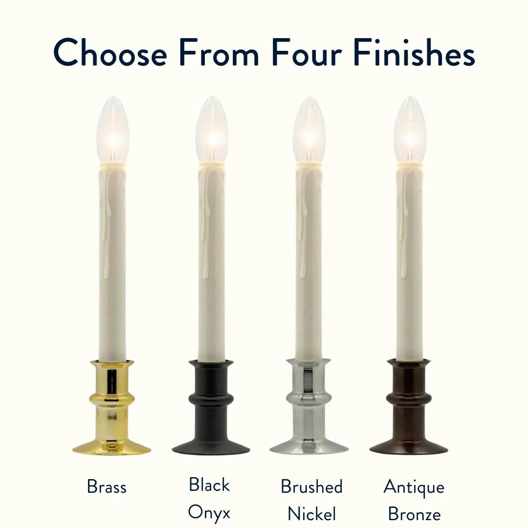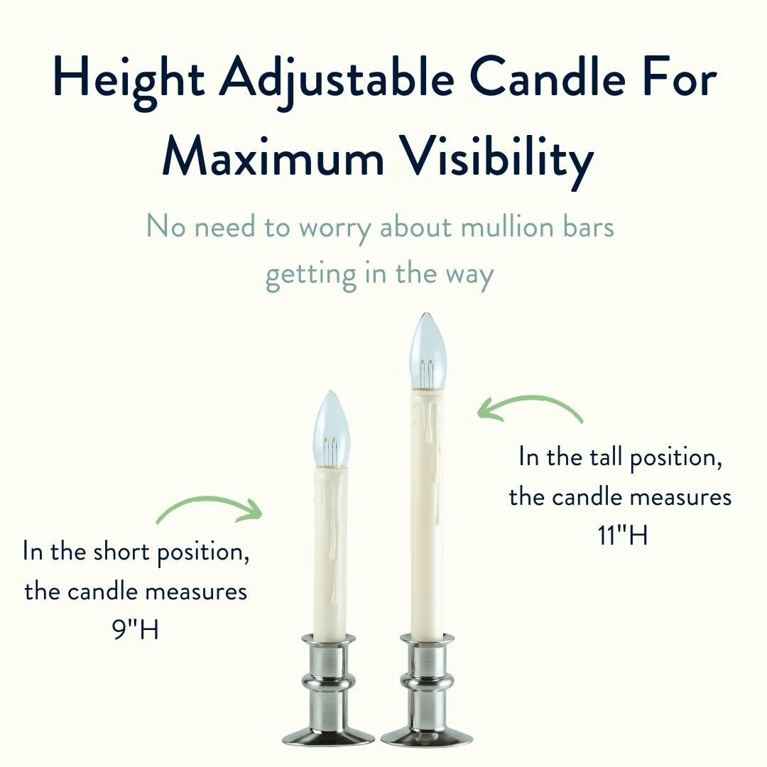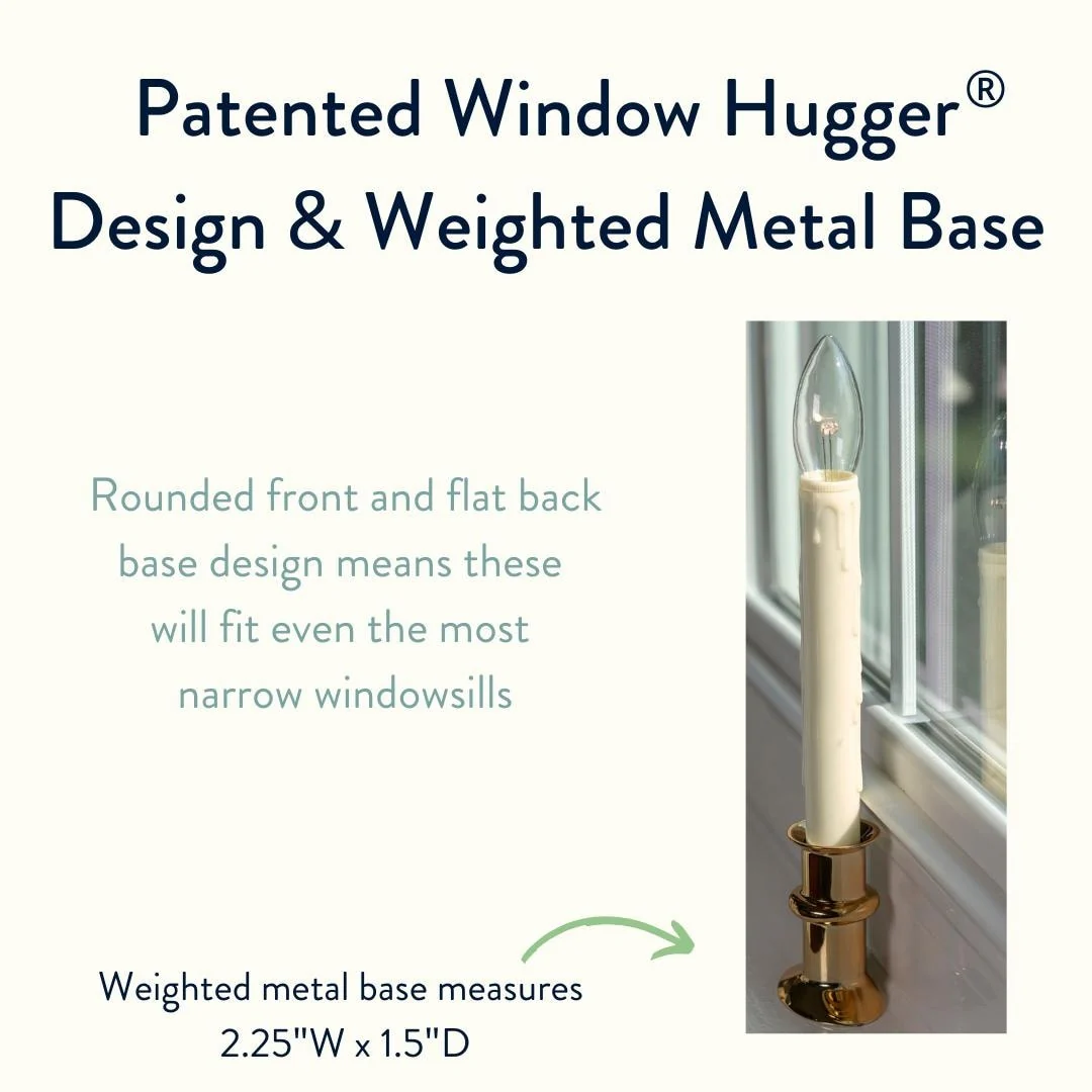 The Patented Bi Directional window candle with the LED Bulb that shines brightly towards the street and softer indoors now comes in a HUGGER base for your narrow windowsills. The bulb is still brighter than any cordless or plugin candle and still has a gentle warm white glow. The uniquely designed adjustable base still allows the candle to be raised or lowered for maximum street visibility. The candle can be as short as 8.5' or as tall as 10'. The HUGGER base is narrow (1.5' x 2.25') and hugs tight to the window. Four beautiful sturdy weighted metal base colors to choose from that will fit on all windowsills. The white taper is enhanced with the dripped wax look. With the remote control you can choose between a steady burn or a gentle twinkle and also choose between On/Off, 6,8, or 12 hours on the timer, which alleviates the need for a dawn/dusk sensor. Will last 30+ days on one set of batteries. 3 AA Batteries required (Not Included) Glass bulb life is over 10,000 hours. (set of 4 or a set of 2)