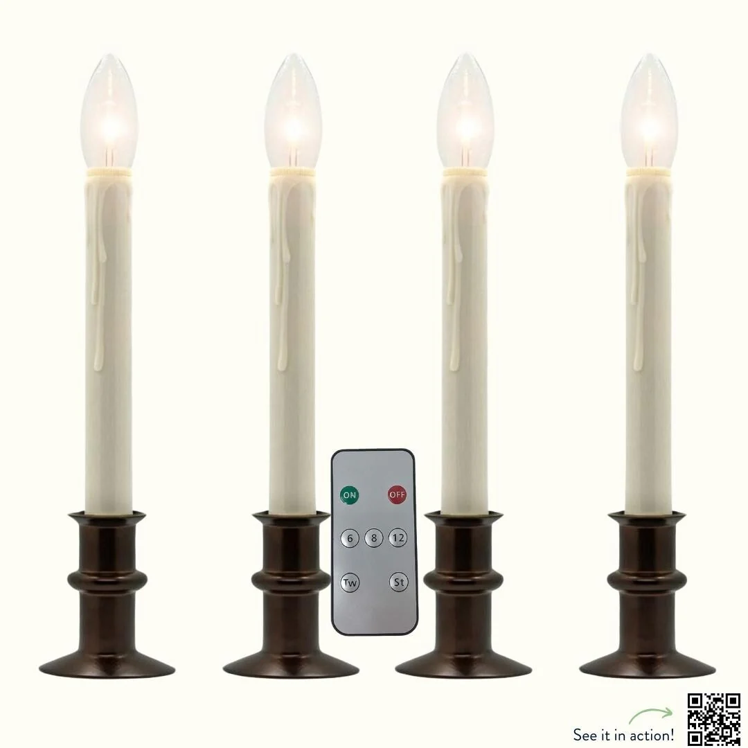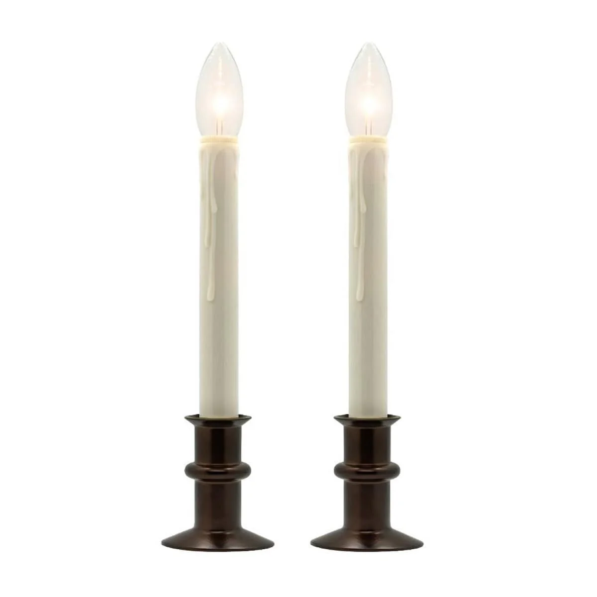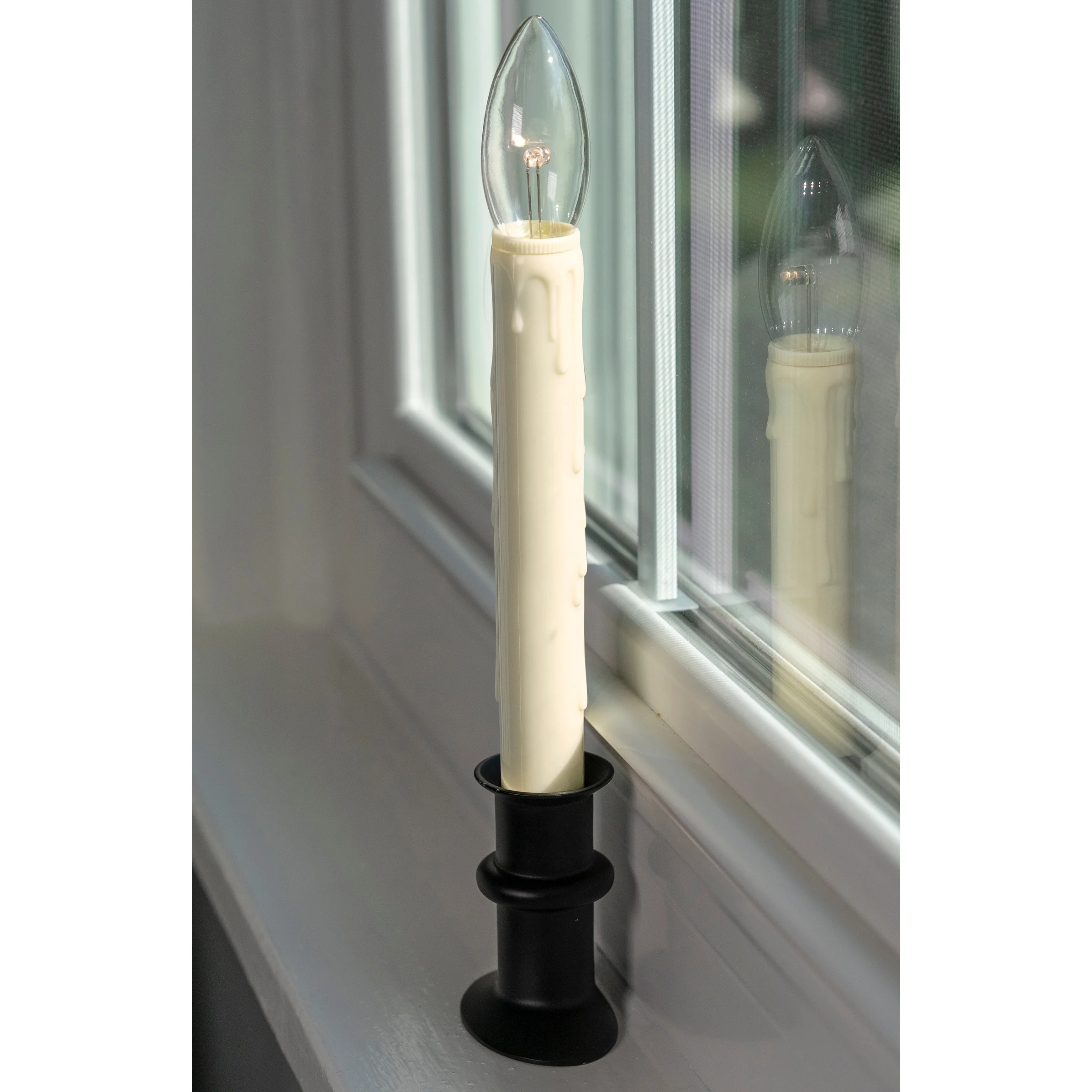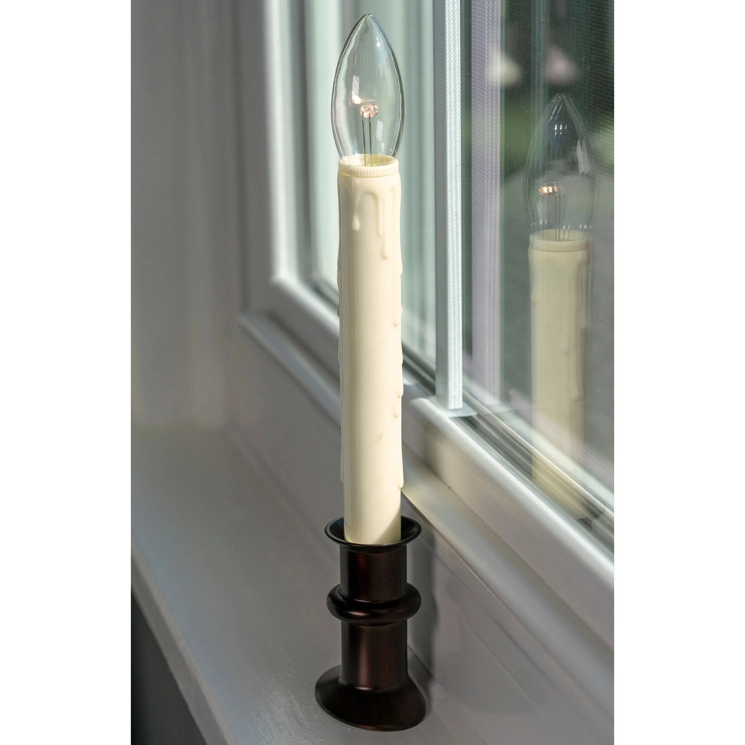 The Patented Bi Directional window candle with the LED Bulb that shines brightly towards the street and softer indoors now comes in a HUGGER base for your narrow windowsills. The bulb is still brighter than any cordless or plugin candle and still has a gentle warm white glow. The uniquely designed adjustable base still allows the candle to be raised or lowered for maximum street visibility. The candle can be as short as 8.5' or as tall as 10'. The HUGGER base is narrow (1.5' x 2.25') and hugs tight to the window. Four beautiful sturdy weighted metal base colors to choose from that will fit on all windowsills. The white taper is enhanced with the dripped wax look. With the remote control you can choose between a steady burn or a gentle twinkle and also choose between On/Off, 6,8, or 12 hours on the timer, which alleviates the need for a dawn/dusk sensor. Will last 30+ days on one set of batteries. 3 AA Batteries required (Not Included) Glass bulb life is over 10,000 hours. (set of 4 or a set of 2)