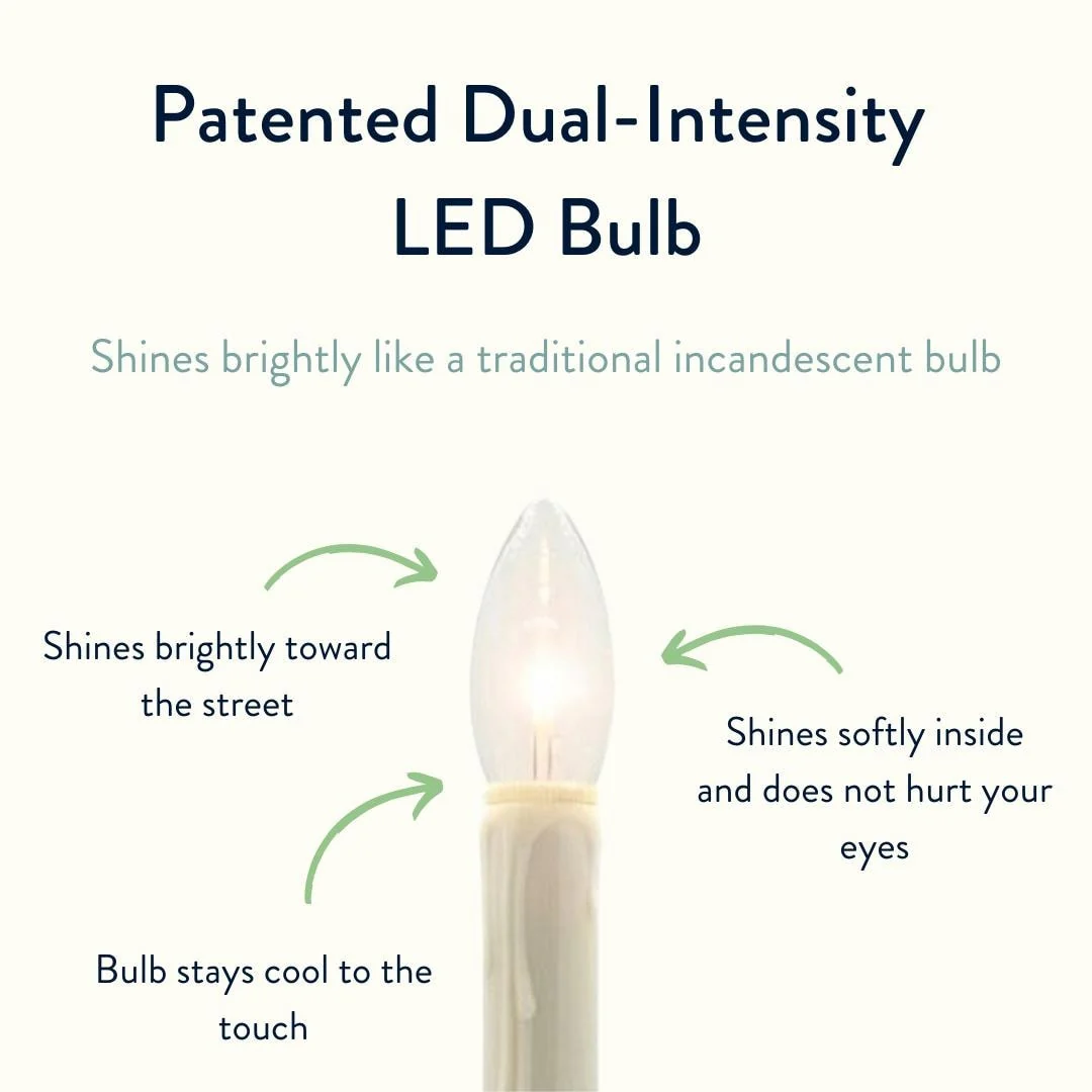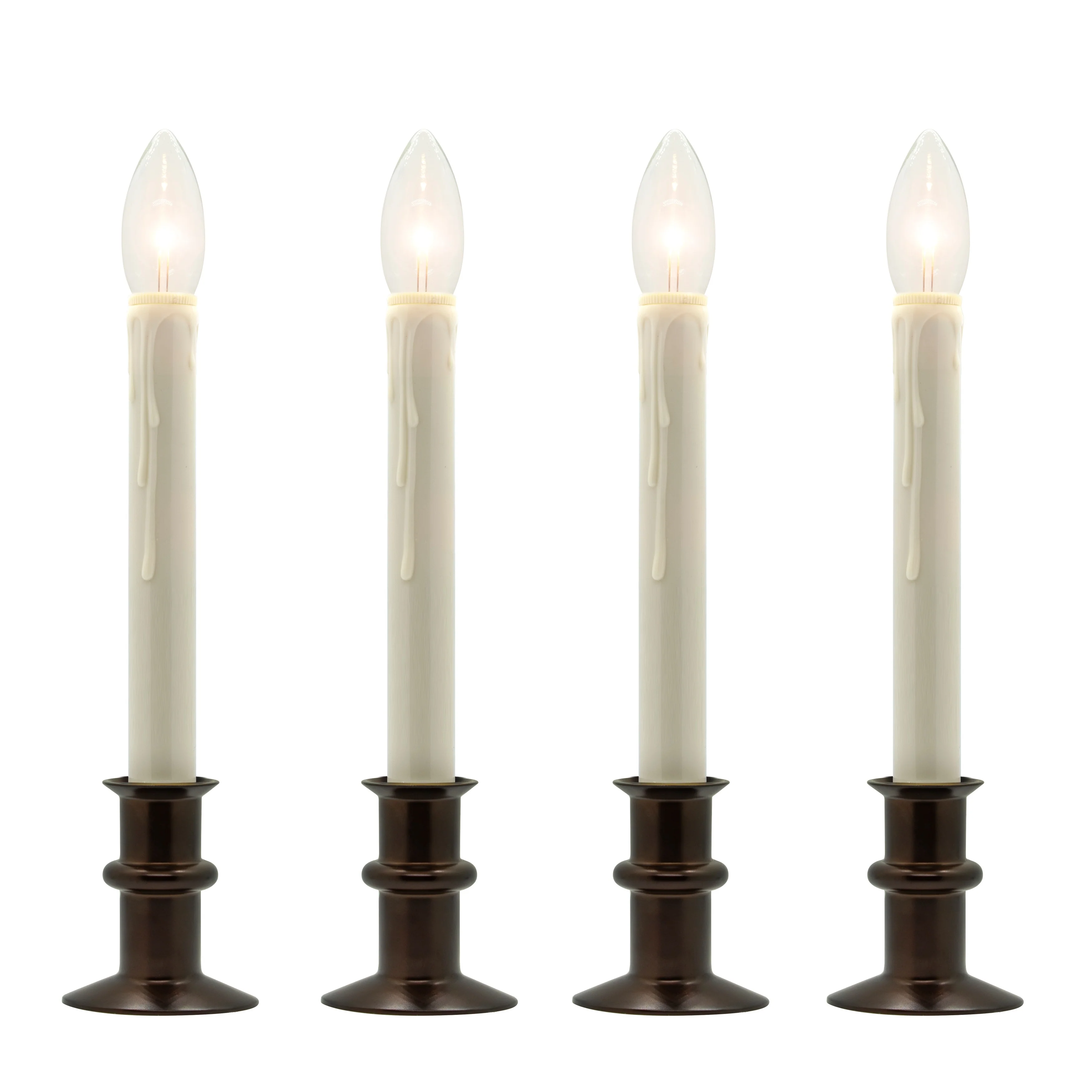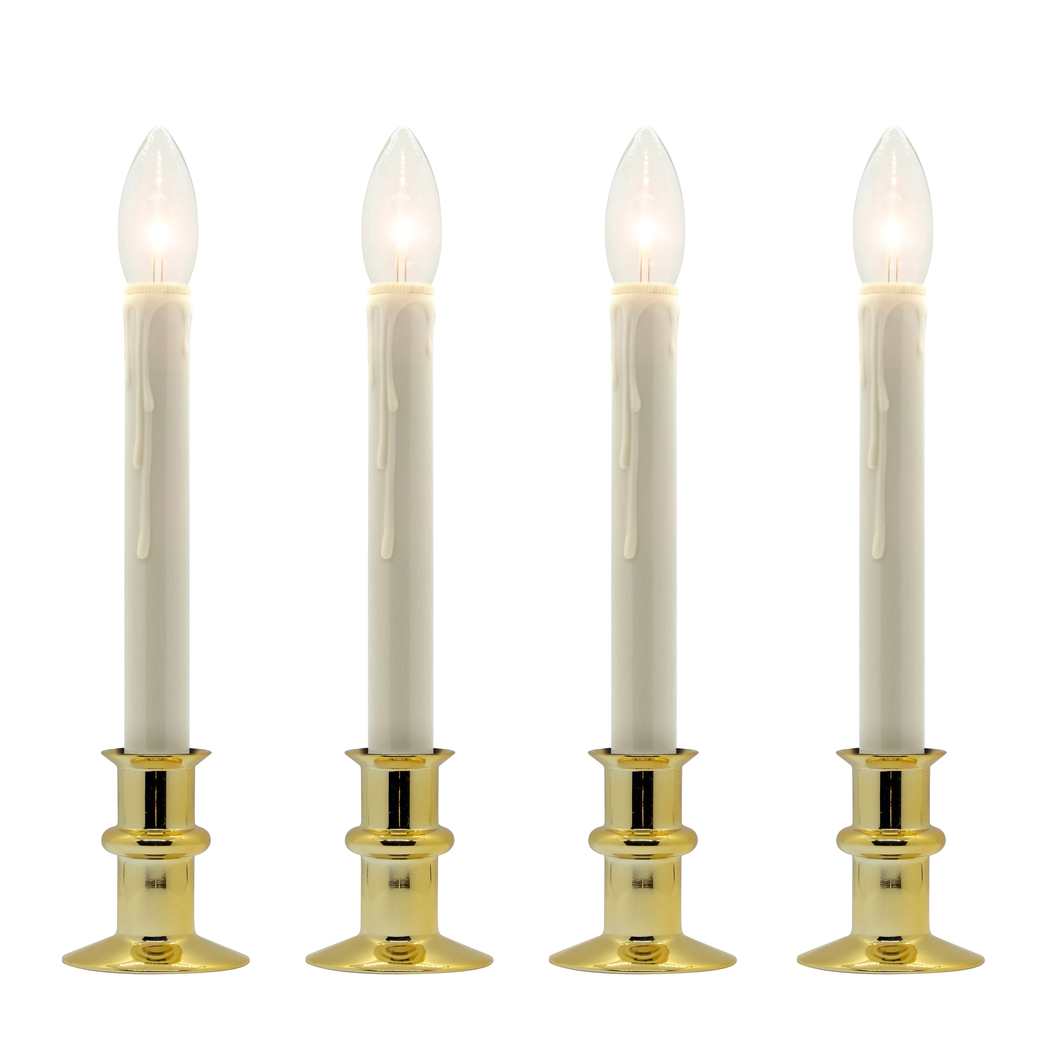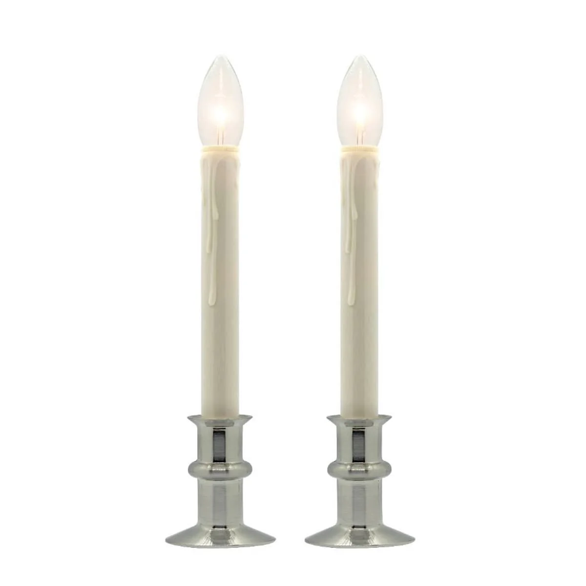 The Patented Bi Directional window candle with the LED Bulb that shines brightly towards the street and softer indoors now comes in a HUGGER base for your narrow windowsills. The bulb is still brighter than any cordless or plugin candle and still has a gentle warm white glow. The uniquely designed adjustable base still allows the candle to be raised or lowered for maximum street visibility. The candle can be as short as 8.5' or as tall as 10'. The HUGGER base is narrow (1.5' x 2.25') and hugs tight to the window. Four beautiful sturdy weighted metal base colors to choose from that will fit on all windowsills. The white taper is enhanced with the dripped wax look. With the remote control you can choose between a steady burn or a gentle twinkle and also choose between On/Off, 6,8, or 12 hours on the timer, which alleviates the need for a dawn/dusk sensor. Will last 30+ days on one set of batteries. 3 AA Batteries required (Not Included) Glass bulb life is over 10,000 hours. (set of 4 or a set of 2)
