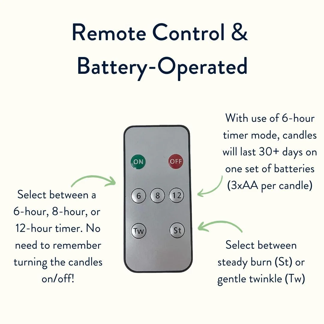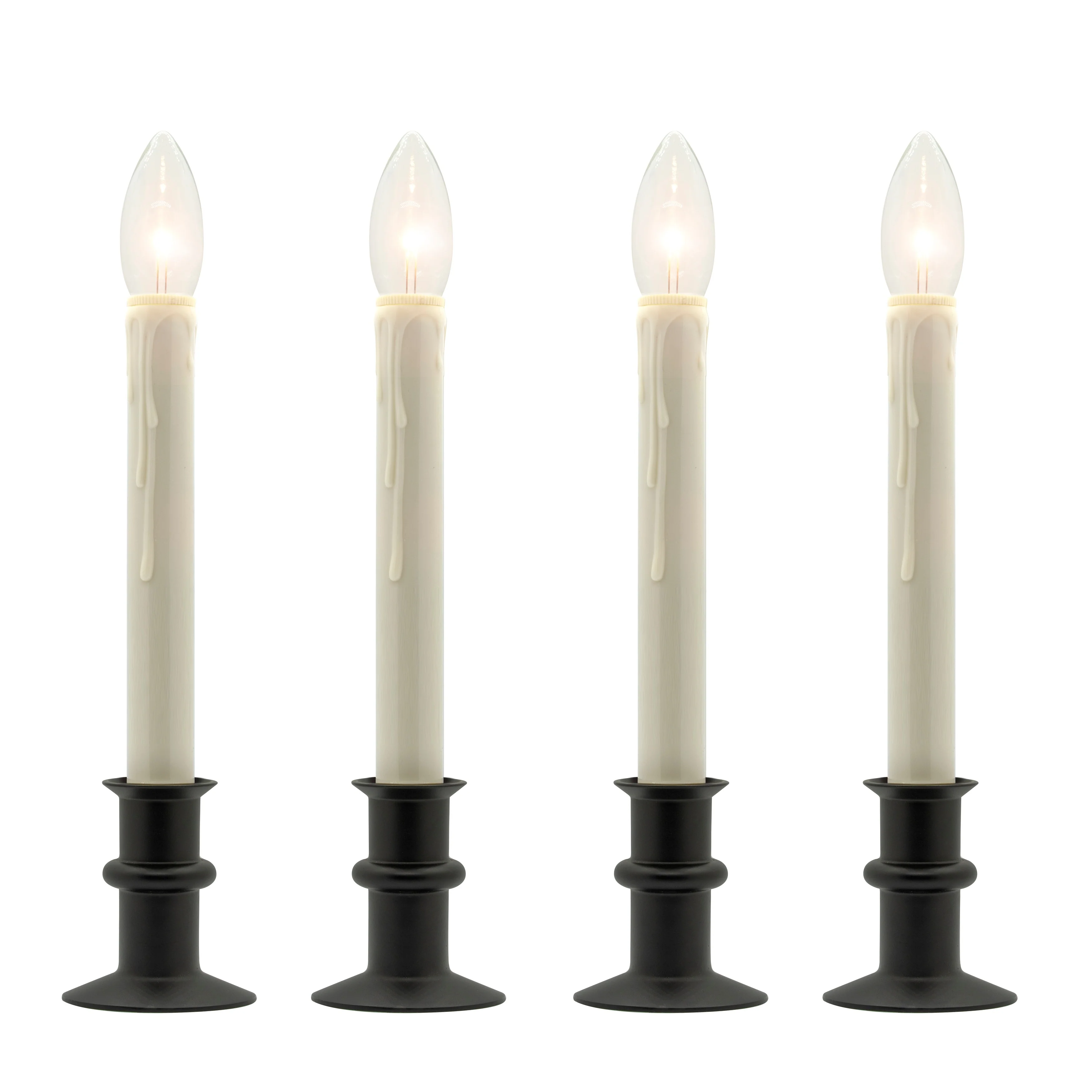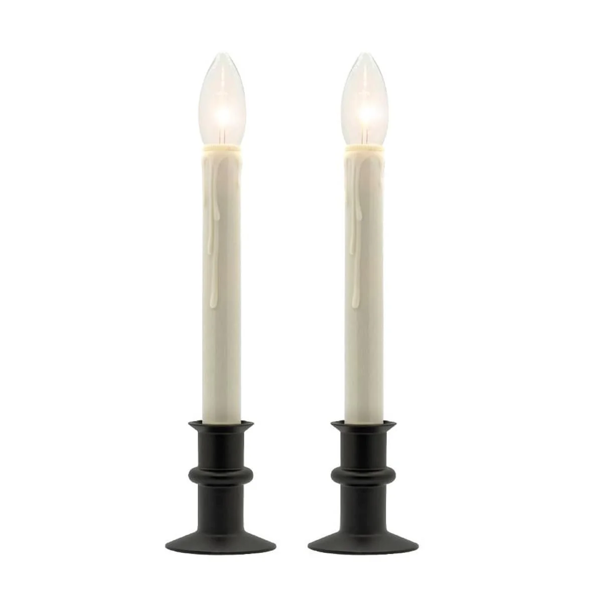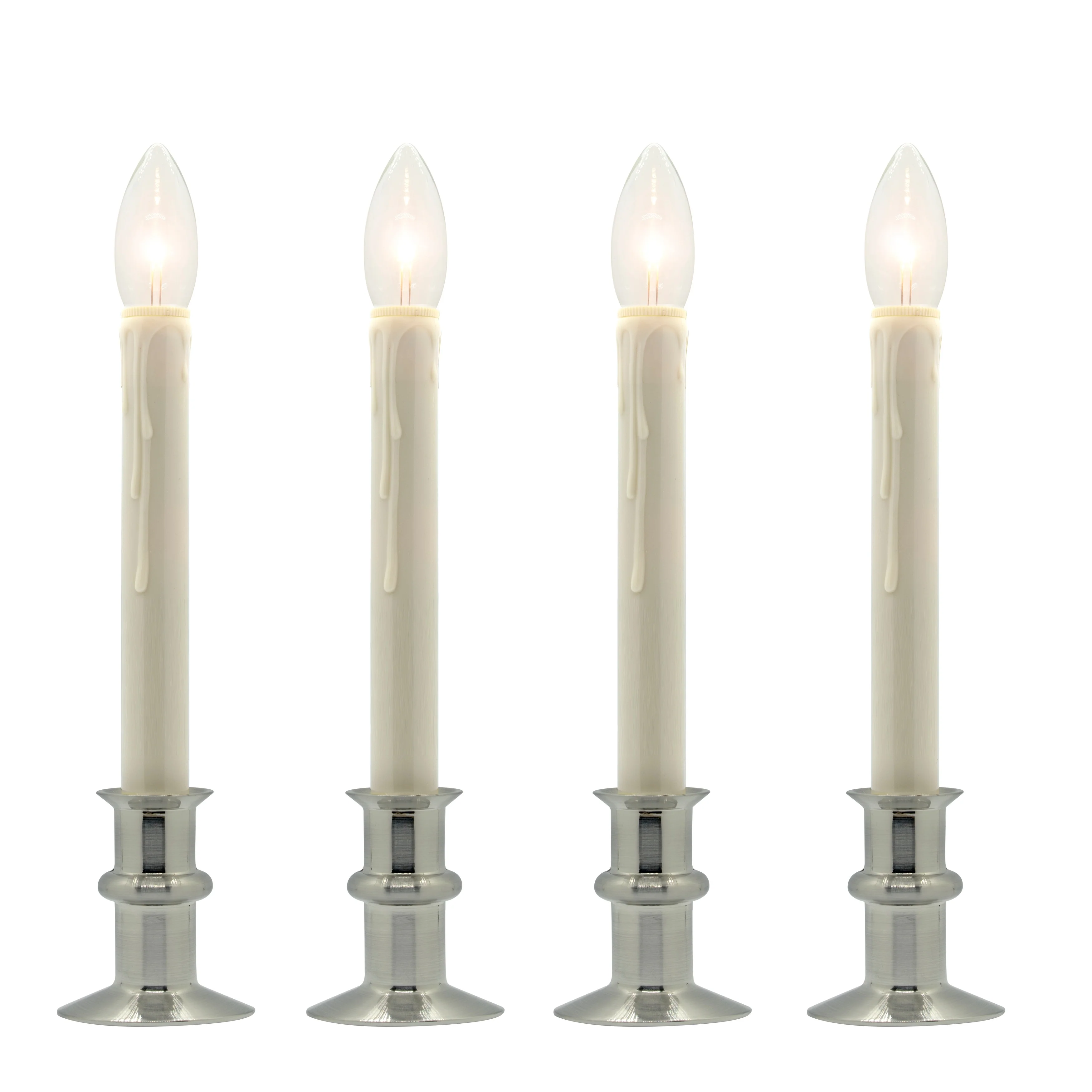 The Patented Bi Directional window candle with the LED Bulb that shines brightly towards the street and softer indoors now comes in a HUGGER base for your narrow windowsills. The bulb is still brighter than any cordless or plugin candle and still has a gentle warm white glow. The uniquely designed adjustable base still allows the candle to be raised or lowered for maximum street visibility. The candle can be as short as 8.5' or as tall as 10'. The HUGGER base is narrow (1.5' x 2.25') and hugs tight to the window. Four beautiful sturdy weighted metal base colors to choose from that will fit on all windowsills. The white taper is enhanced with the dripped wax look. With the remote control you can choose between a steady burn or a gentle twinkle and also choose between On/Off, 6,8, or 12 hours on the timer, which alleviates the need for a dawn/dusk sensor. Will last 30+ days on one set of batteries. 3 AA Batteries required (Not Included) Glass bulb life is over 10,000 hours. (set of 4 or a set of 2)