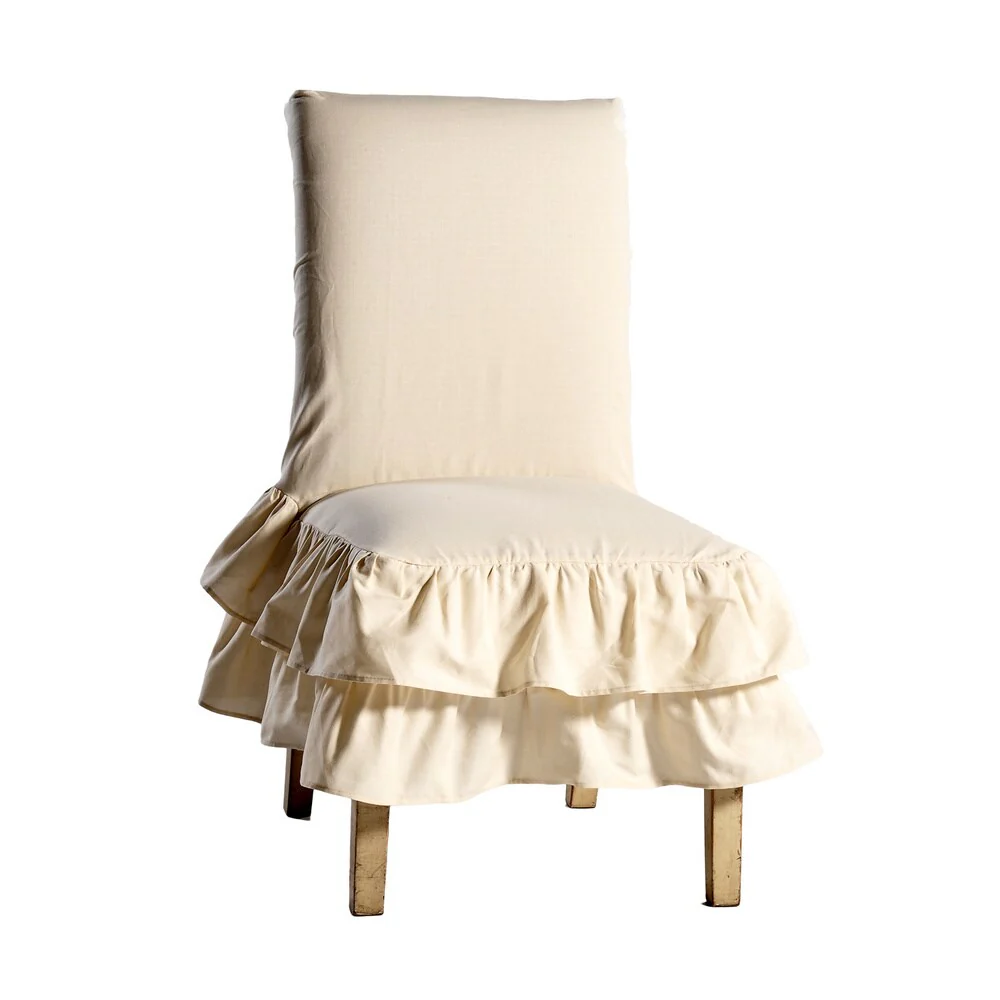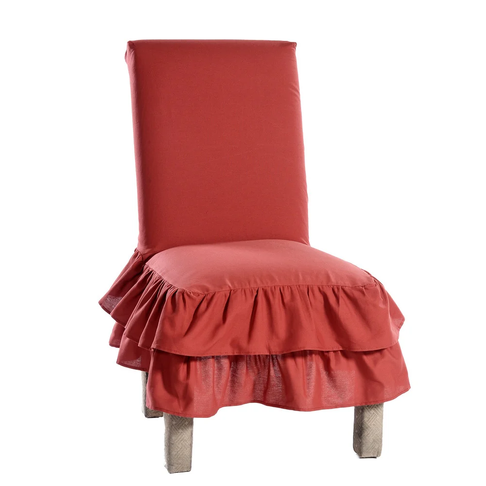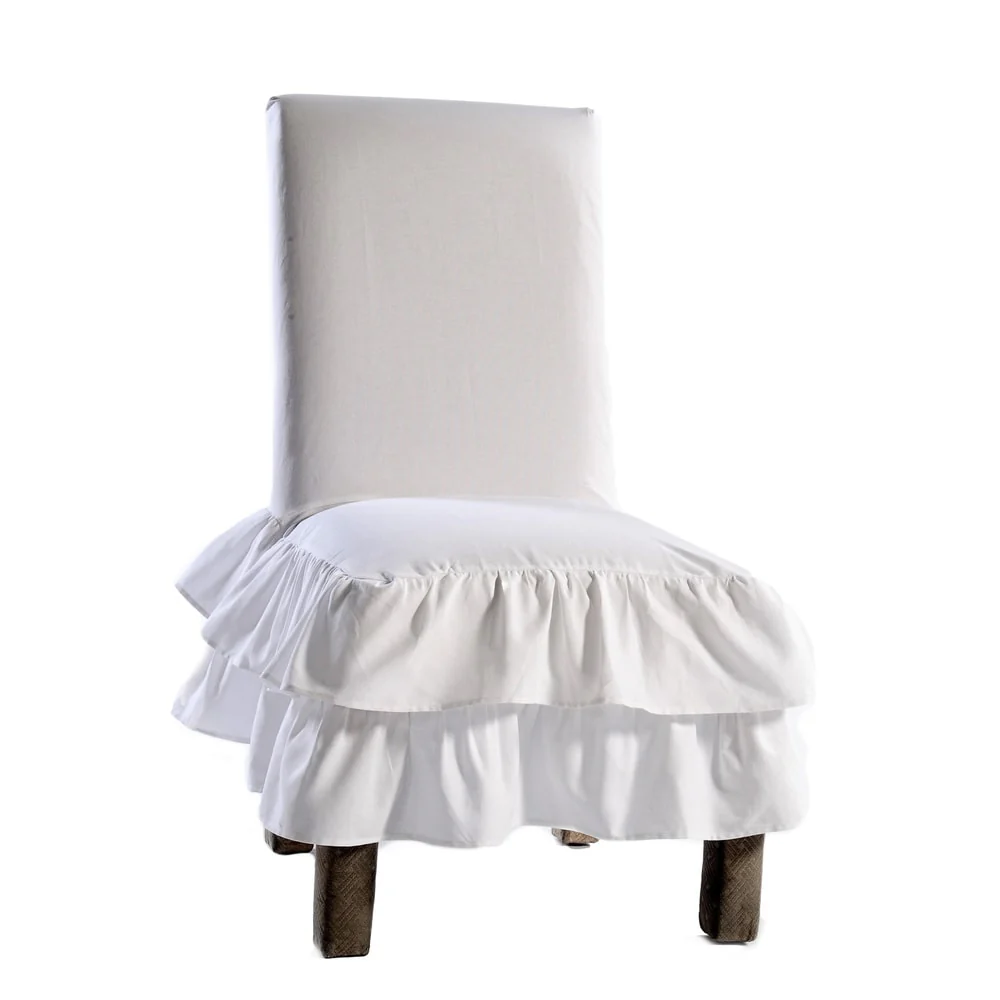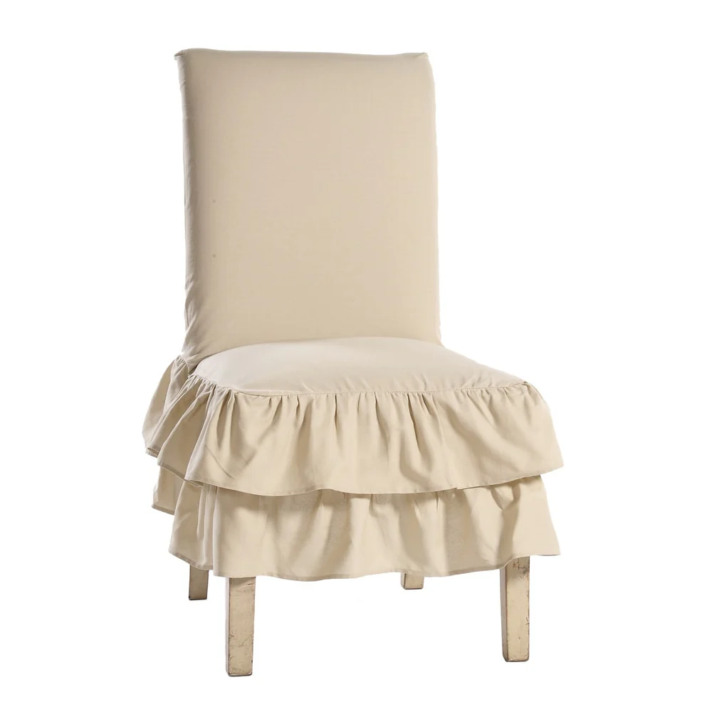 Transform your standard dining chair into a charming country-inspired piece with this Cotton Tiered Ruffled Dining Chair Slipcover. Made from 100% cotton duck fabric, this cover boasts a thick and durable texture that's easy to clean. The two-tiered ruffled hem and bowtie on the back add a touch of elegance to your dining space. With natural, khaki, red, or white color options, this slipcover fits a chair measuring 21 inches long x 20 inches wide x 40 inches high.