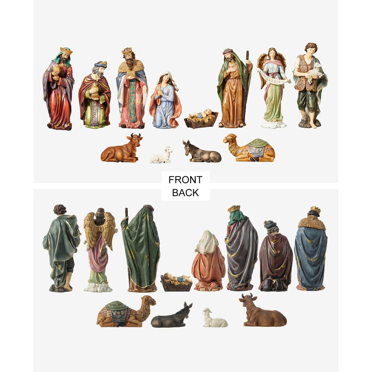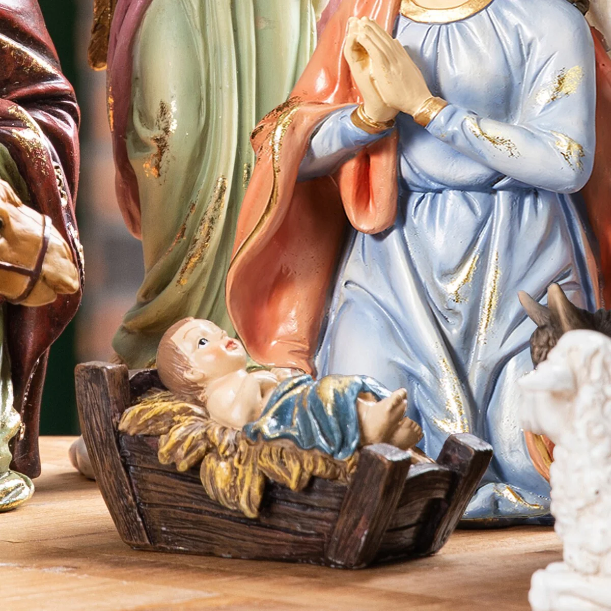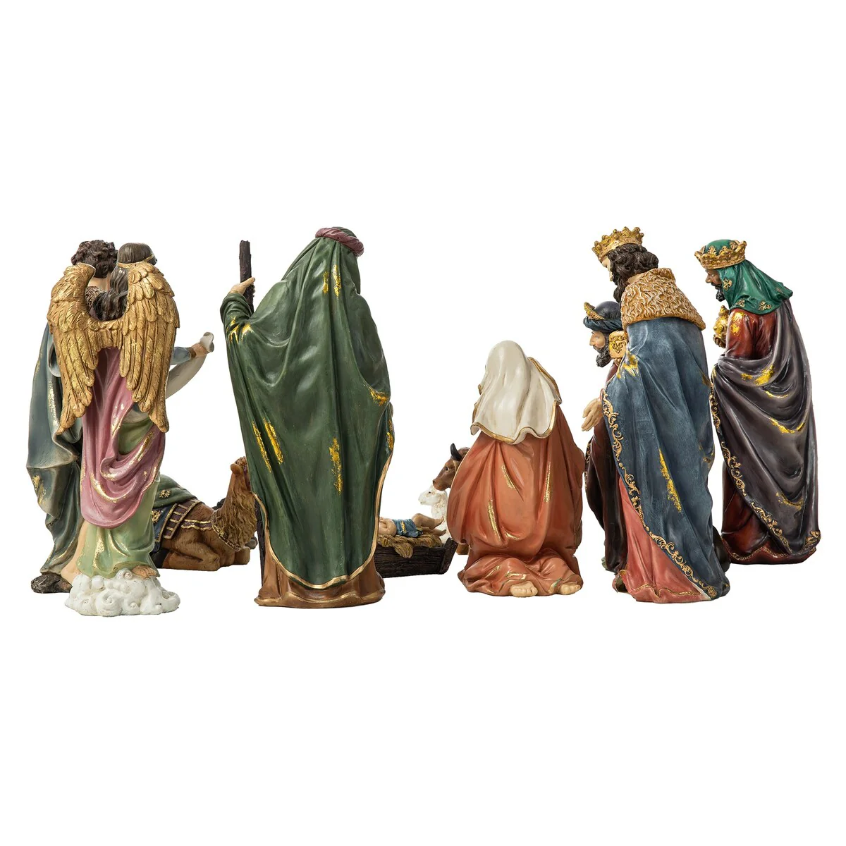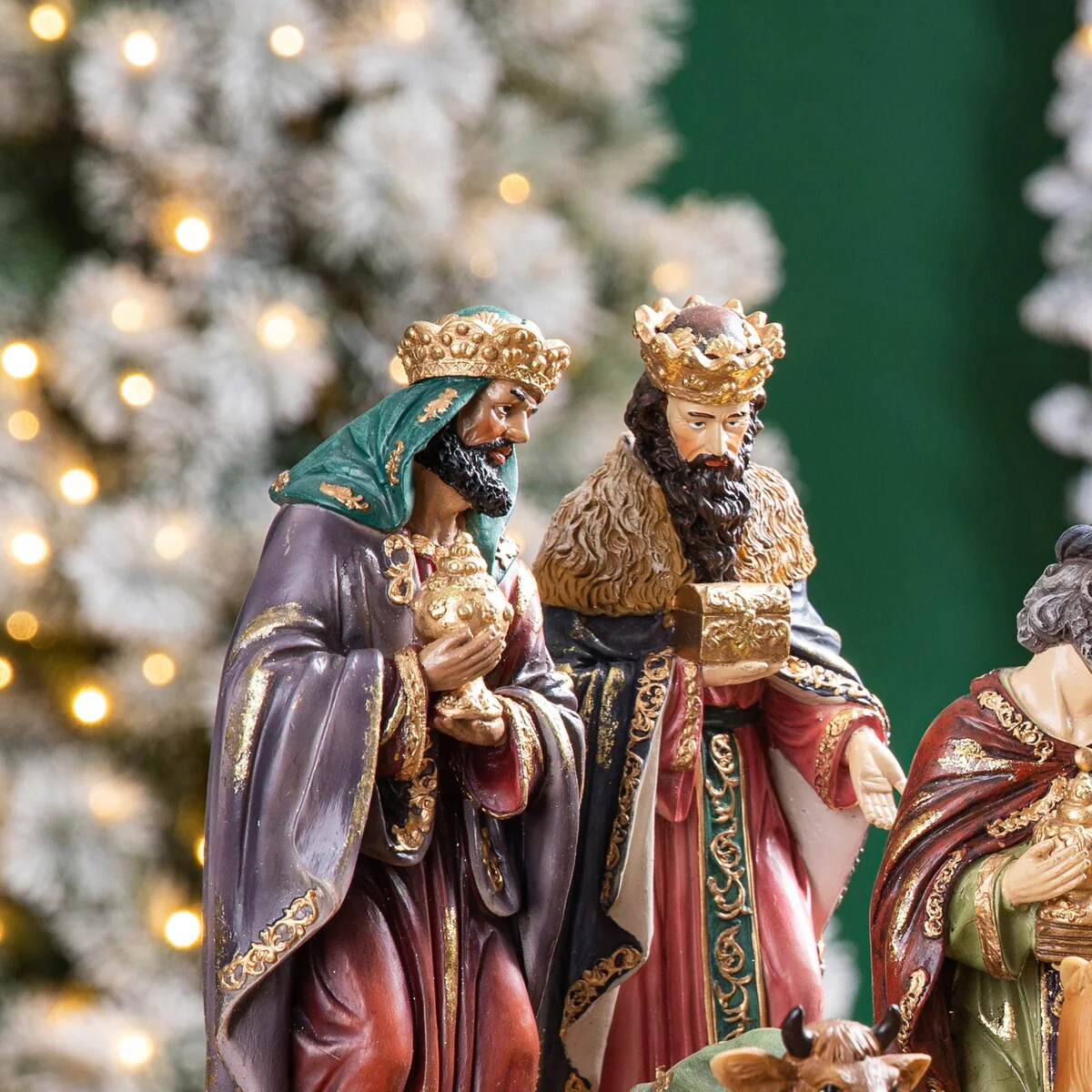 - Nativity set of 12 pieces, including the Holy Family, the Three Wise Men, a shepherd holding a lamb, and an angel