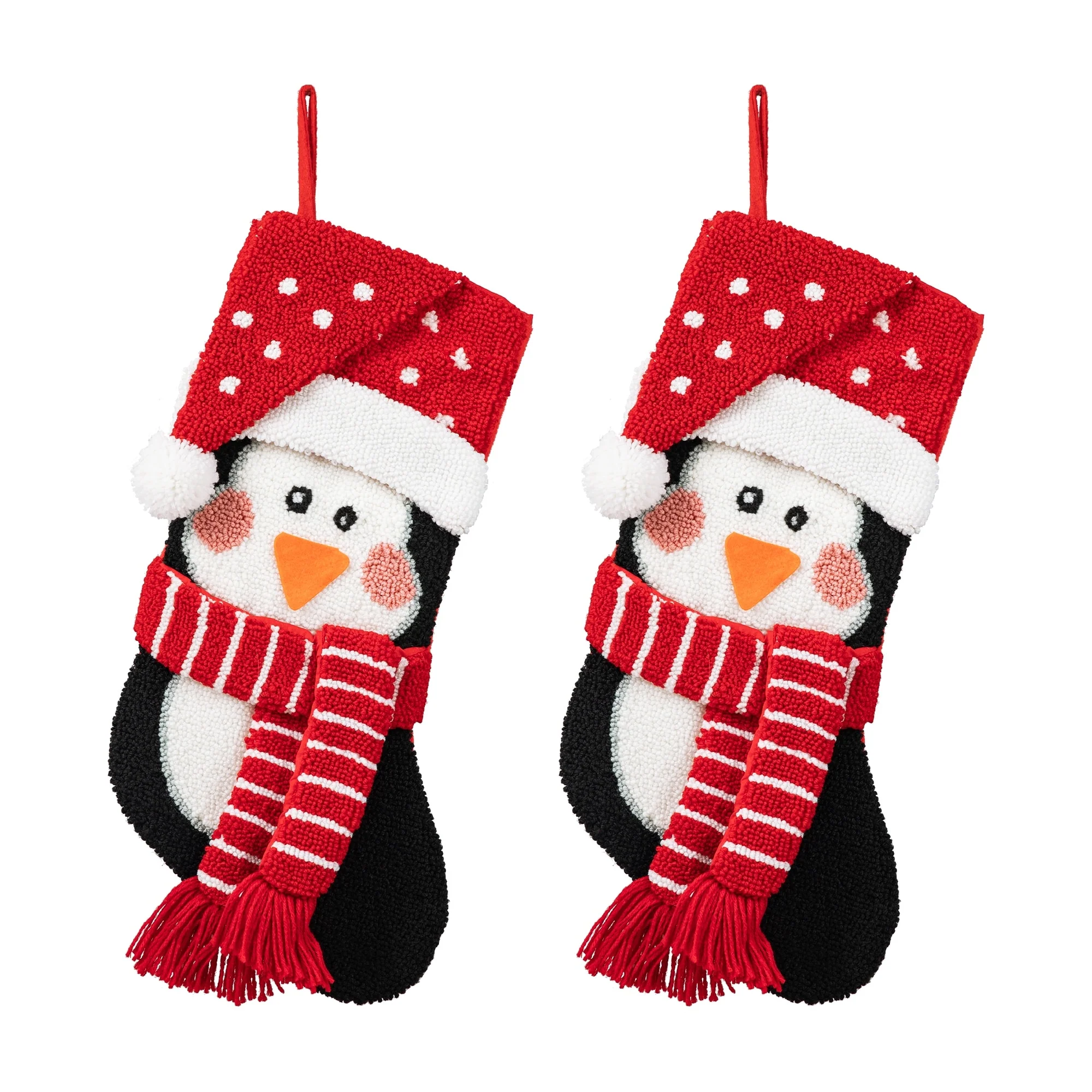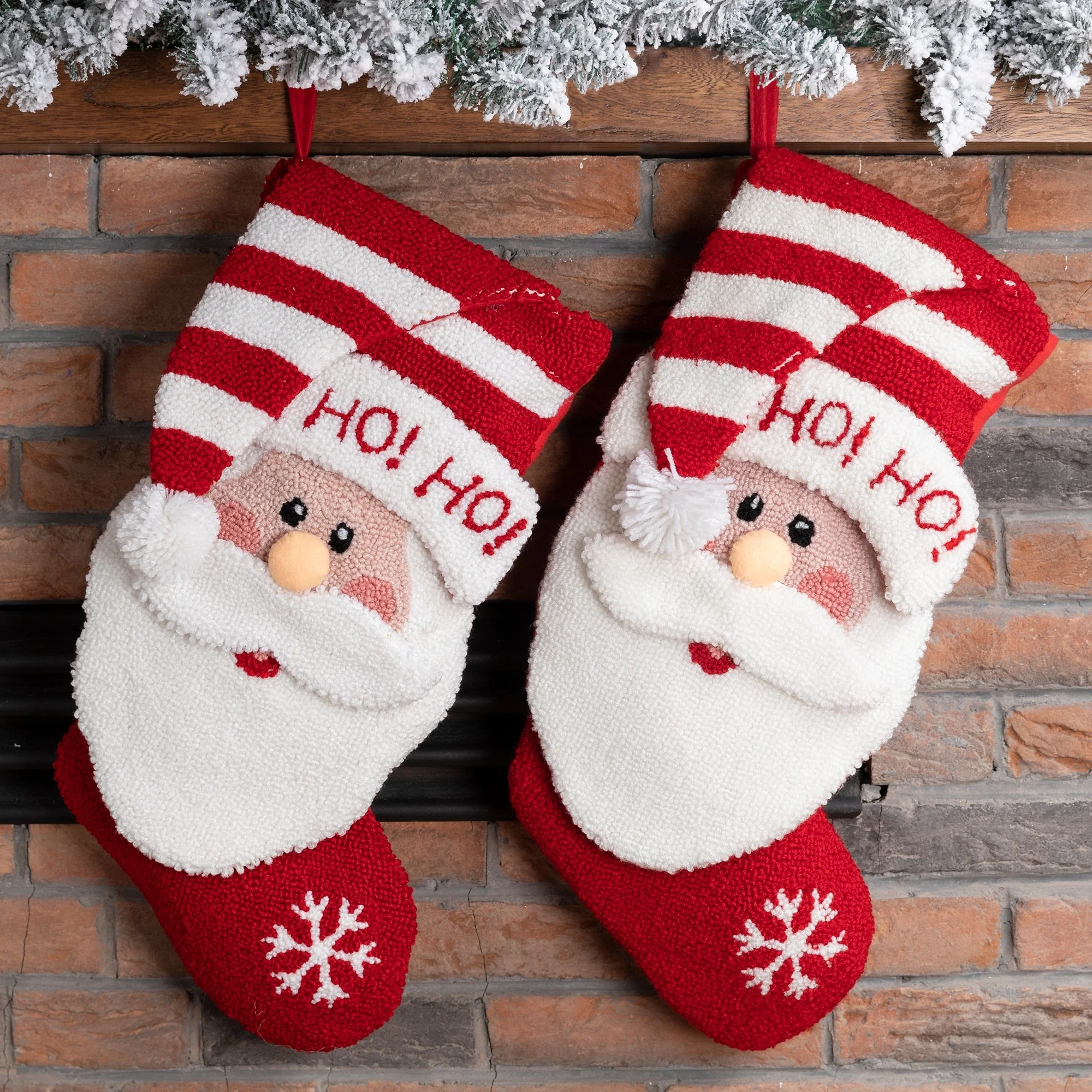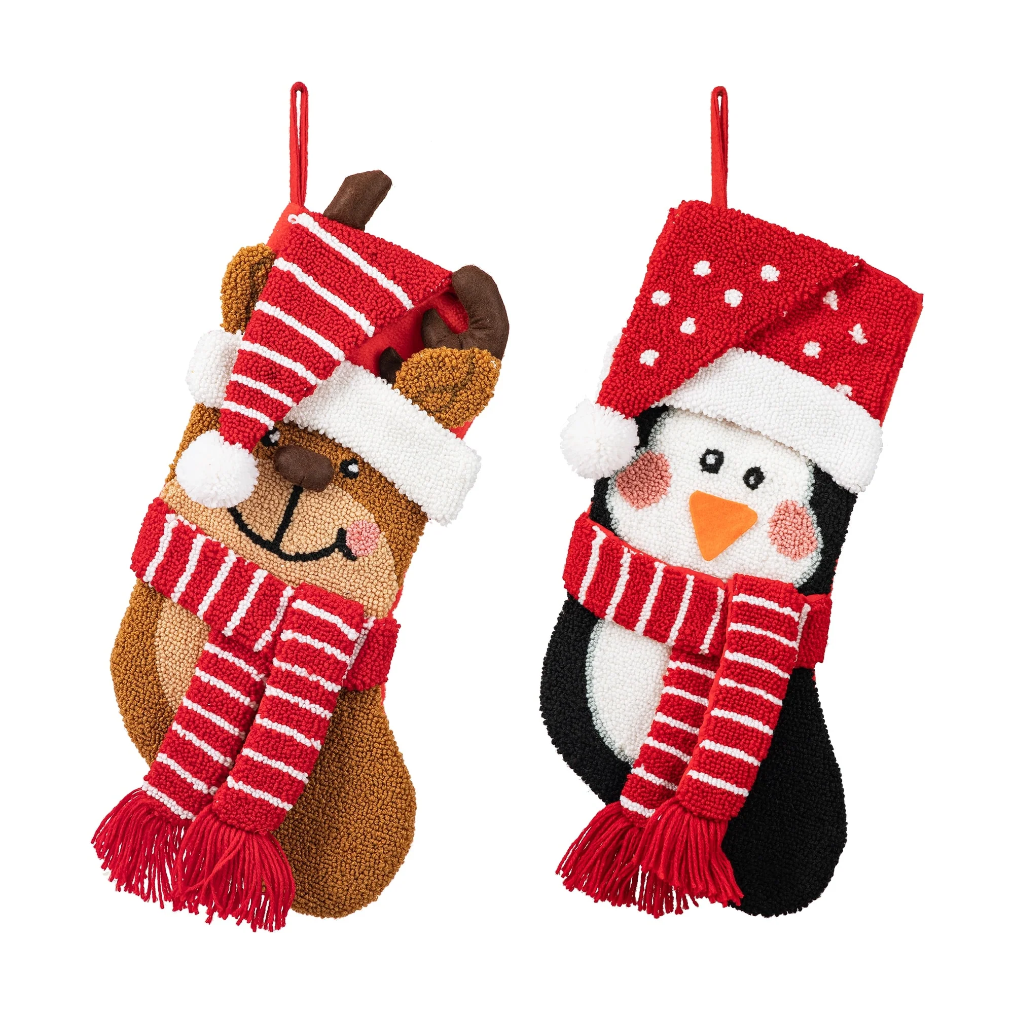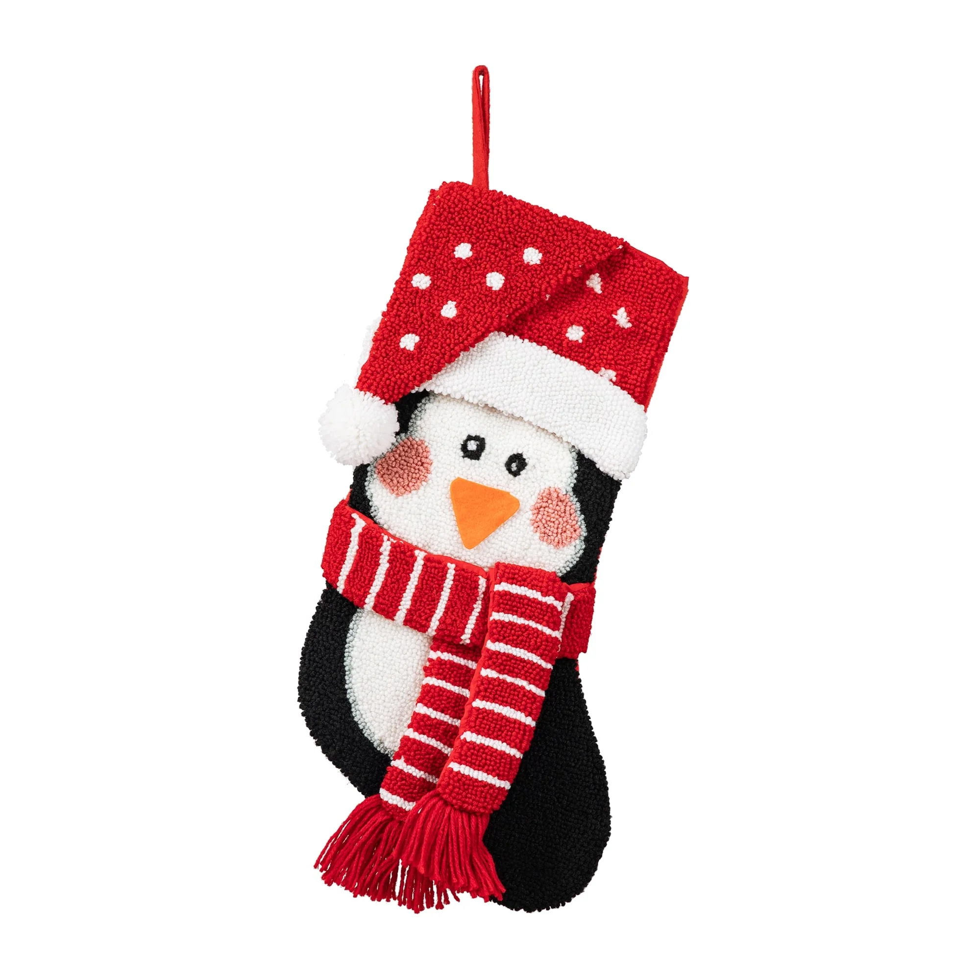 Glitzhome Christmas Hooked Stocking is made from 100% Acrylic Fiber front and 100% Polyester back. The fabrics are very durable. The material provides soft and smooth touch, and can hold more candies and gifts. The front is 100% handmade whimsical design and features a 3D Santa, reindeer or penguin surrounded by festive details. Decorative top border, felt hanging loop, and holiday accents. Detailed knitting and generous embellishments are sure to enhance any type of holiday decorating theme. As cozy as a winter sweater, our stockings add a warm touch to the mantel. Its graphics and colors give a very Christmas feel that are ideal for depicting the true nature of the season. The Christmas Stocking can be hanged on Christmas trees, fireplaces with the loop. Work perfectly for candy and gift pouch.Different combinations meet your different needs. You're immediately put into a festive mood.