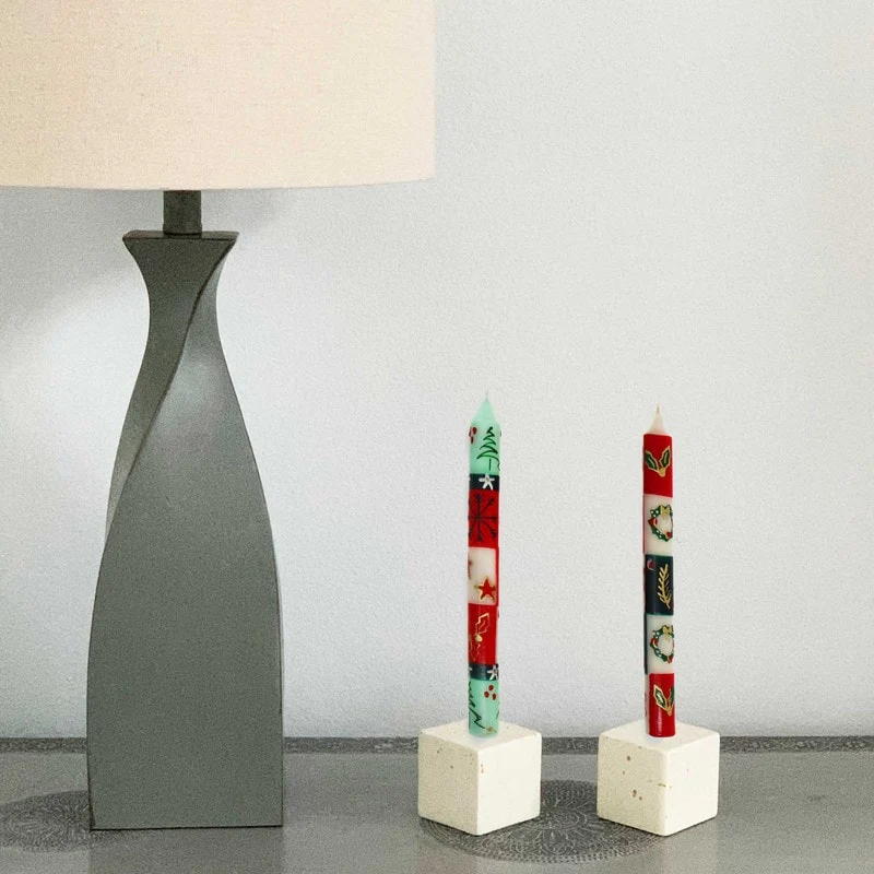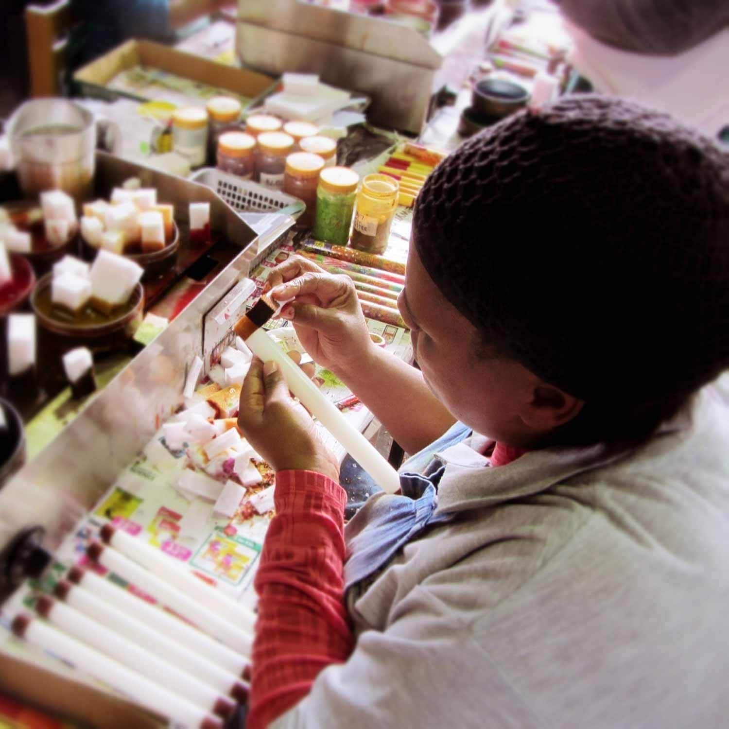 - Colors: Each candle is hand poured and hand painted by South African artisans with years of experience. After the candles are poured, they are handed off to the special background painters, who paint the entire wax candle with a base color that sets the tone for the design work that comes next. Masterful artists then paint the designs on each piece. It is truly exciting to watch the lightening-fast strokes of the paintbrushes transform what was molten wax into gorgeously colorful, individualized works of art!