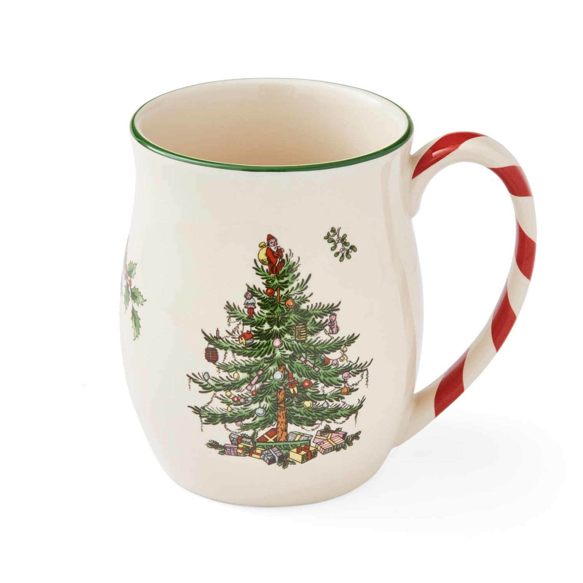 Spode Christmas Tree 14 oz Holiday Mugs (Set of 4) - Festive Coffee Mugs with Peppermint Candy Cane Handle, Stoneware Christmas Mugs Ideal for Hot Cocoa - Holiday Tea Mugs, Winter Beverages - New