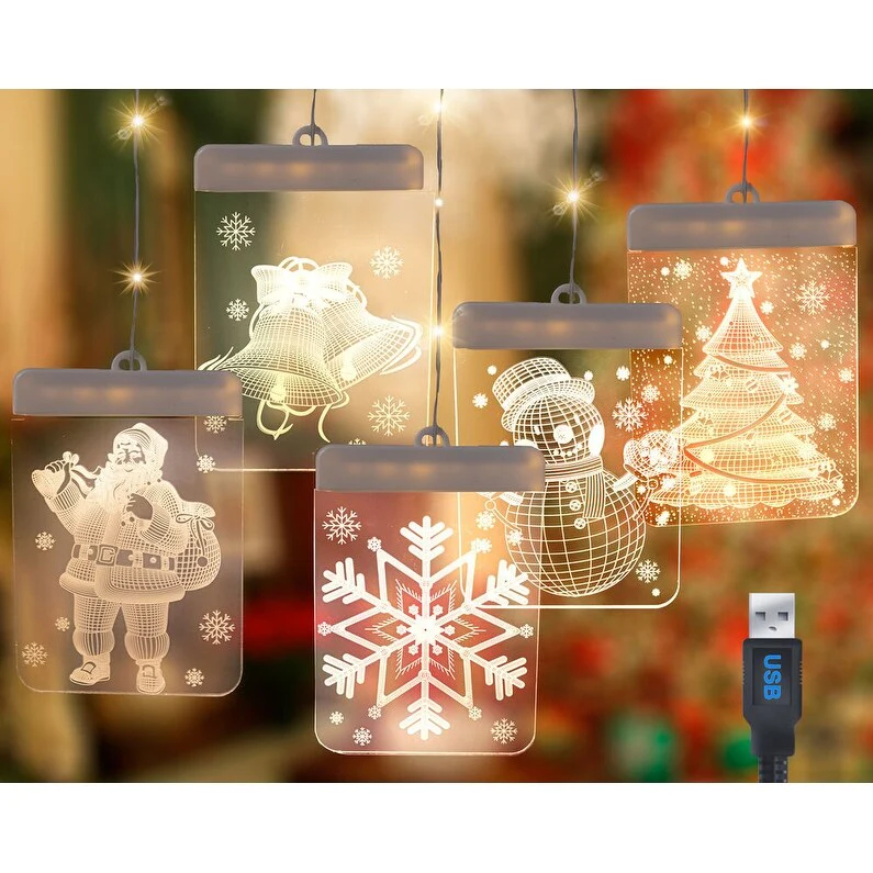 These attractive 3D LEDs Christmas curtain lights with its gorgeous 3D light effect are perfect for your home and adds some holiday cheer to your decor. These translucent plates create a 3D see through effect that can be hung or attached multiple different ways. The hanging loop is perfect for Christmas Tree ornament hanging. The included wall hooks allows almost instant placement on walls in different configurations. Great for placing about windows and letting then twinkle at night. Perfect for stocking stuffers, Christmas Tree hanging ornaments, windows, and patio. The LED's will last a lifetime and are energy efficient. They are USB powered so they are safe and allows you to power them through multiple different methods. Such as wall sockets, power banks, computers and the like. 5 different 3D holiday design are included with each purchase which are Santa Claus, snowman, snowflake, Christmas tree shape, & jingle bells. Make your Christmas look more colorful.