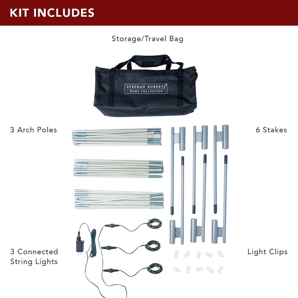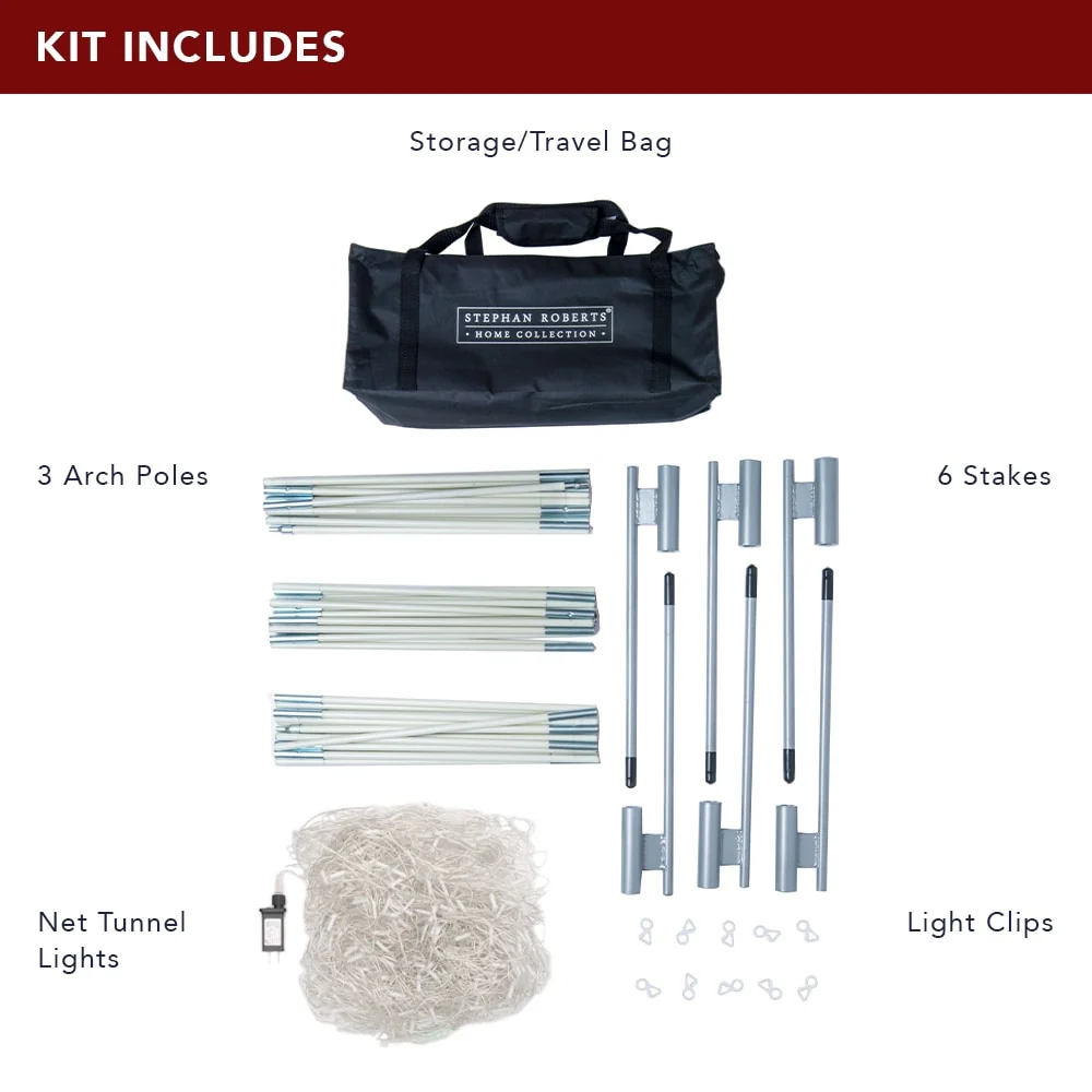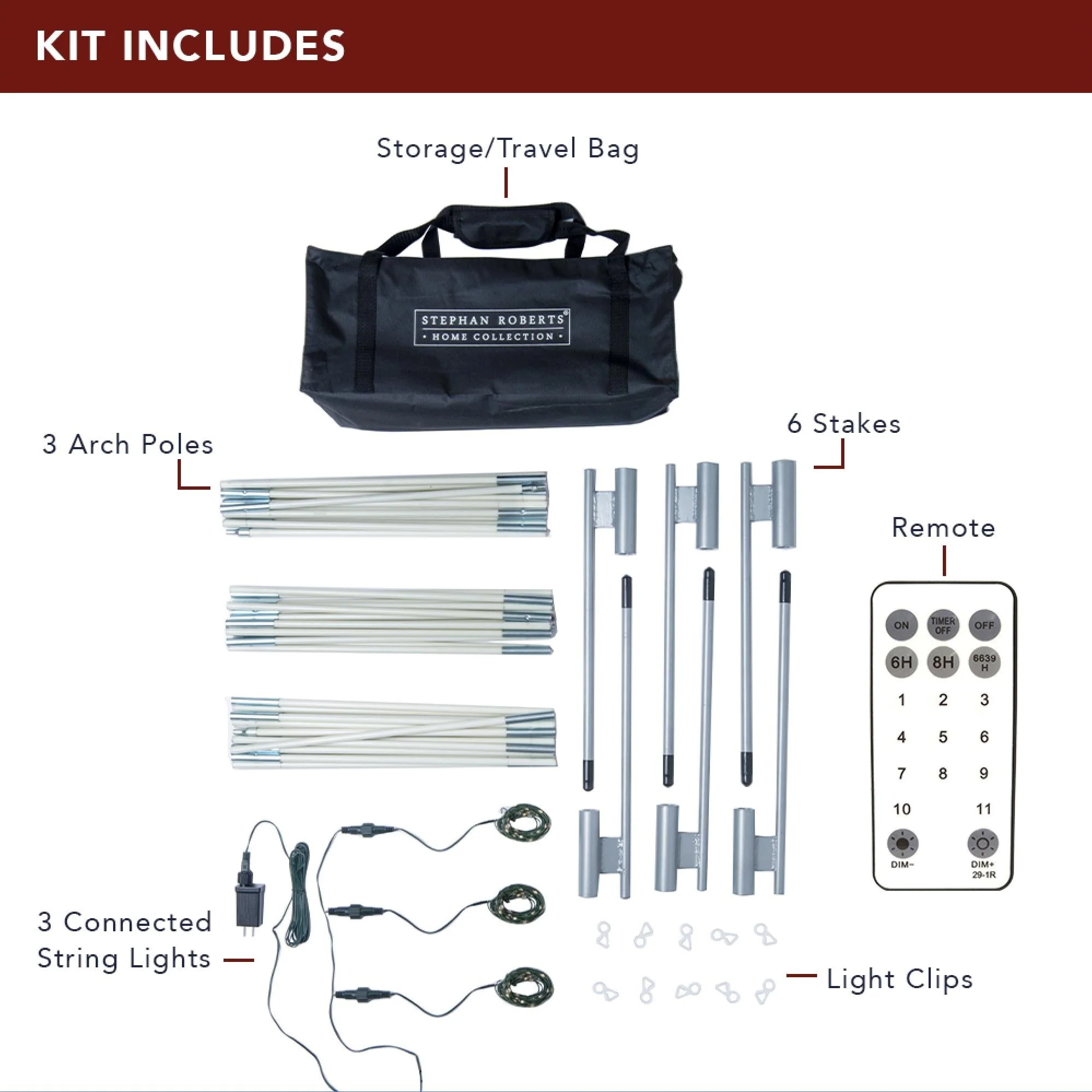Kit Includes: 3x Poles, 6x ground Spikes, 40x Light Clips, 1x Storage Bag