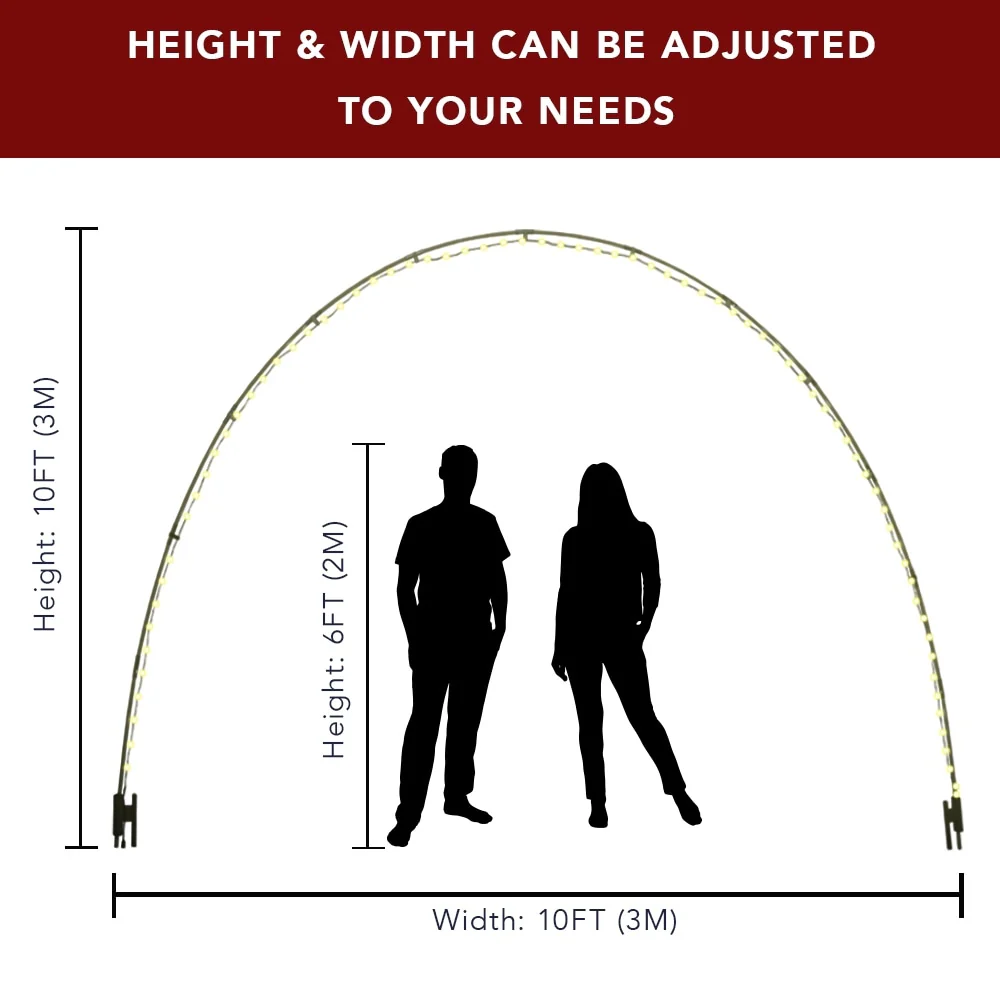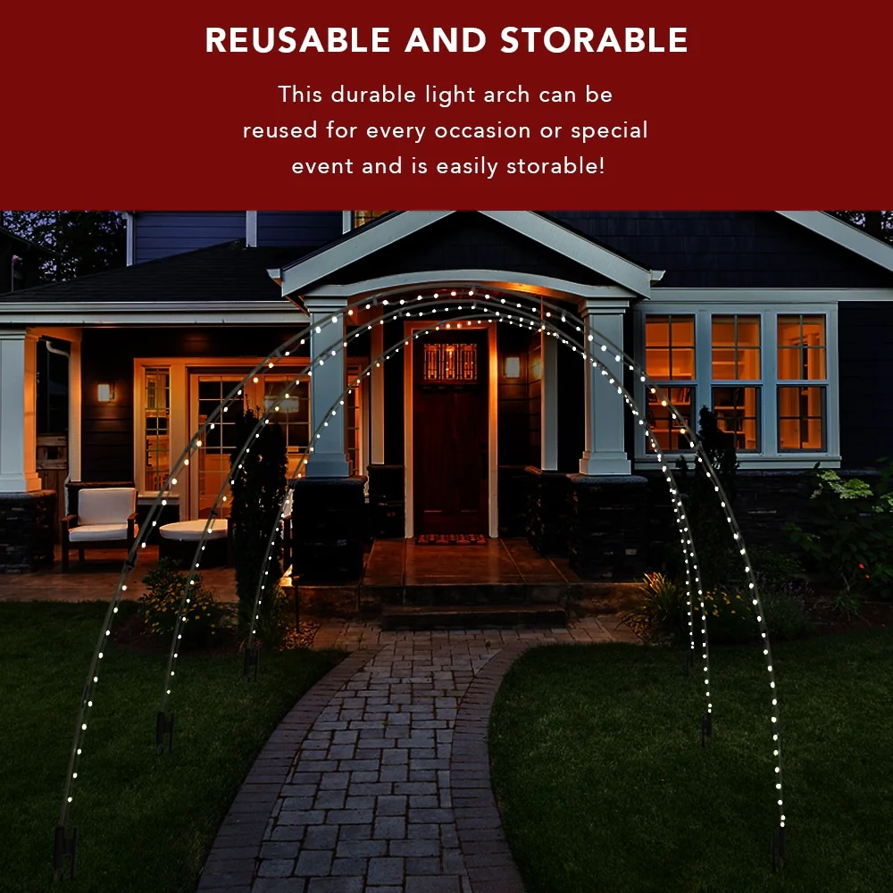 - HOLIDAY DECORATIONS: This set of 3 Christmas arches are the perfect addition to your outdoor Christmas decorations. Create cheerful sidewalk arch or driveway pathway with our holiday arch set. Each arch creates a 10FT-by-10FT arch and neatly stores away into a compact 19' x 8' x 6' storage bag. White twinkle lights are included but are interchangeable with your own red and green Christmas lights or other x-mas lights that complement your yard and decorations.