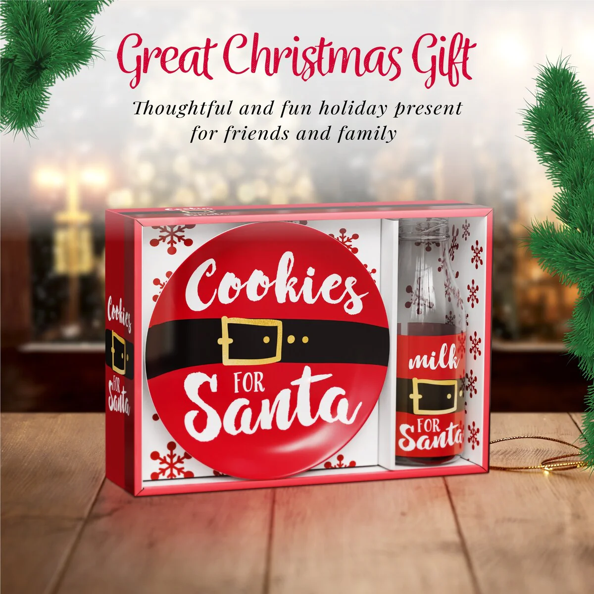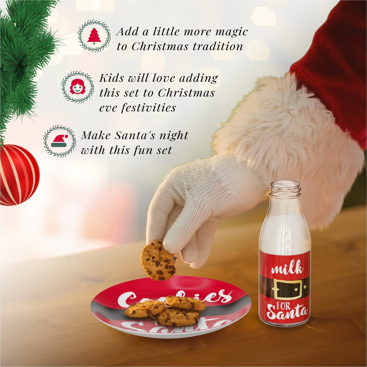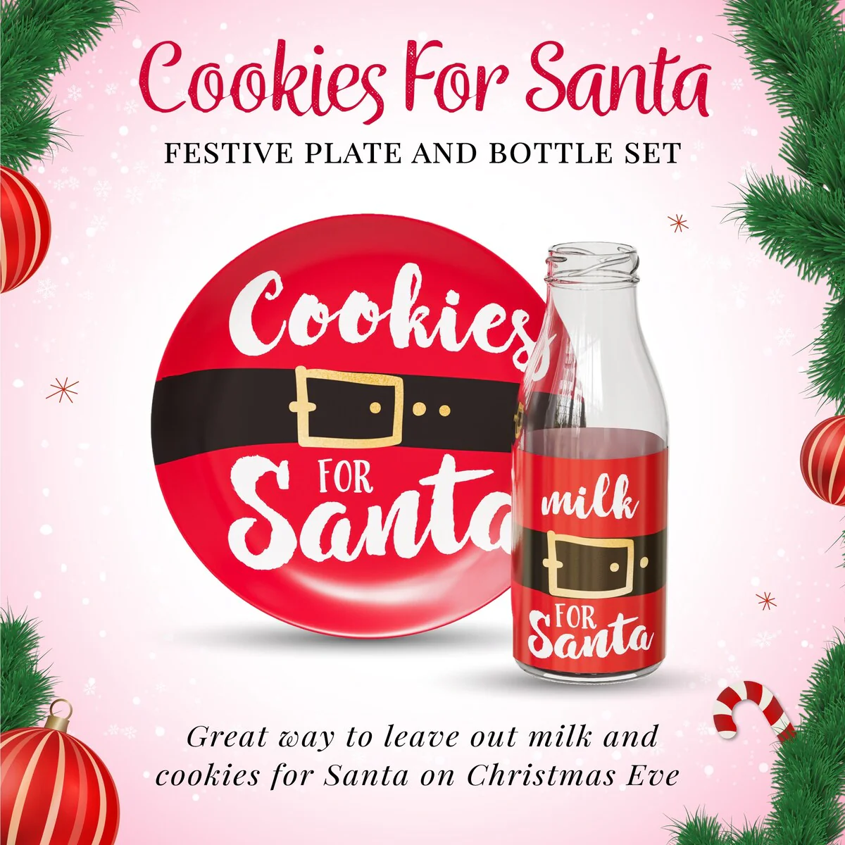 - DESIGN: The set feature Santa's belt. The plate has the phrase 'Cookies for Santa' and the bottle says, 'Milk for Santa'