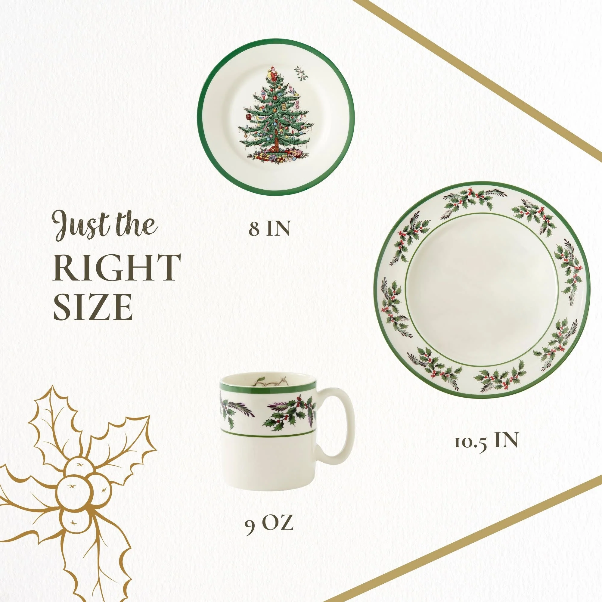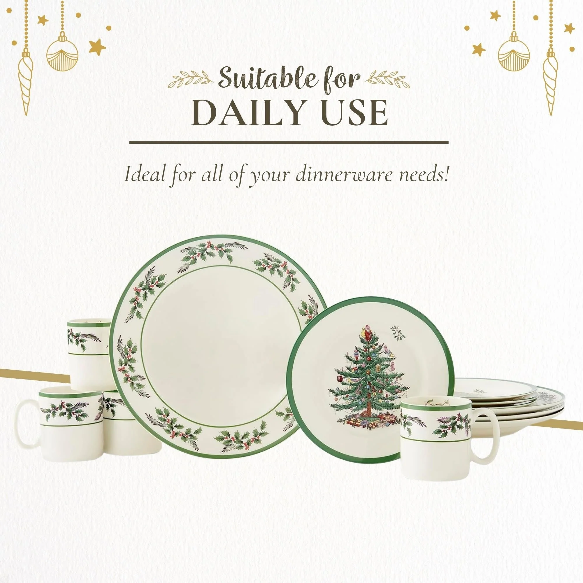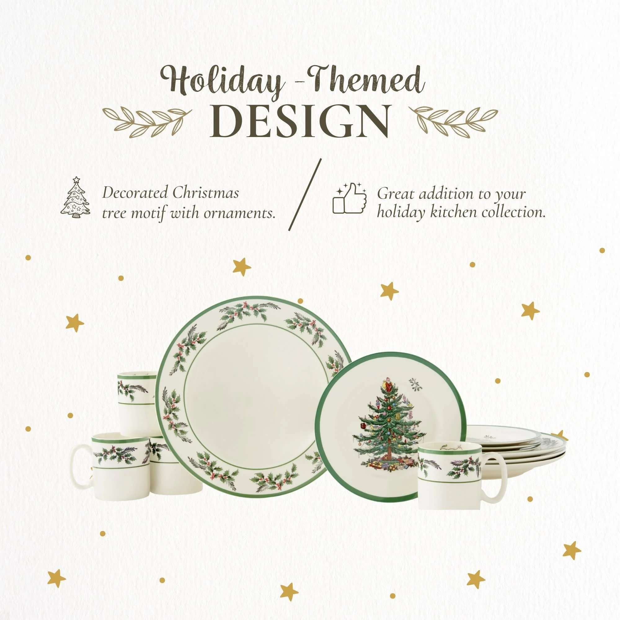 - Festive Dinnerware Set of 4: This holiday dinnerware collection includes 4 holly-accented 10-inch dinner plates, 8-inch Christmas tree salad plates, and holly-decorated 9-ounce mugs, providing a festive look for family meals and holiday gatherings.