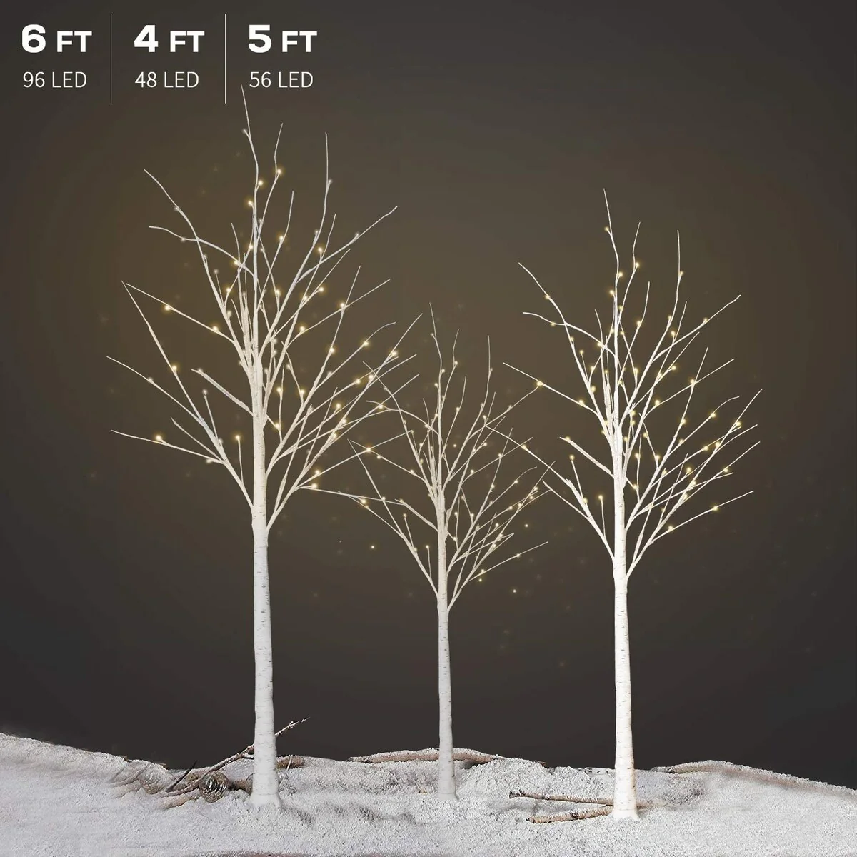 🎄One set contains 3 sizes: Three suitable heights are 4ft, 5ft, and 6ft, including. Comes with warm white LED lights sprinkled through the branches for an elegant holiday look, create a cheerful party atmosphere or make it an eye-catching decoration to your windows display.