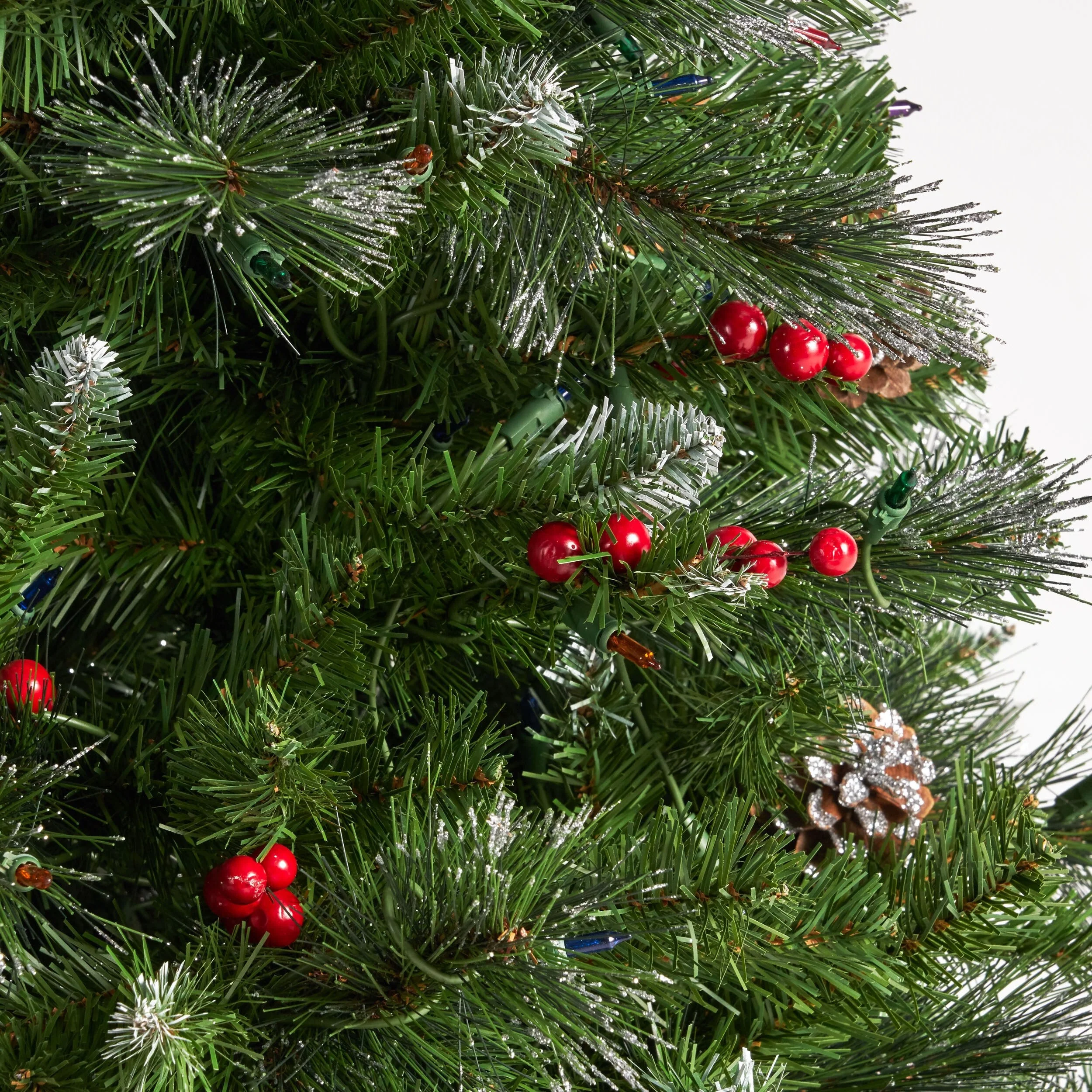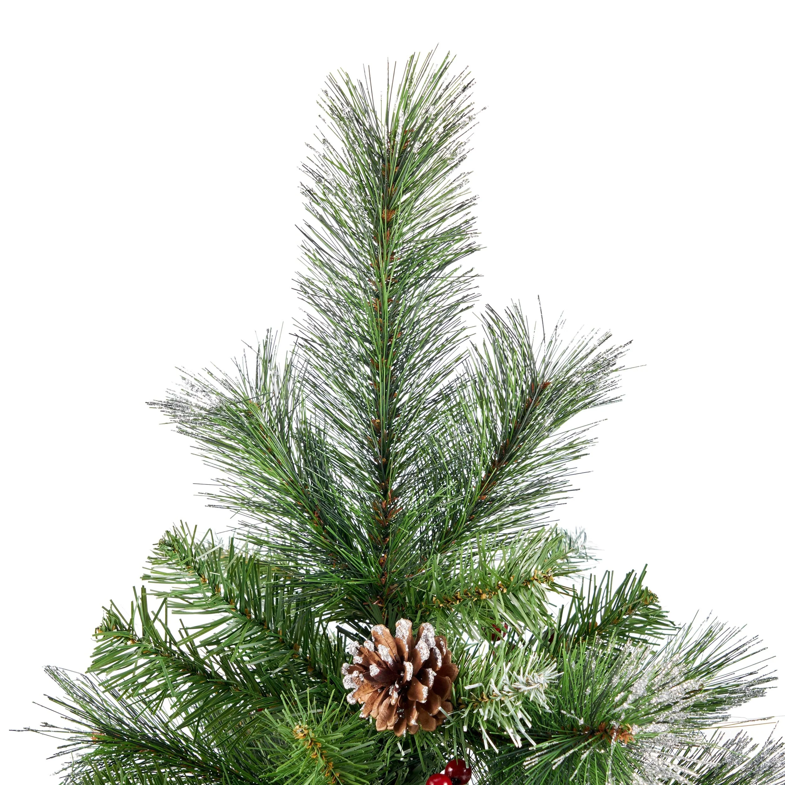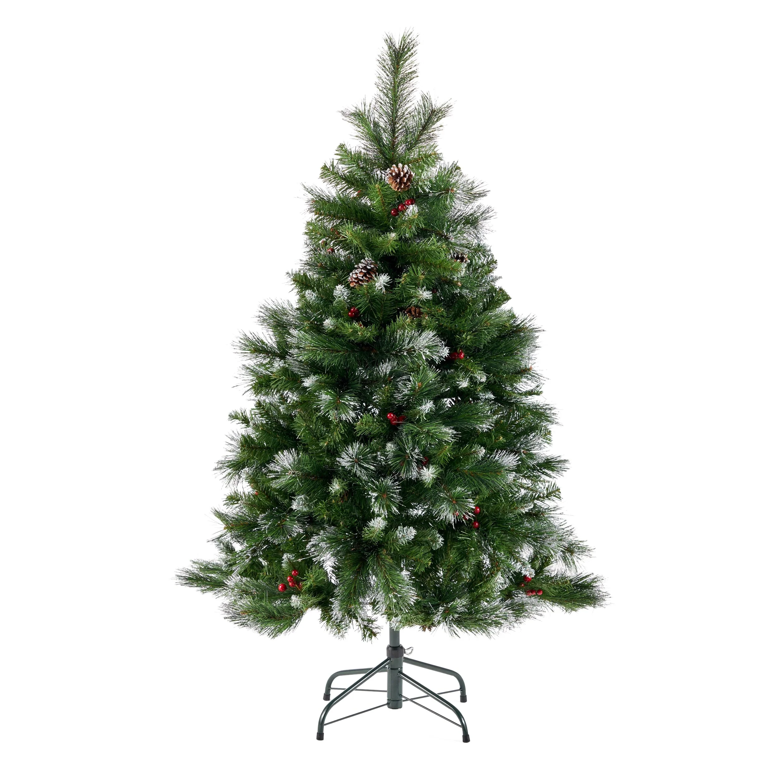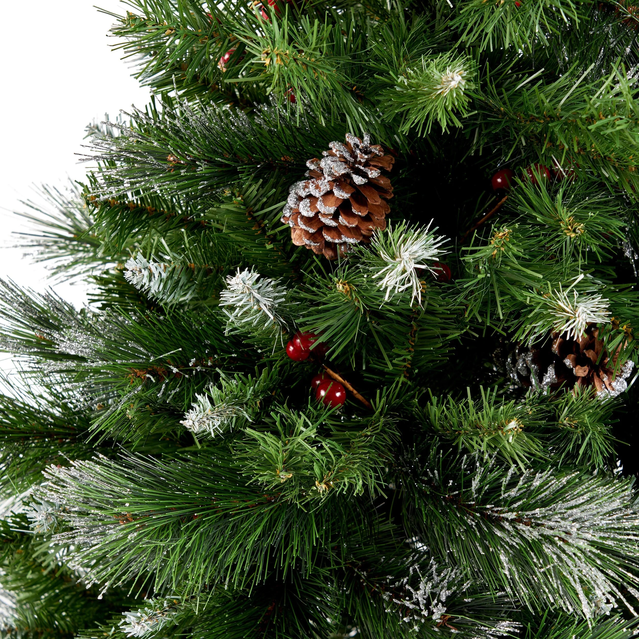 MIXED NEEDLES: From its glitter tipped branches to its bright red berries and snow powdered pine cones, our tree perfectly captures the charm of Christmas. Featuring a gorgeous mix of pine and fir needles, this tree is finished with natural-looking tips and hinged branches for all of your ornaments. Please note that this accessory is intended for indoor use only.