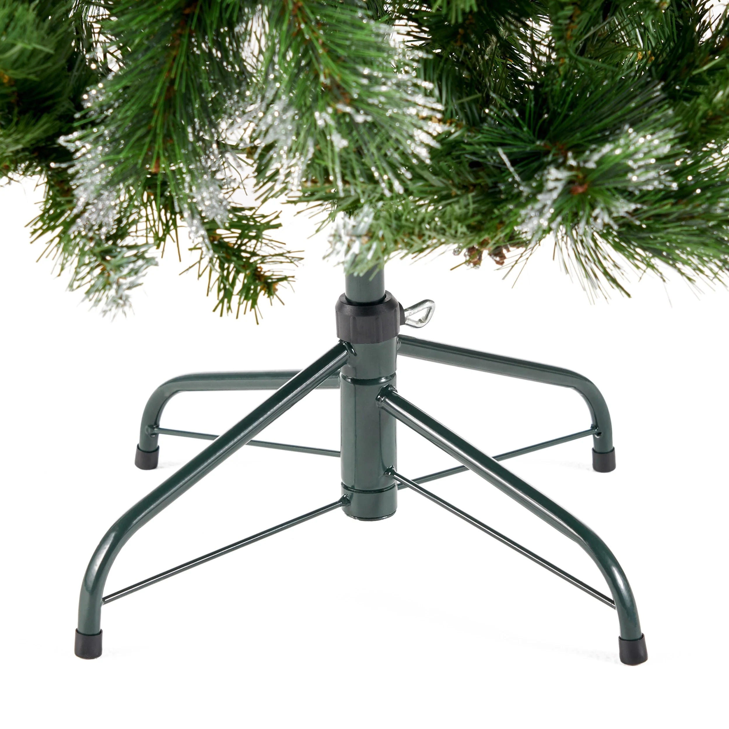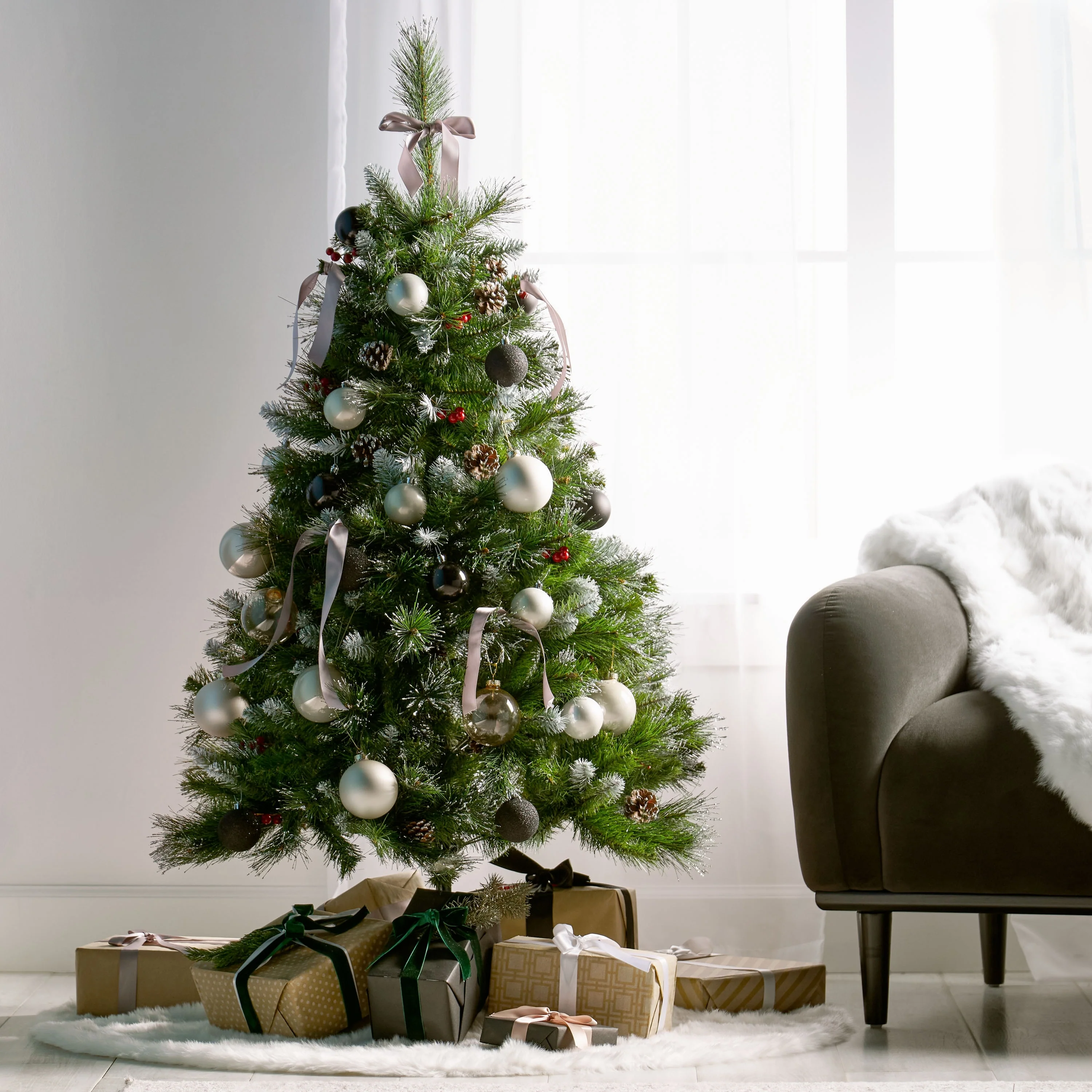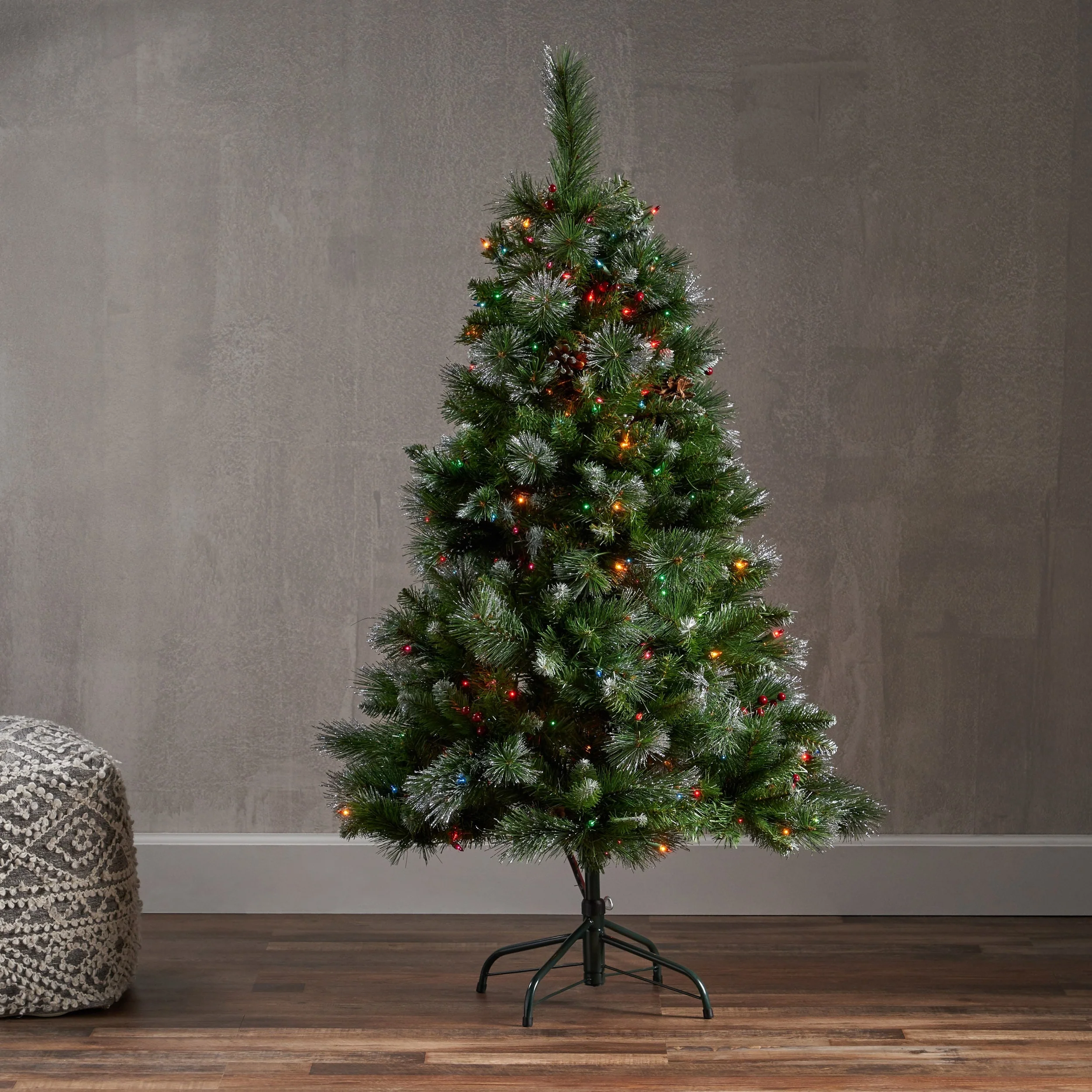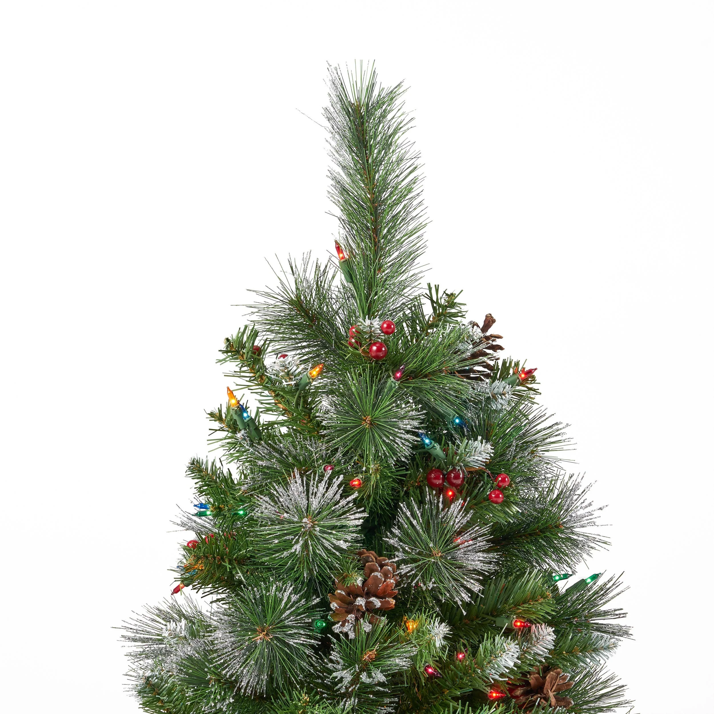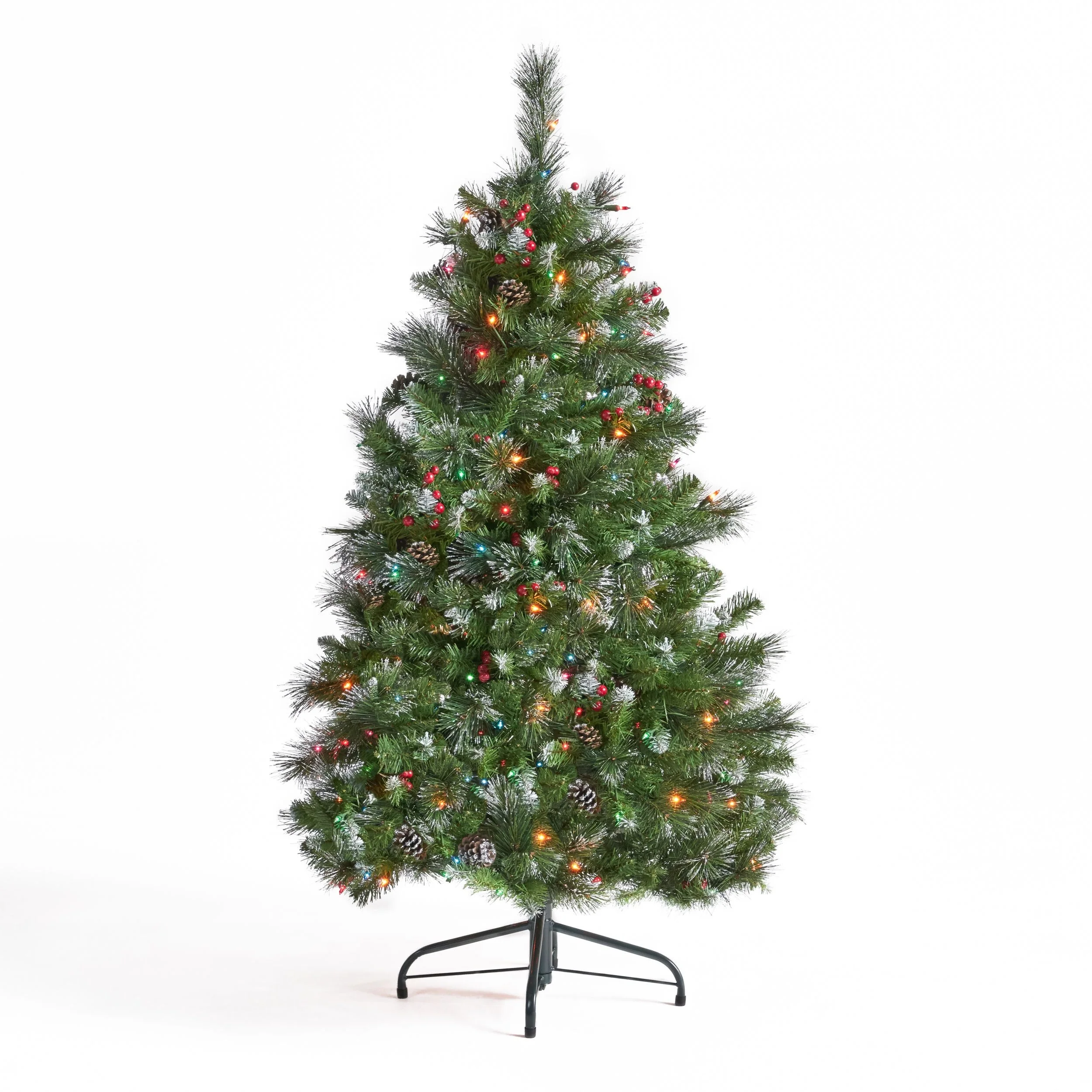 MIXED NEEDLES: From its glitter tipped branches to its bright red berries and snow powdered pine cones, our tree perfectly captures the charm of Christmas. Featuring a gorgeous mix of pine and fir needles, this tree is finished with natural-looking tips and hinged branches for all of your ornaments. Please note that this accessory is intended for indoor use only.