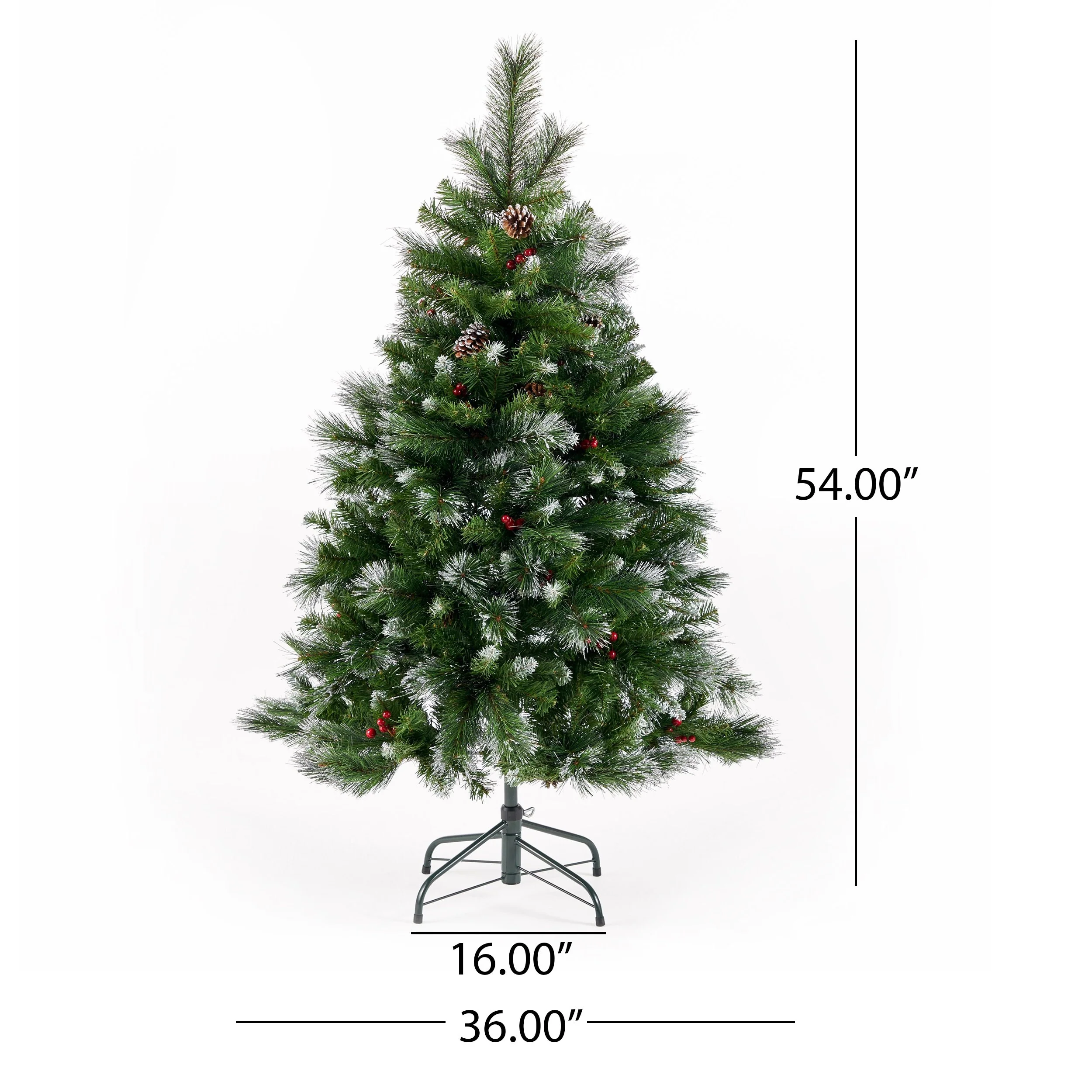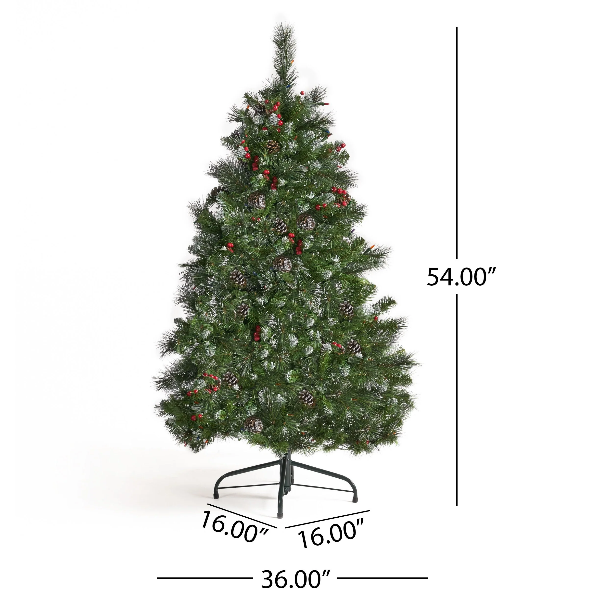 DIMENSIONS: Choose a centerpiece for the holidays that is the perfect size for you and your home. This Christmas tree is 36.00' W x 36.00' D x 54.00' H with a base of 16.00' W x 16.00' D x 6.50' H. You will love how festive your interior space can become with the simple addition of this charming tree.