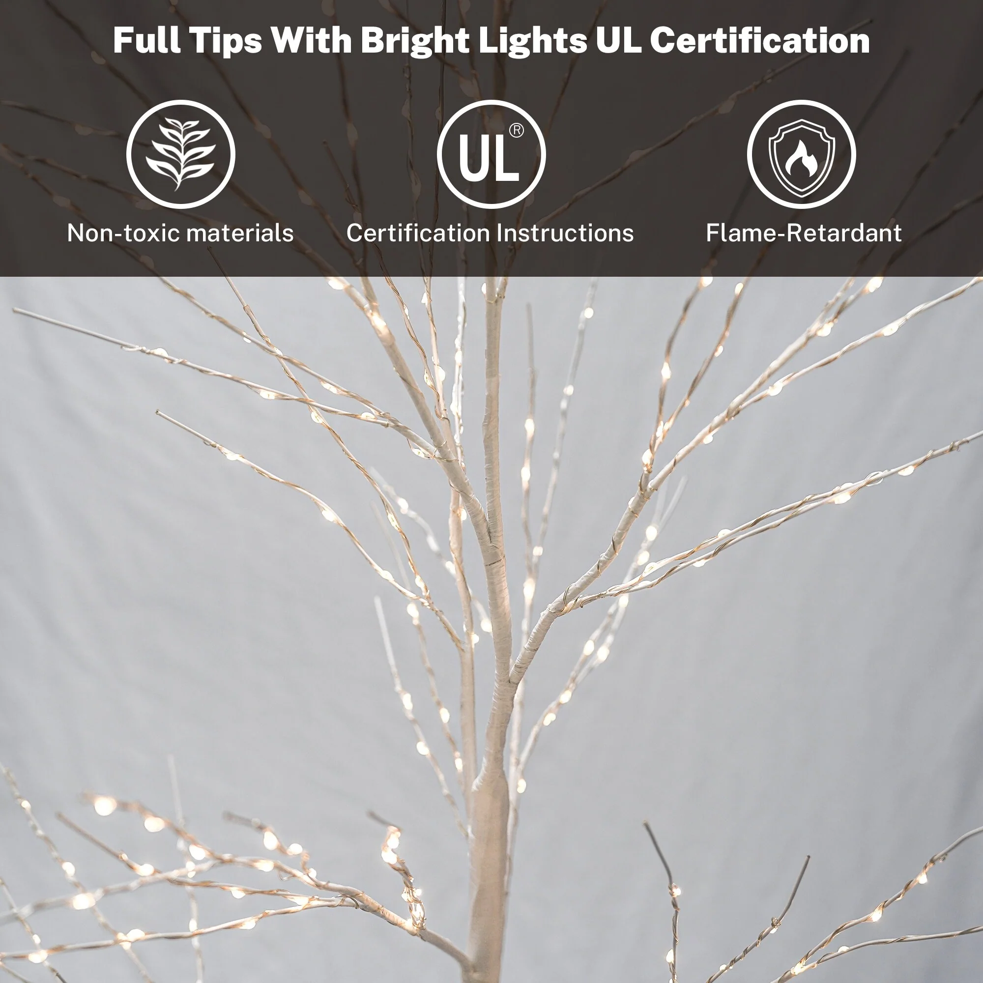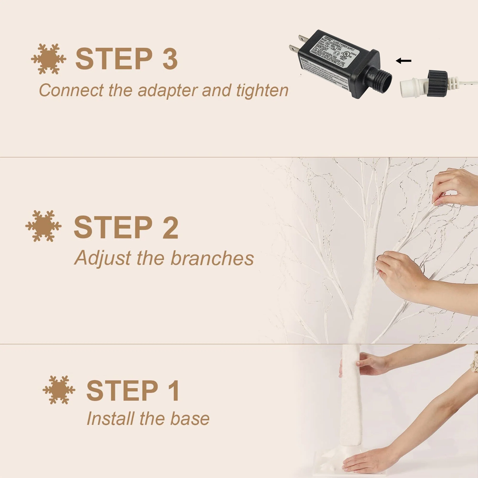 Create a cozy and welcoming atmosphere in your home with this set of 3 LED lighted birch trees. The pack includes 4FT, 5FT, and 6FT sizes, each covered with natural-looking bark texture and warm white lights. These trees are perfect for year-round decoration in your yard, living room, or front door thanks to their waterproof UL-certified adapter. The bendable branches can be easily reshaped to suit your needs, making them perfect for hanging delicate ornaments or accessories. Use these beautiful trees to add a festive touch to your wedding, Christmas decor, or any party occasion.