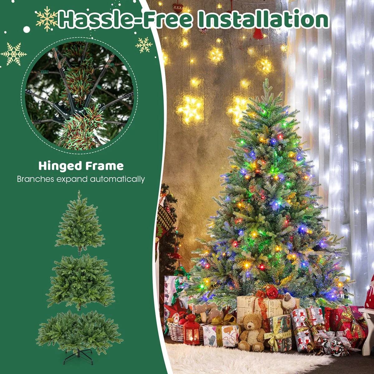 It has 250/350/470 LED lights that not only offer long-lasting brightness but also feature low voltage for security. With warm white & colorful lighting options, you can transform your holiday decorations into a radiant spectacle. UL-certified & equipped with 11 dynamic lighting modes, including A. B color changing quick flash, A. B color changing slow flash, A. B color changing 5 times, A. B color changing slow fade, A. B steady on and more, this Xmas tree promises to create an impressive holiday vibe. Made from new PE & PVC materials, the Xmas tree boasts 844/1168/1646 branch tips that bring it to life. It is resistant to fire, fading & allergies, ensuring a safe & smell-free space. Setup is a breeze thanks to the automatic expansion of branches on the hinged frame. To top it off, the Xmas tree comes with a pair of gloves for your protection. Suitable for any space, from home to office to carnival, this Xmas tree is poised to astonish your family.