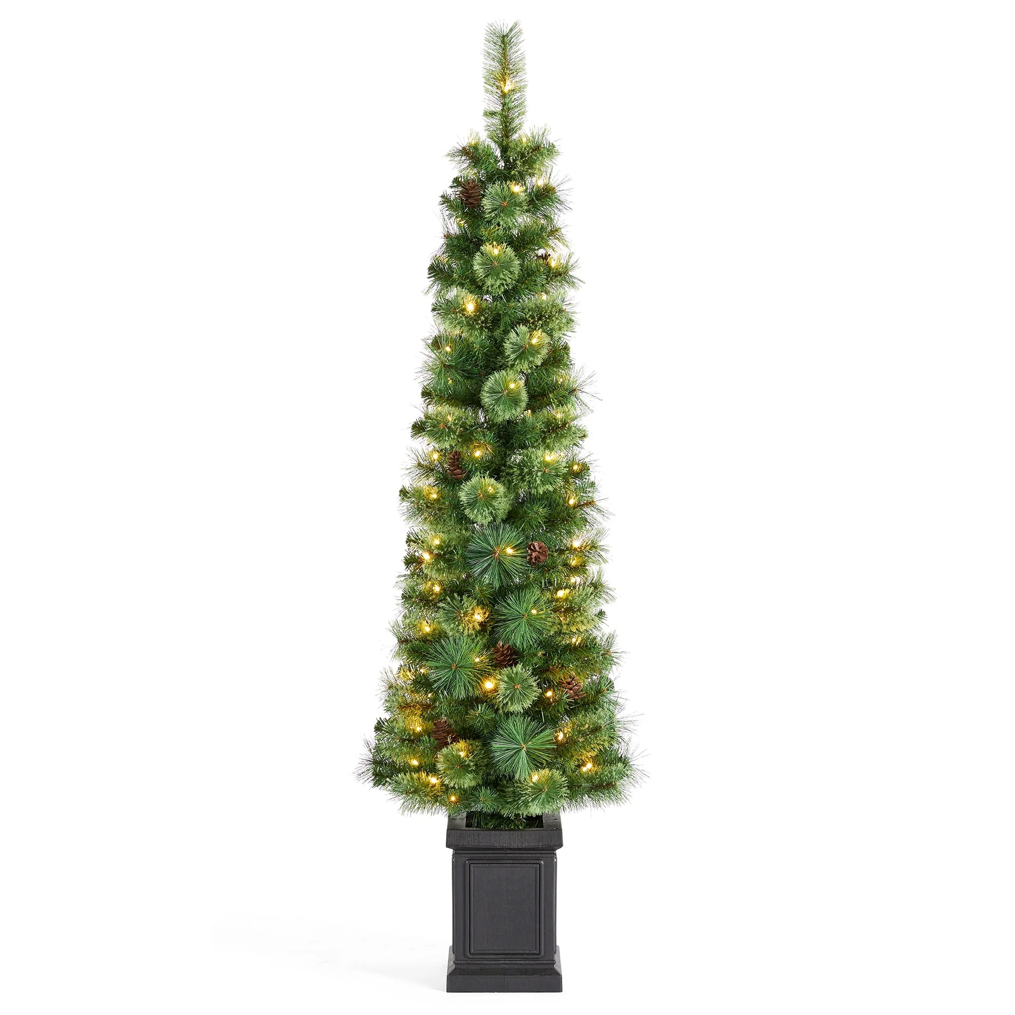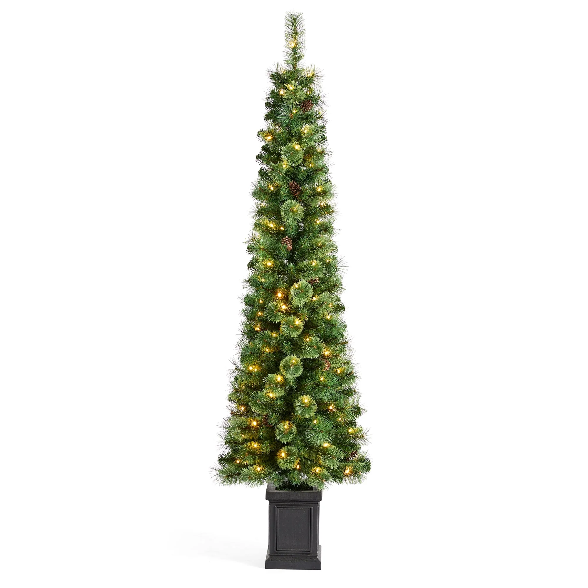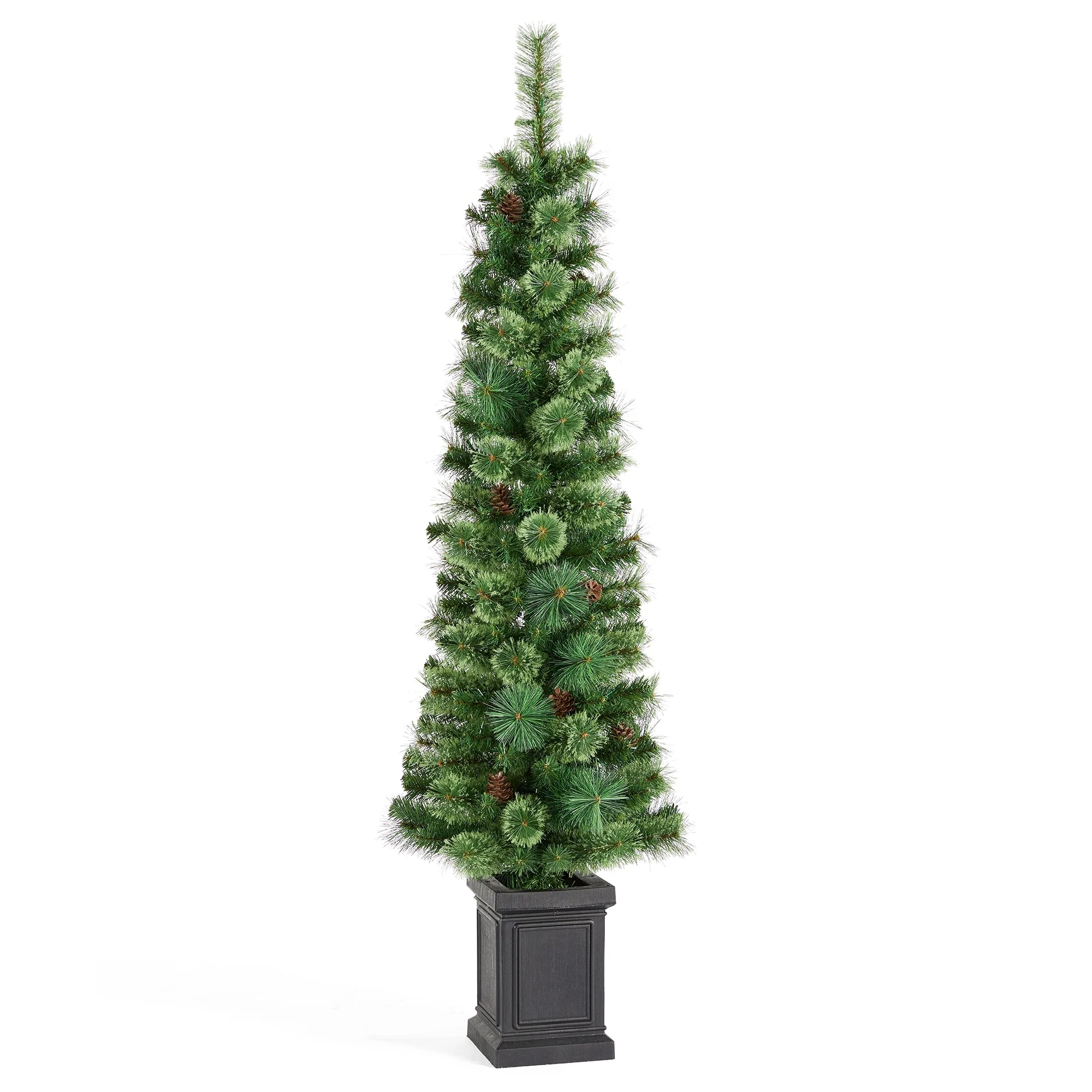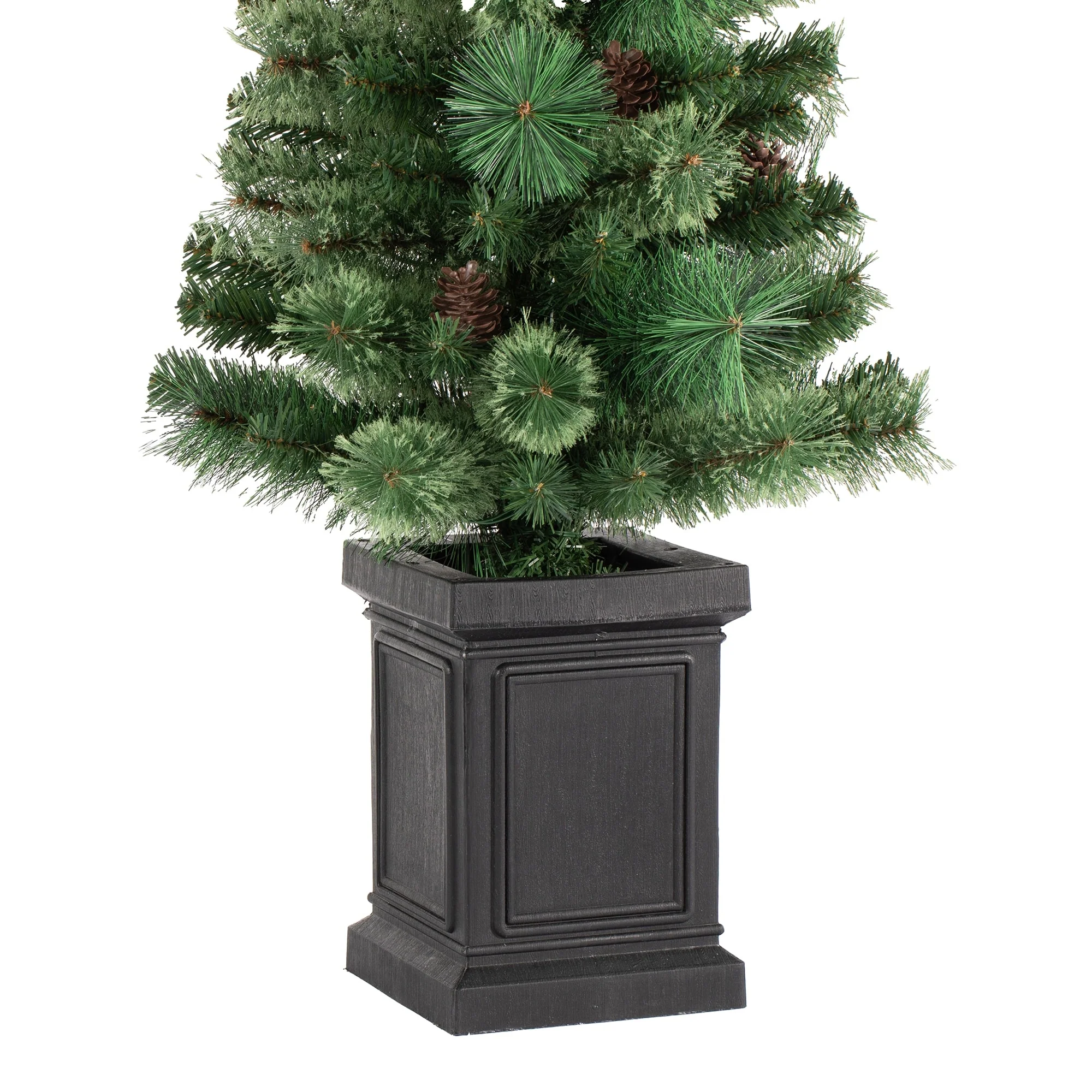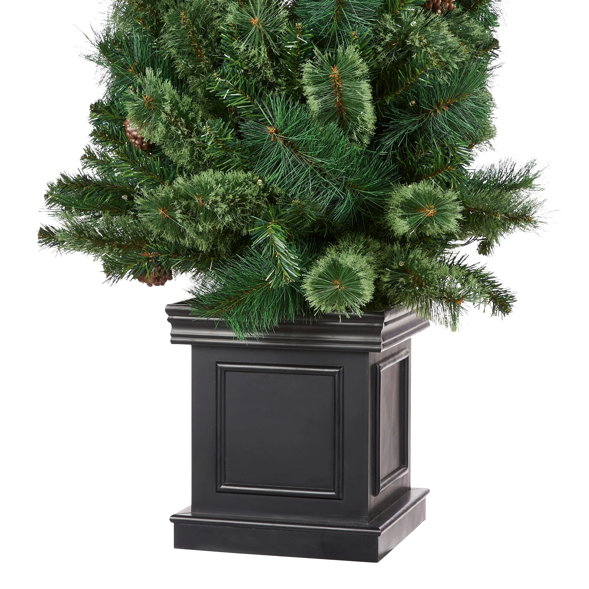 This 5ft/6ft/7ft mixed tips Pine Entrance Pot Tree with decorative square base is a welcoming addition to doorway, deck, porch or patio. It features snow sprinkled branches and is trimmed with pinecones. This tree is pre-lit with warm white lights that remain lit even if a bulb burns out. Display this attractive greenery in any indoor or covered outdoor location.