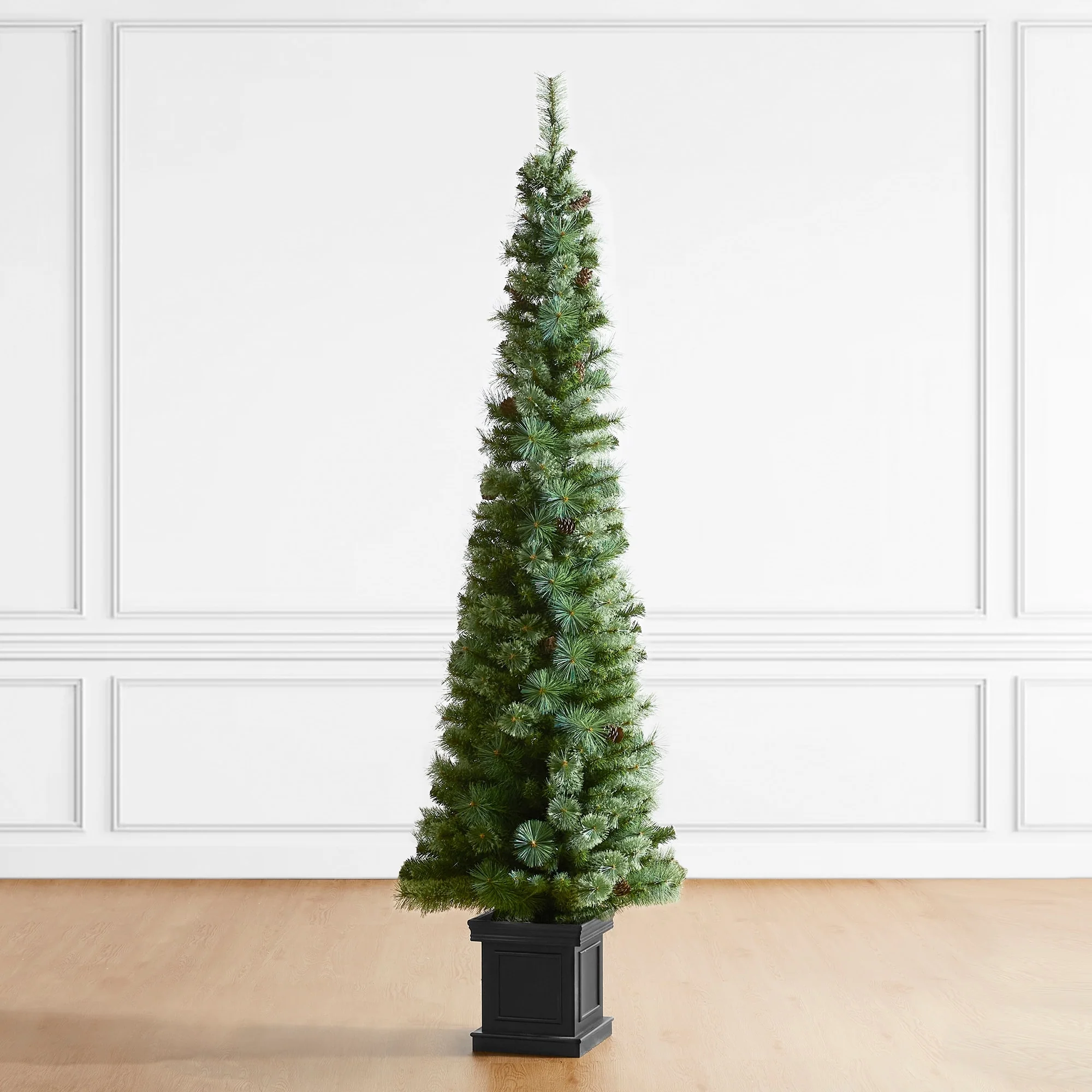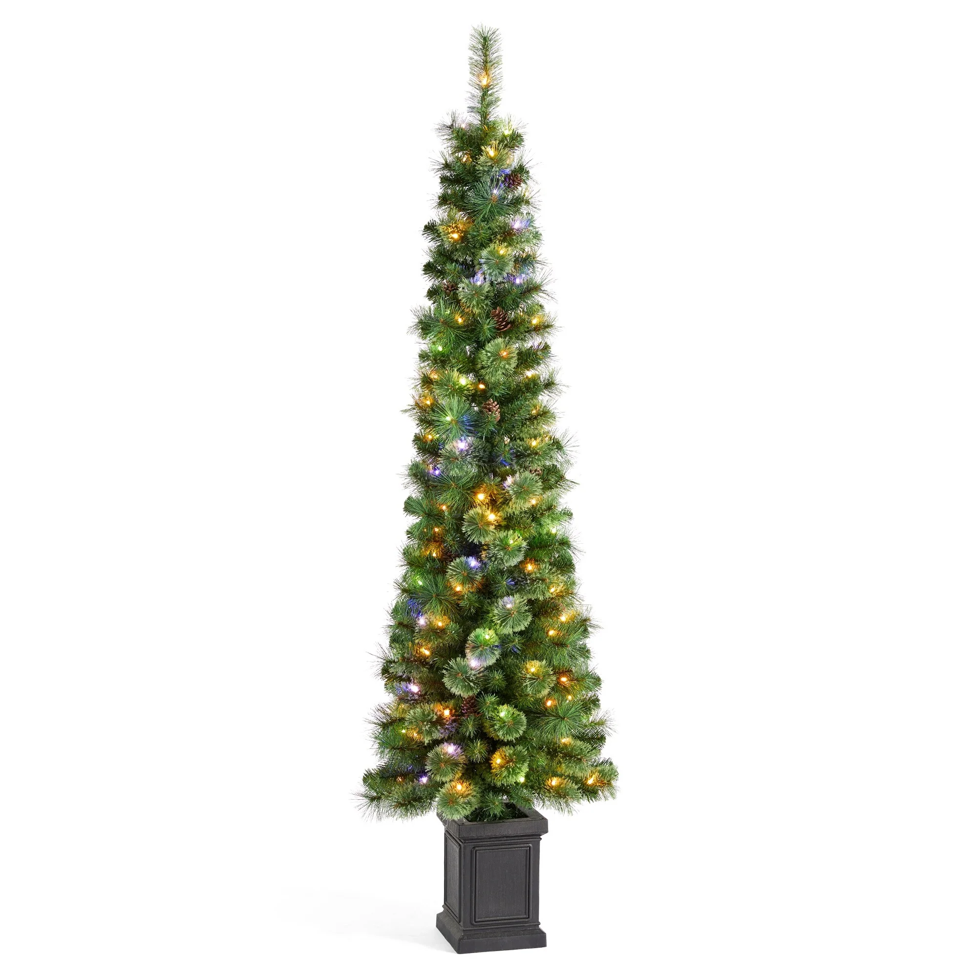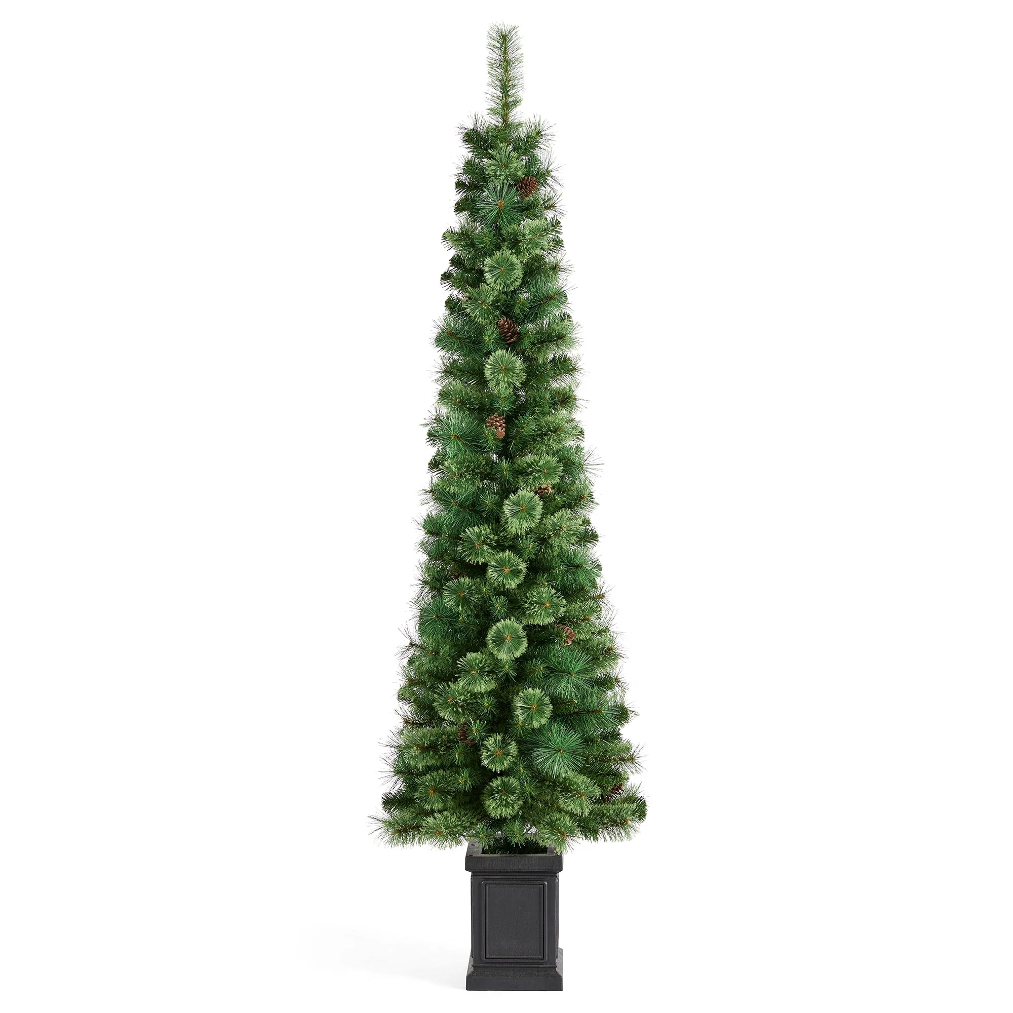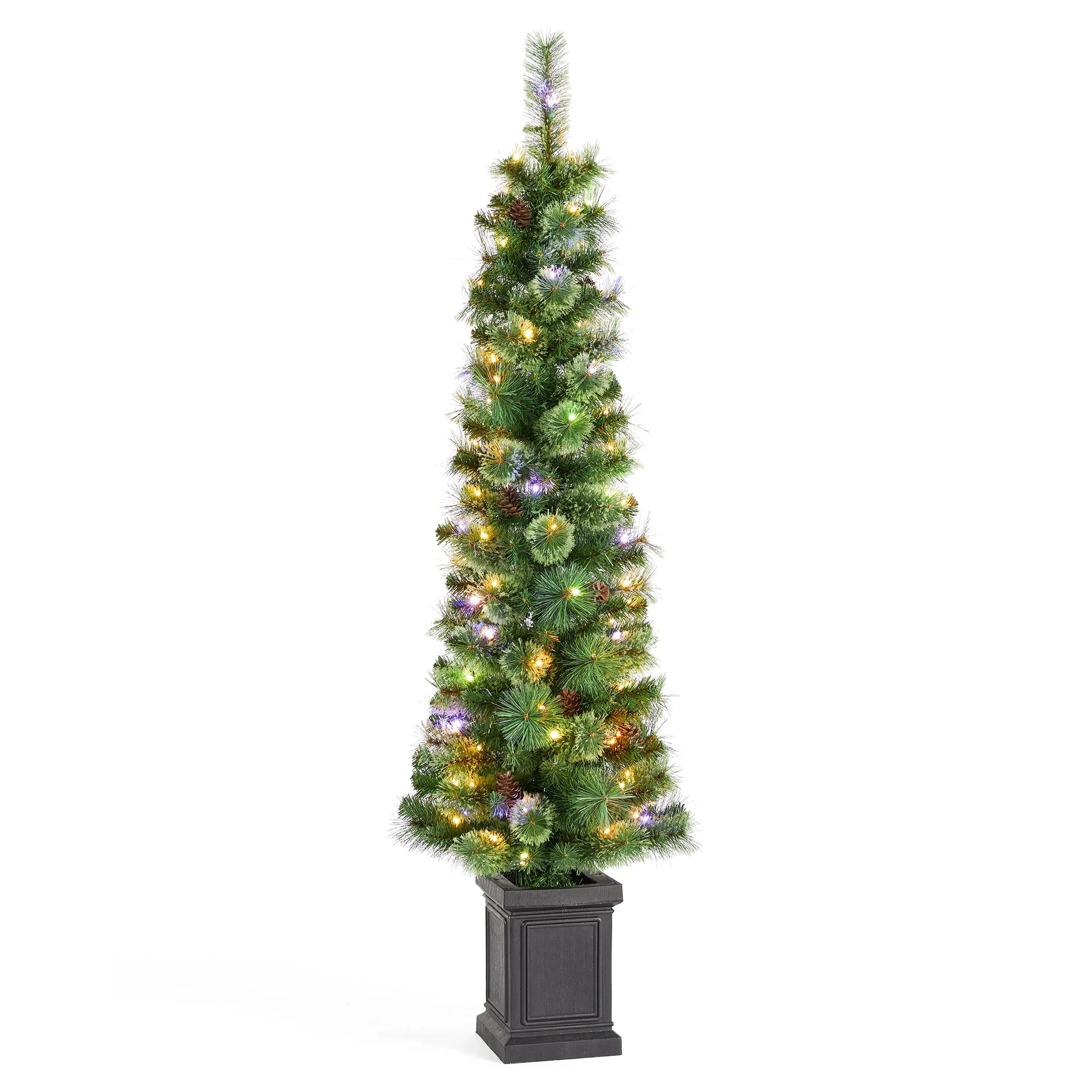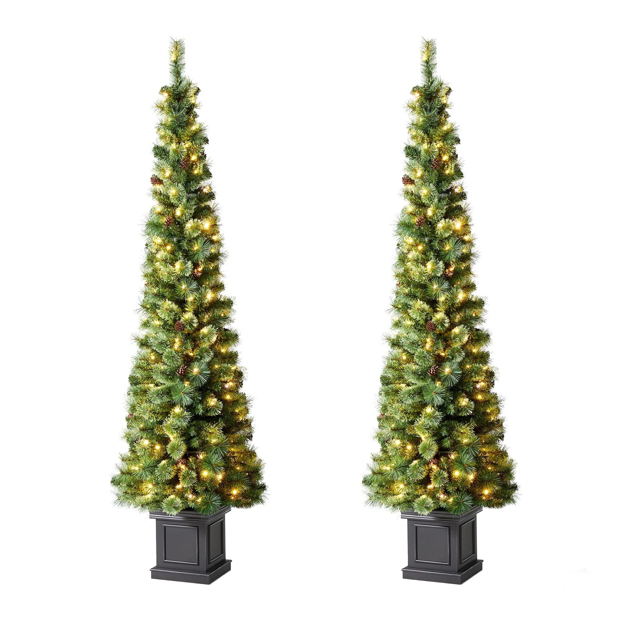 This 5ft/6ft/7ft mixed tips Pine Entrance Pot Tree with decorative square base is a welcoming addition to doorway, deck, porch or patio. It features snow sprinkled branches and is trimmed with pinecones. This tree is pre-lit with warm white lights that remain lit even if a bulb burns out. Display this attractive greenery in any indoor or covered outdoor location.