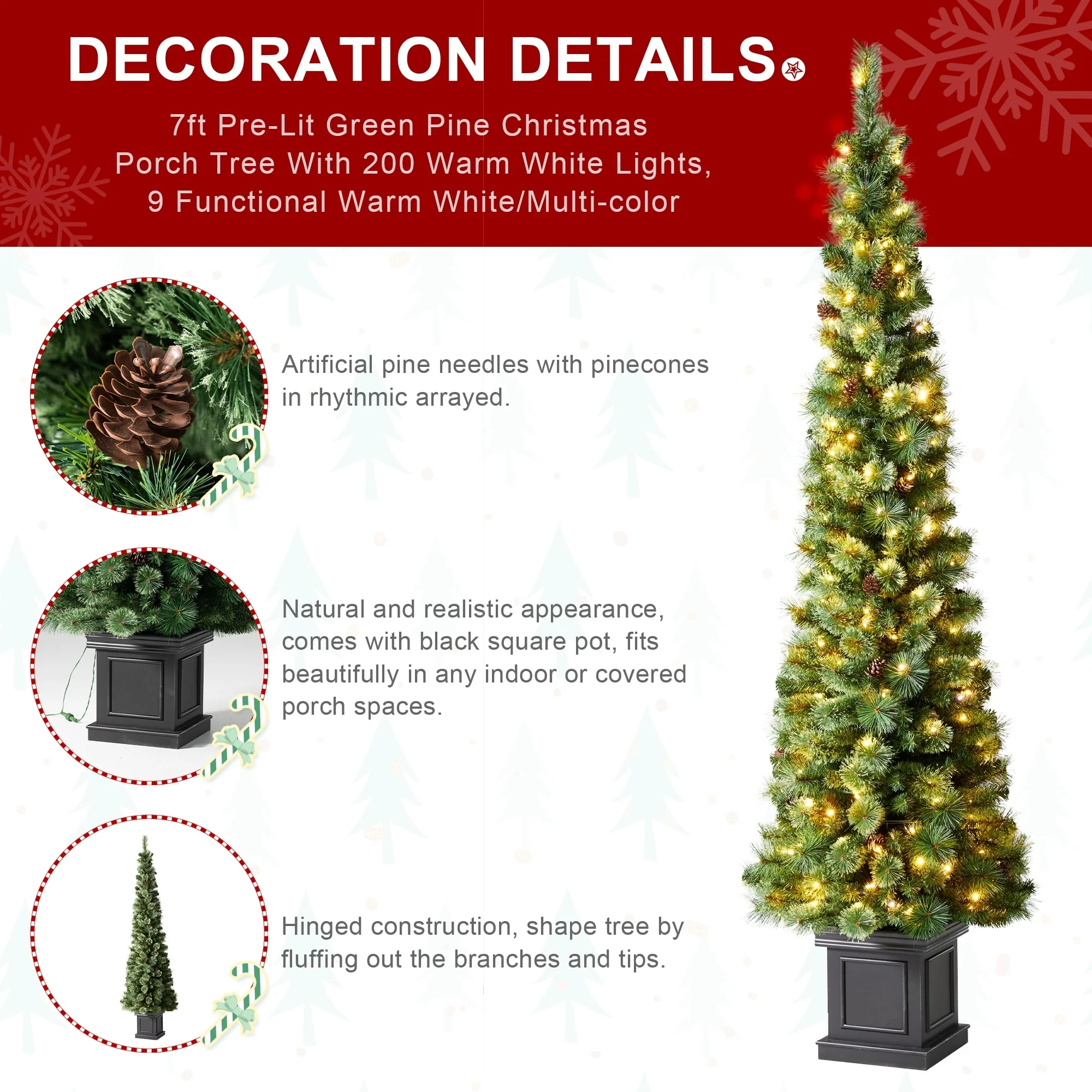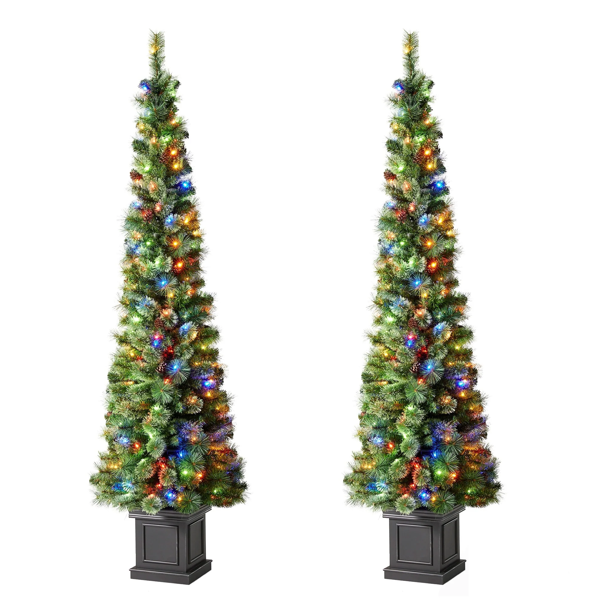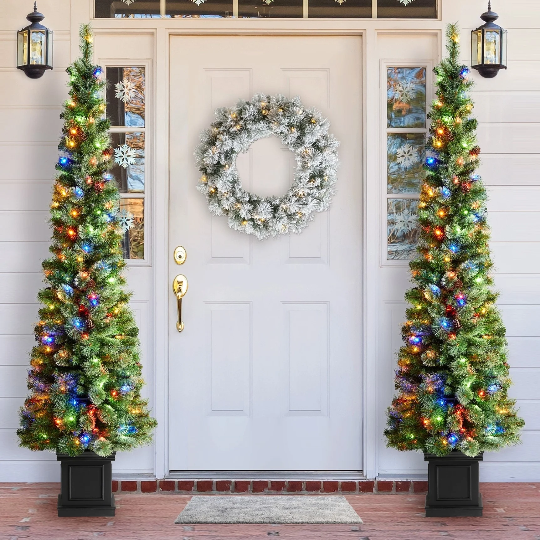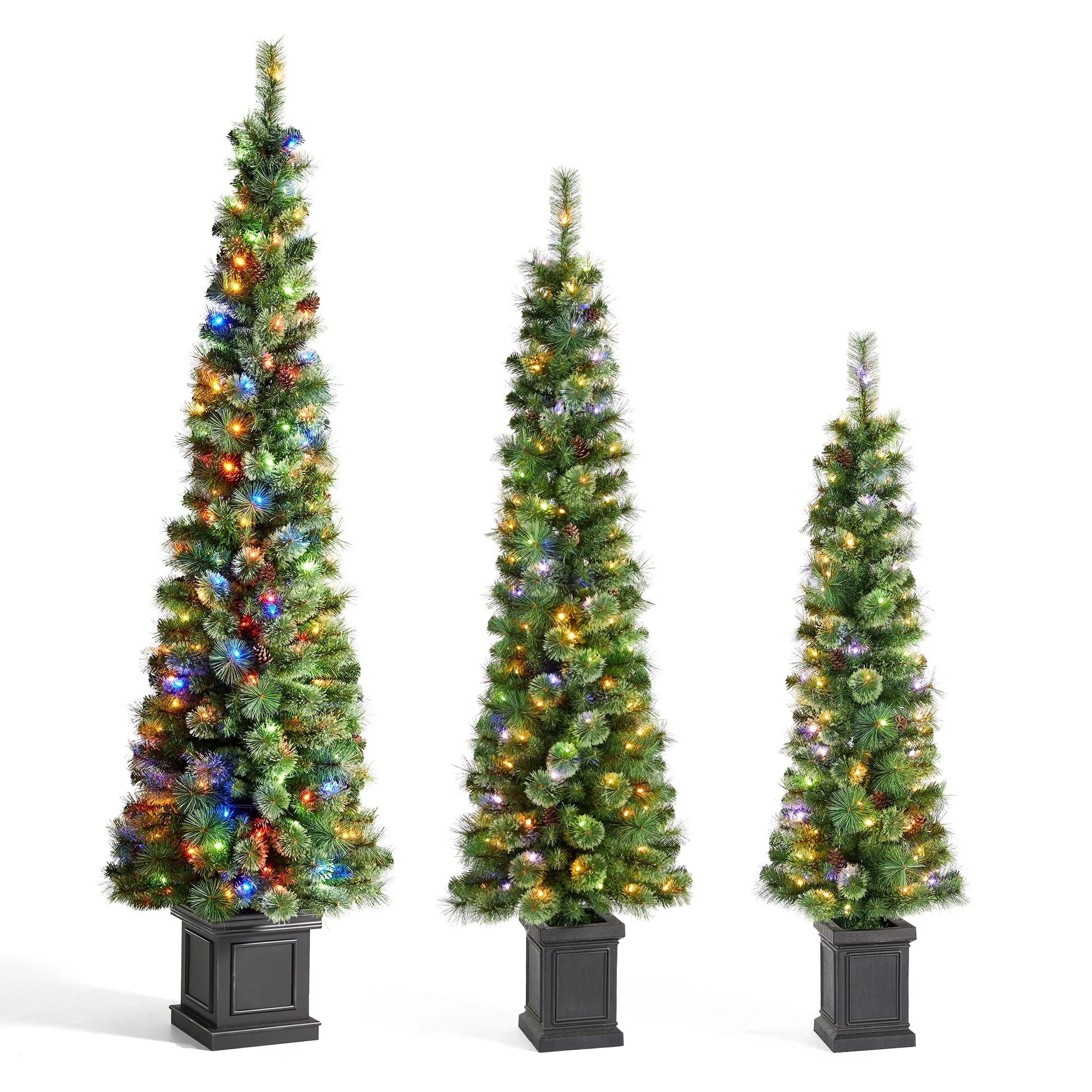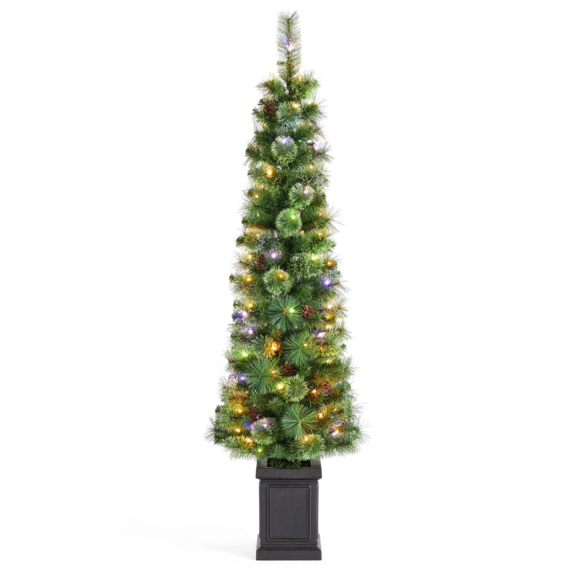 This 5ft/6ft/7ft mixed tips Pine Entrance Pot Tree with decorative square base is a welcoming addition to doorway, deck, porch or patio. It features snow sprinkled branches and is trimmed with pinecones. This tree is pre-lit with warm white lights that remain lit even if a bulb burns out. Display this attractive greenery in any indoor or covered outdoor location.