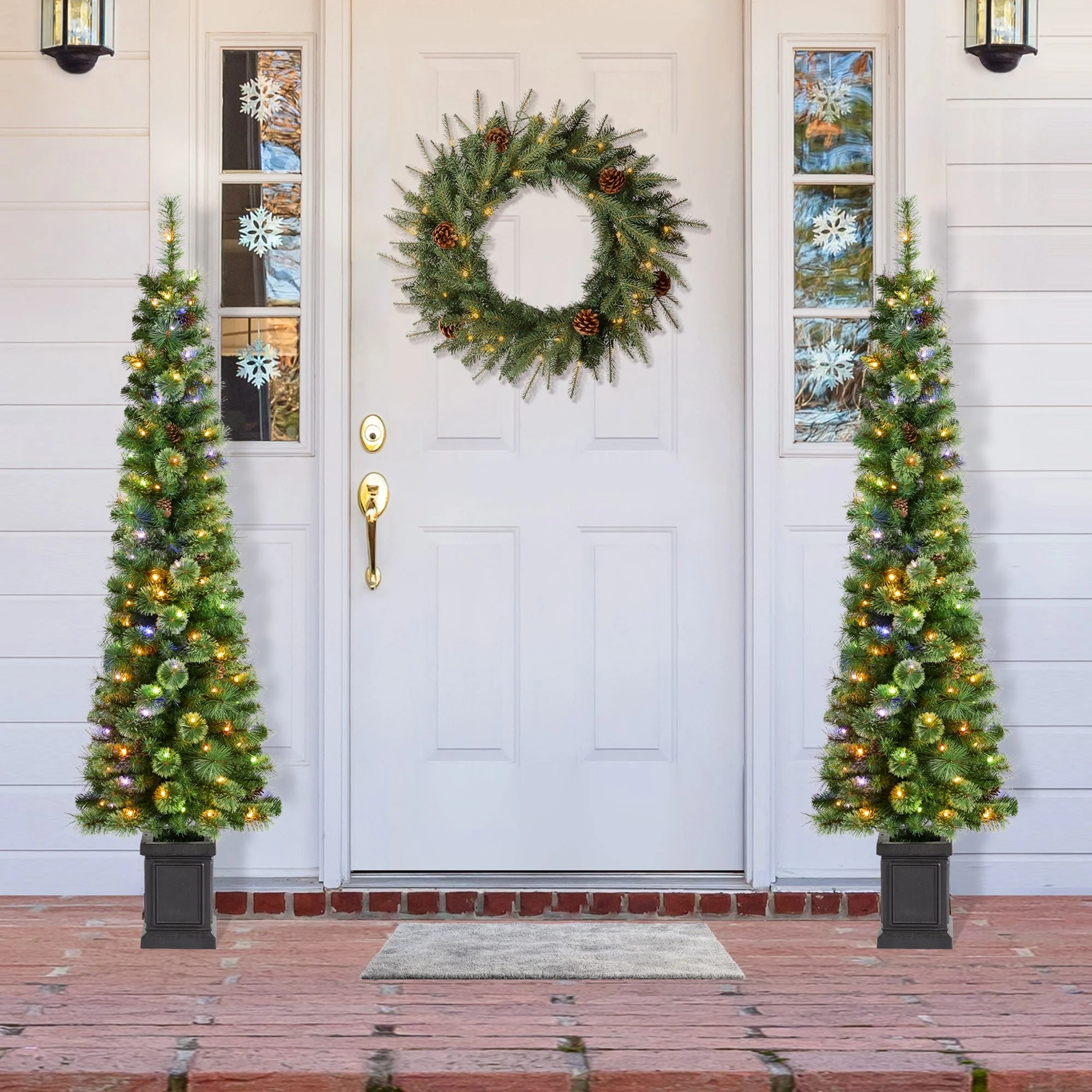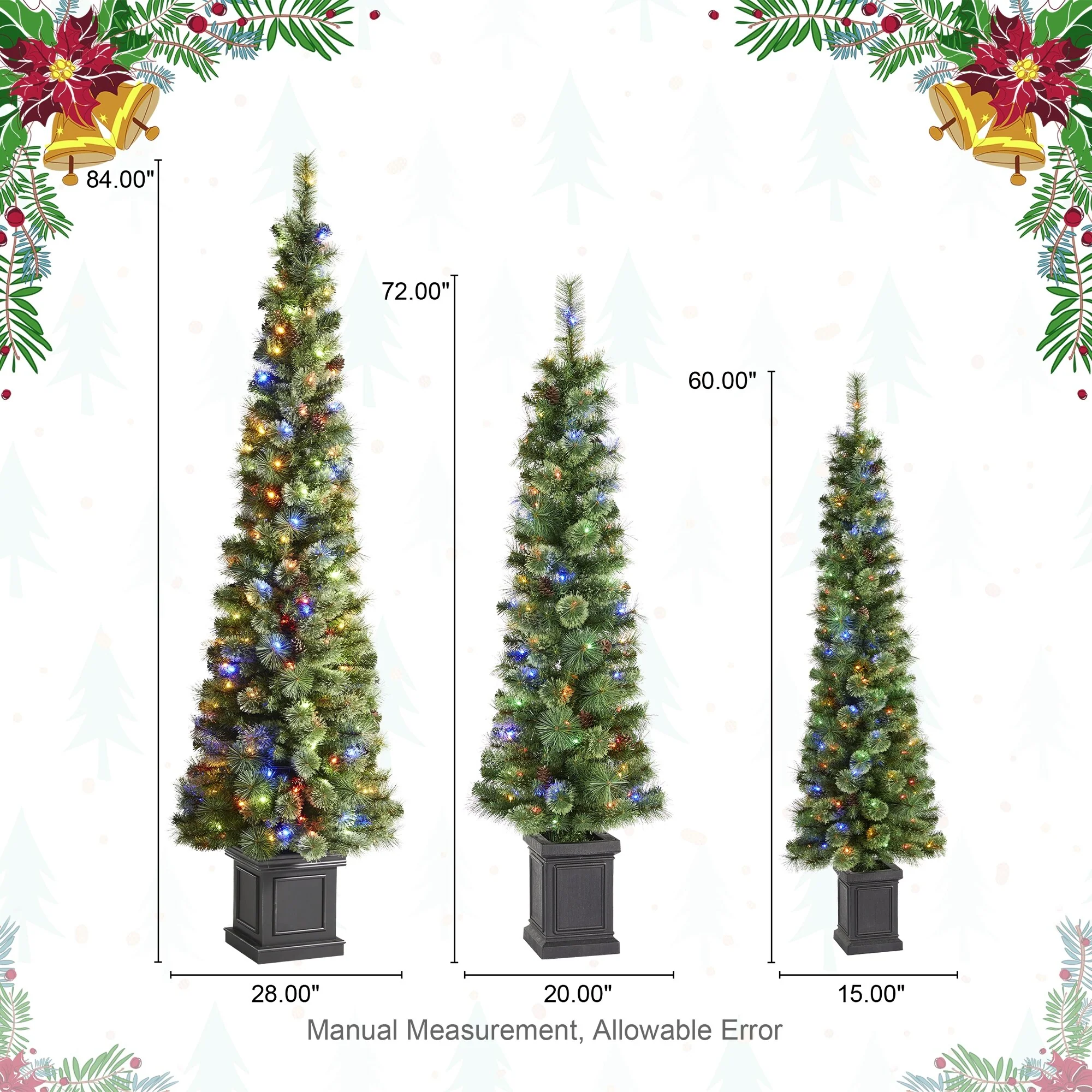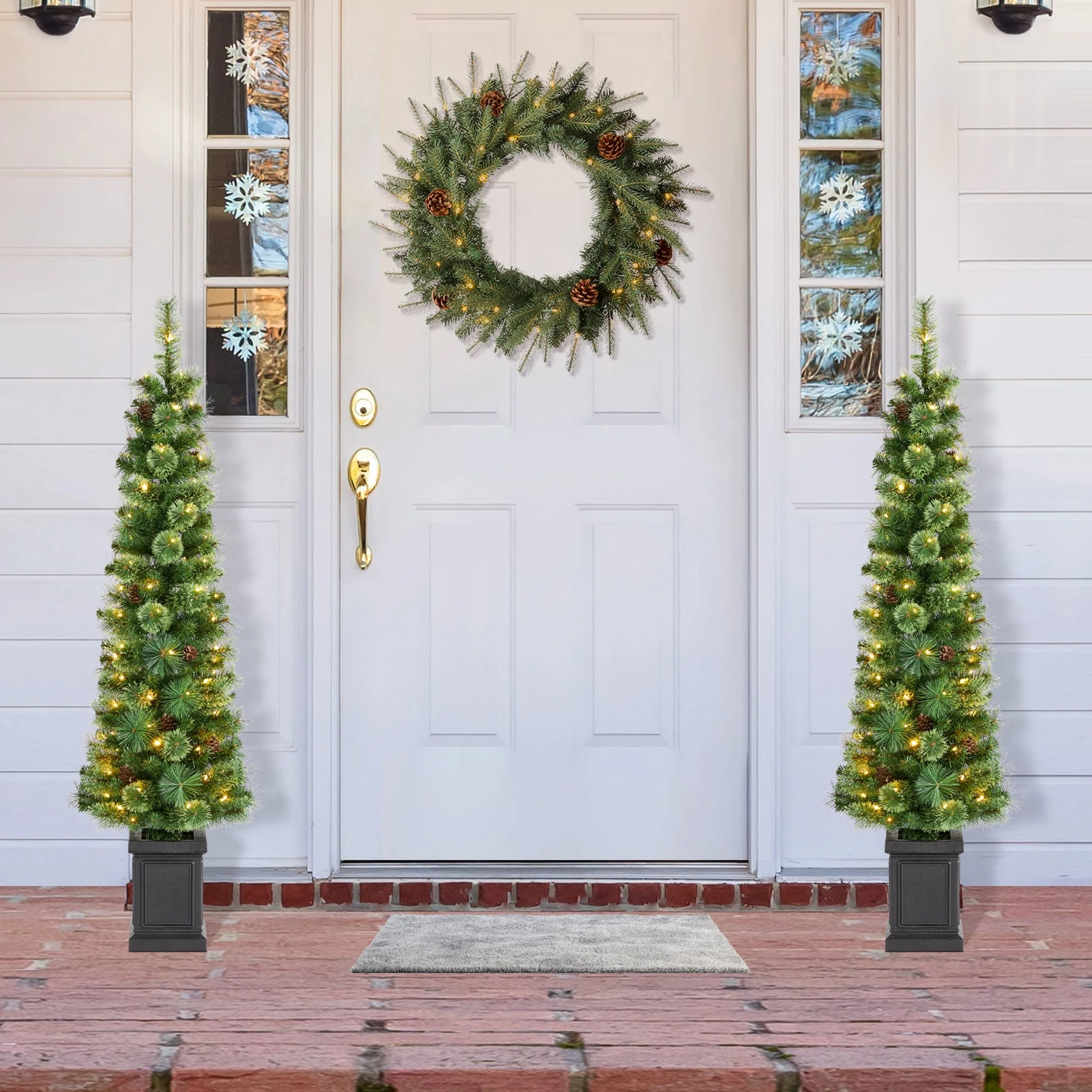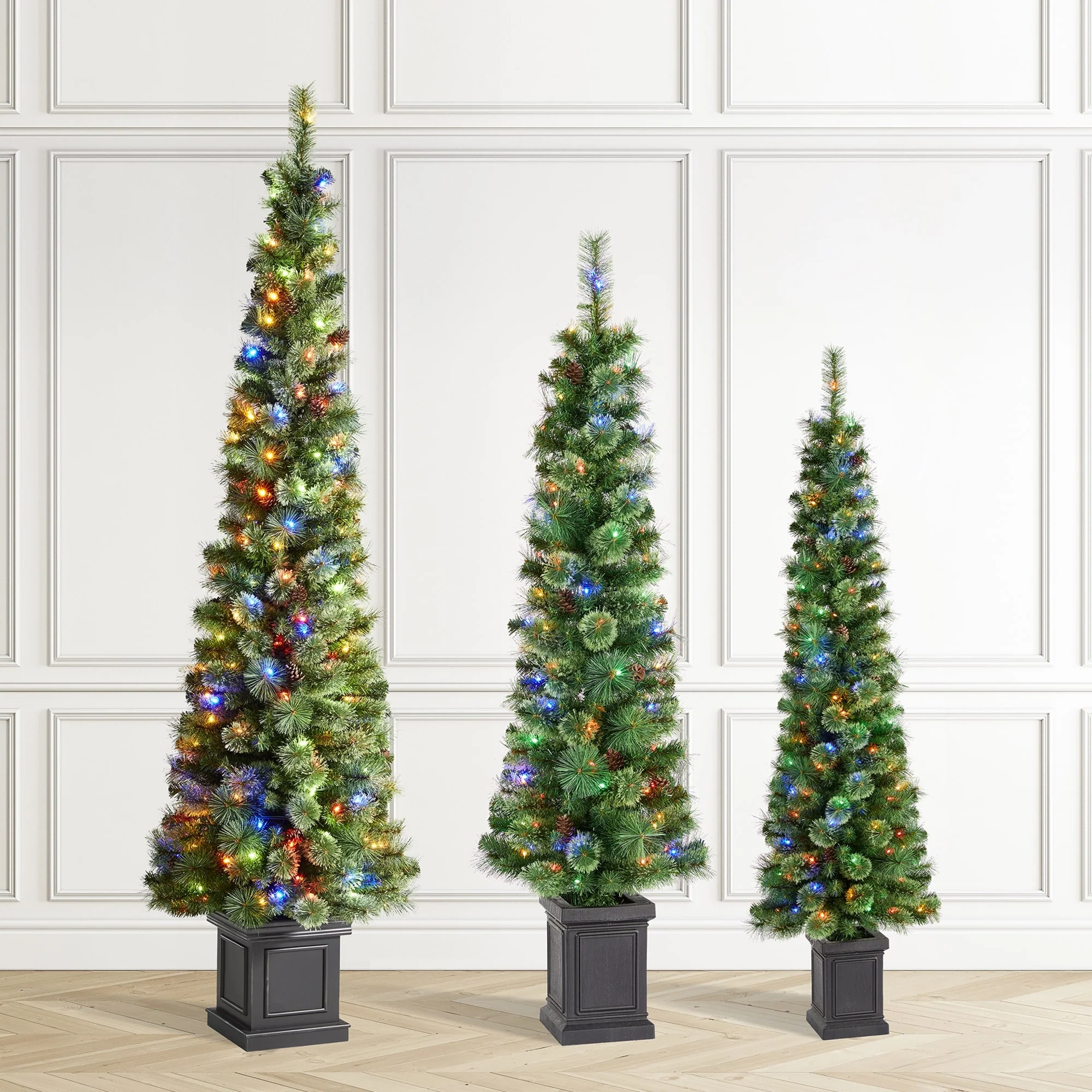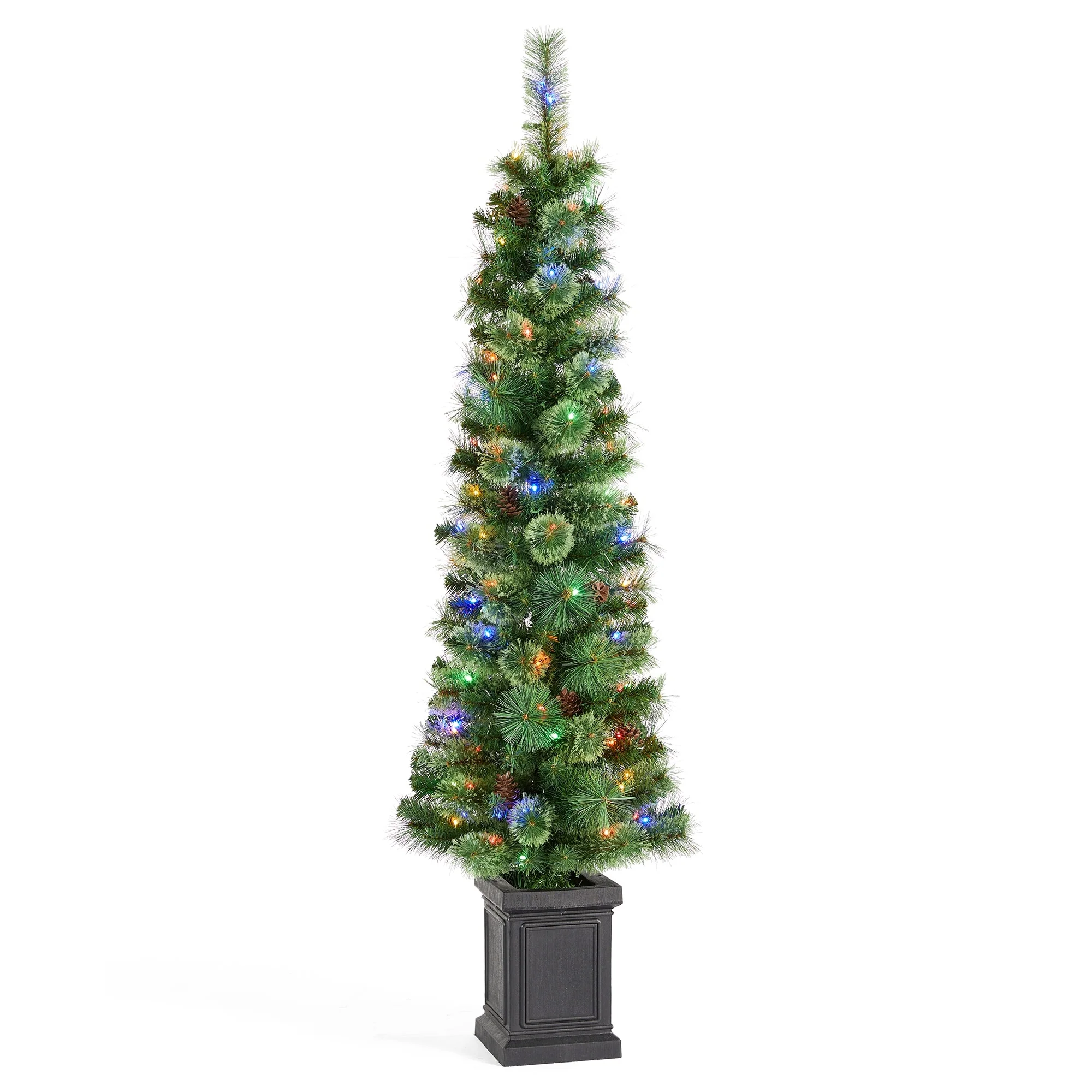 This 5ft/6ft/7ft mixed tips Pine Entrance Pot Tree with decorative square base is a welcoming addition to doorway, deck, porch or patio. It features snow sprinkled branches and is trimmed with pinecones. This tree is pre-lit with warm white lights that remain lit even if a bulb burns out. Display this attractive greenery in any indoor or covered outdoor location.