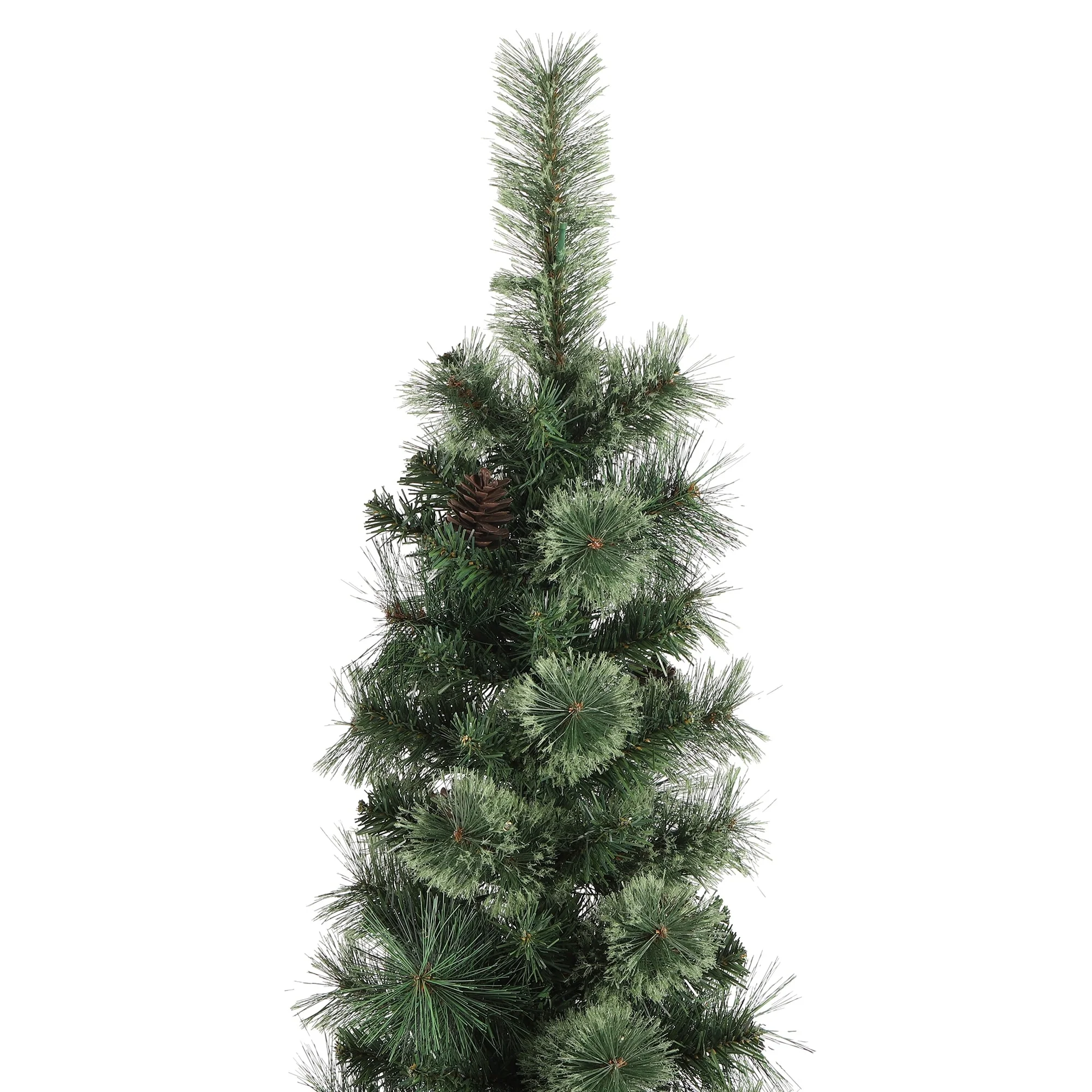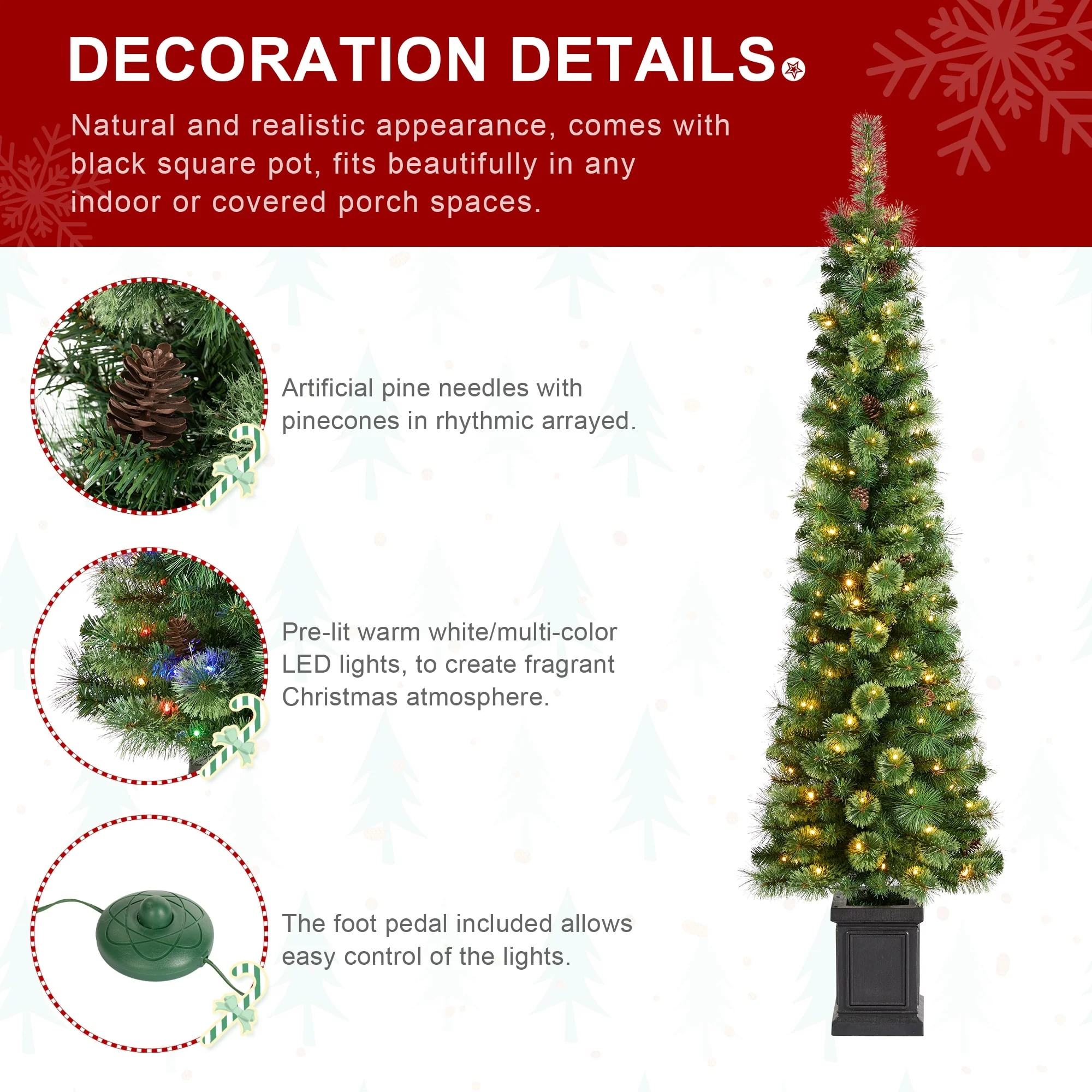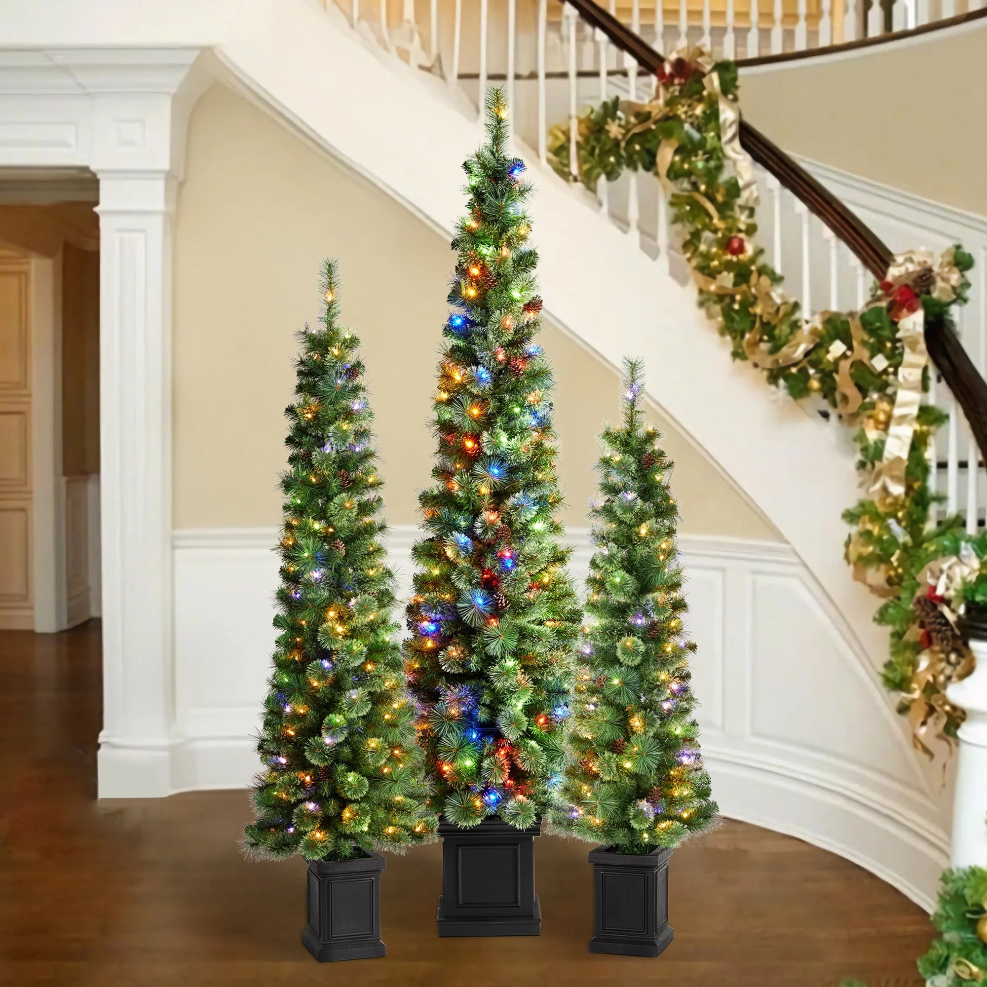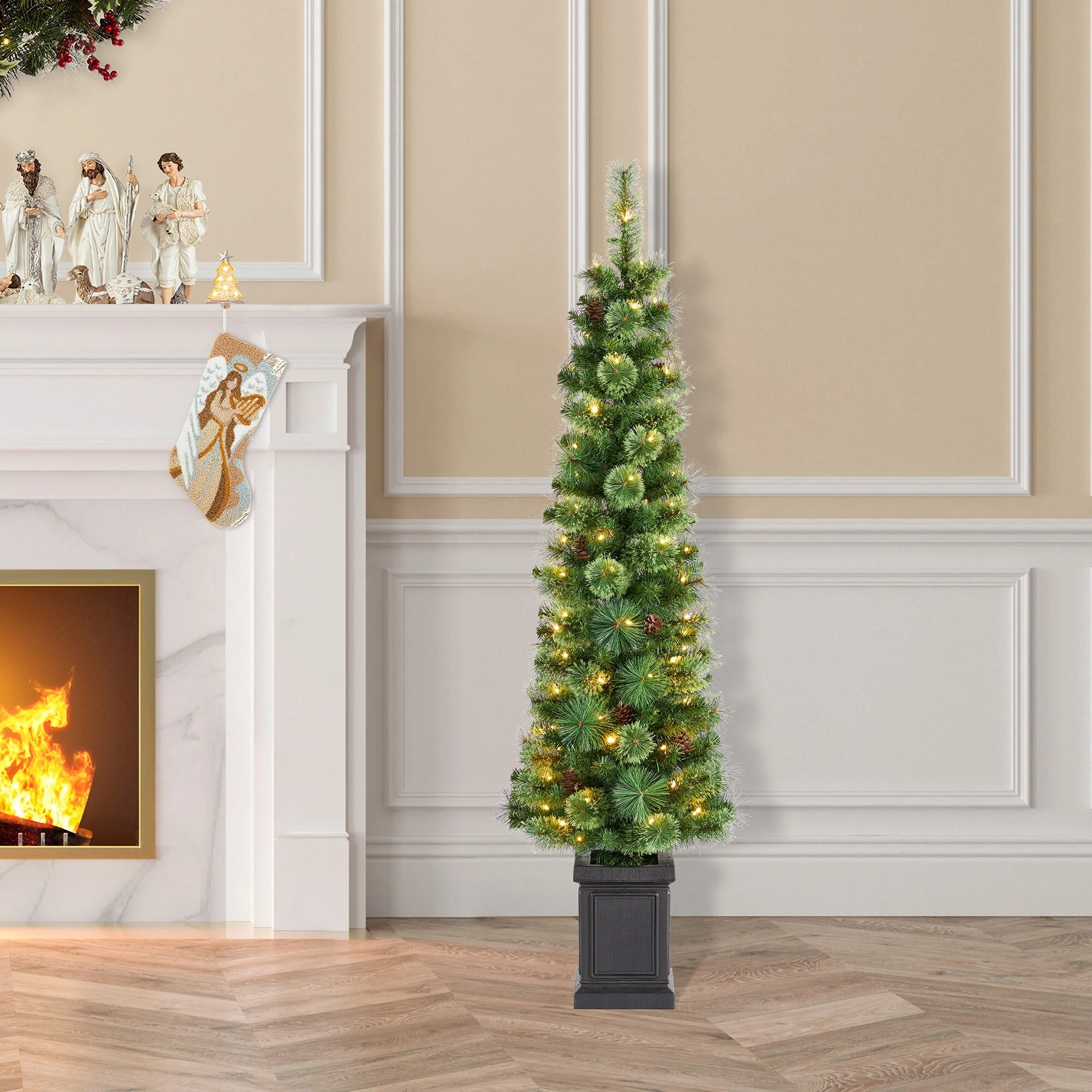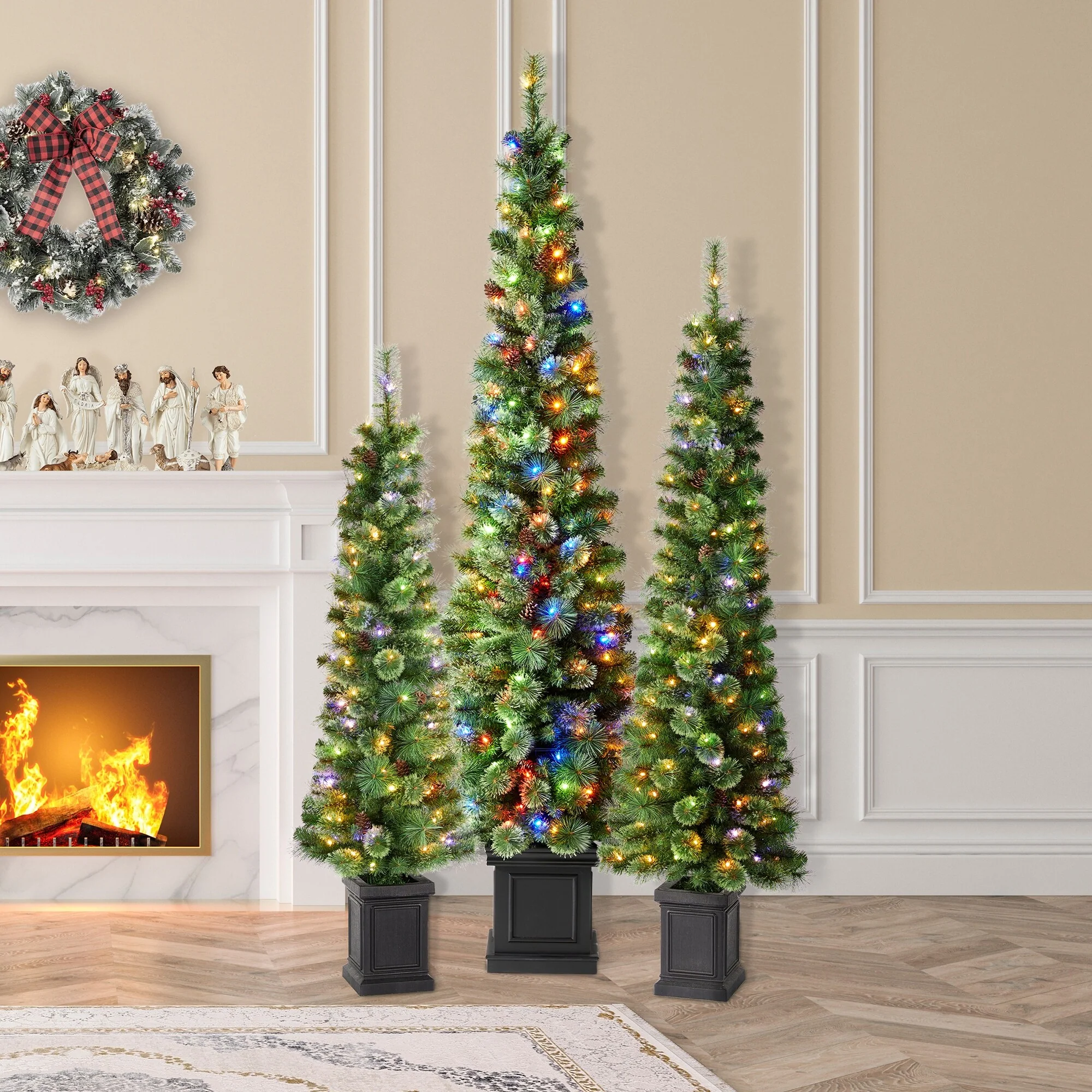 This 5ft/6ft/7ft mixed tips Pine Entrance Pot Tree with decorative square base is a welcoming addition to doorway, deck, porch or patio. It features snow sprinkled branches and is trimmed with pinecones. This tree is pre-lit with warm white lights that remain lit even if a bulb burns out. Display this attractive greenery in any indoor or covered outdoor location.