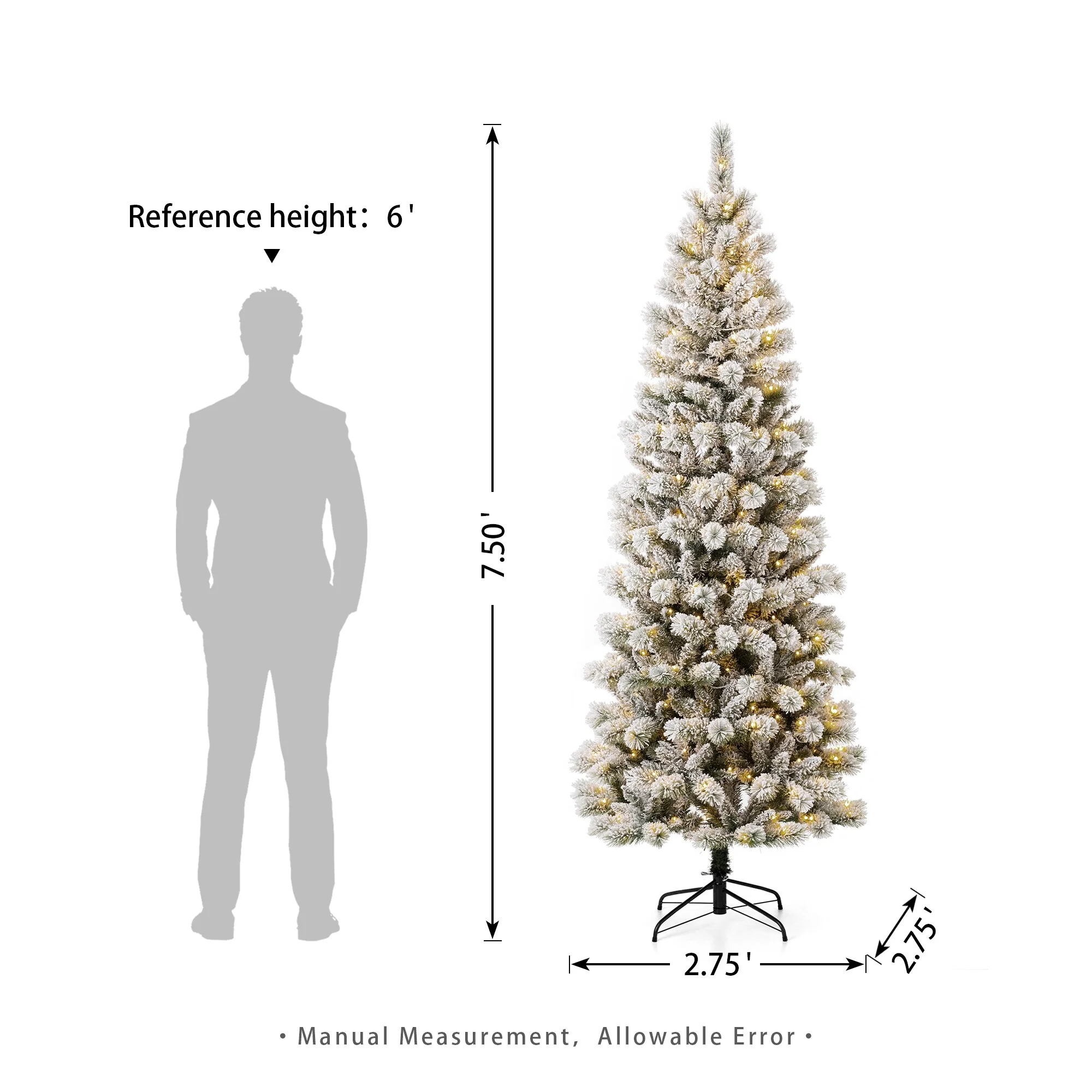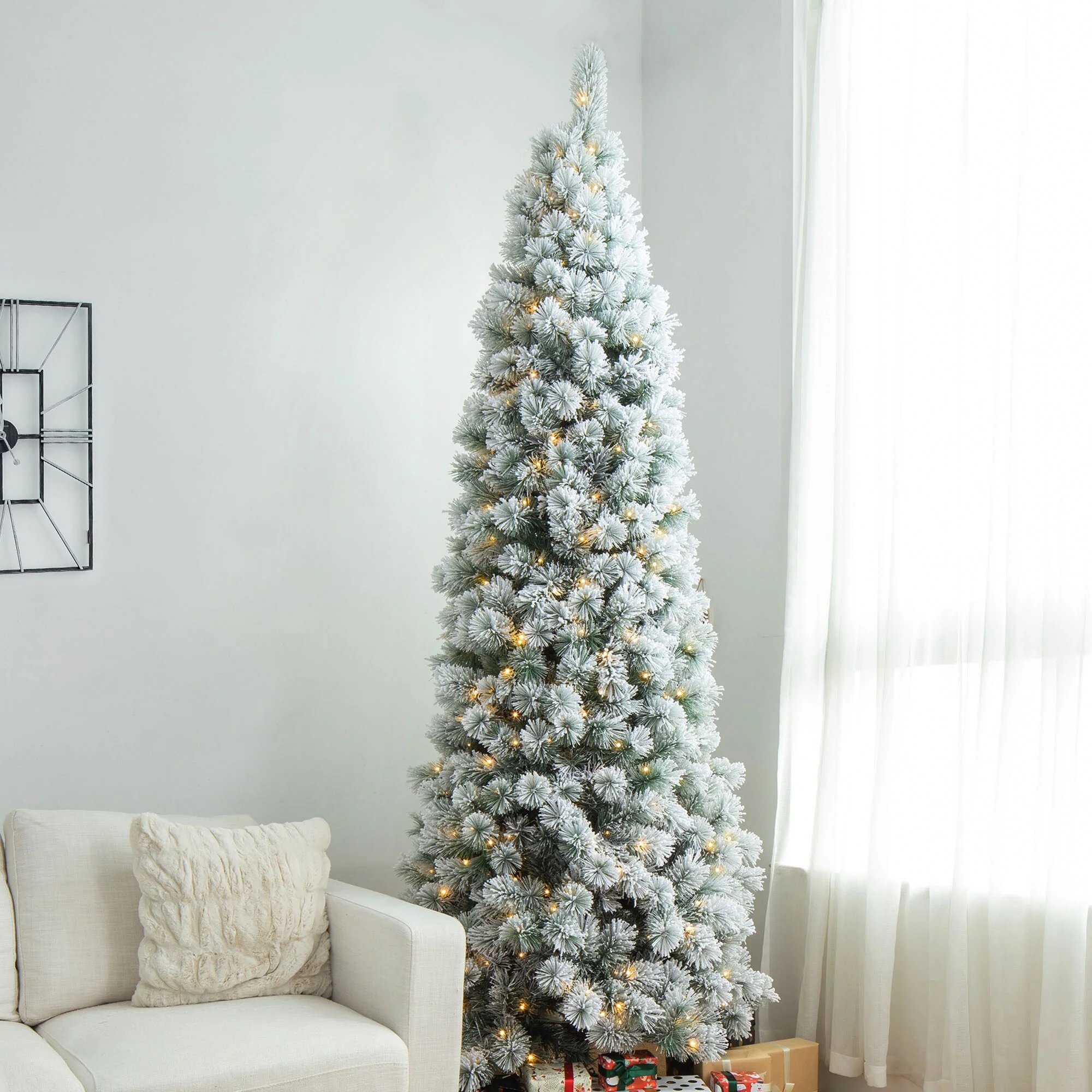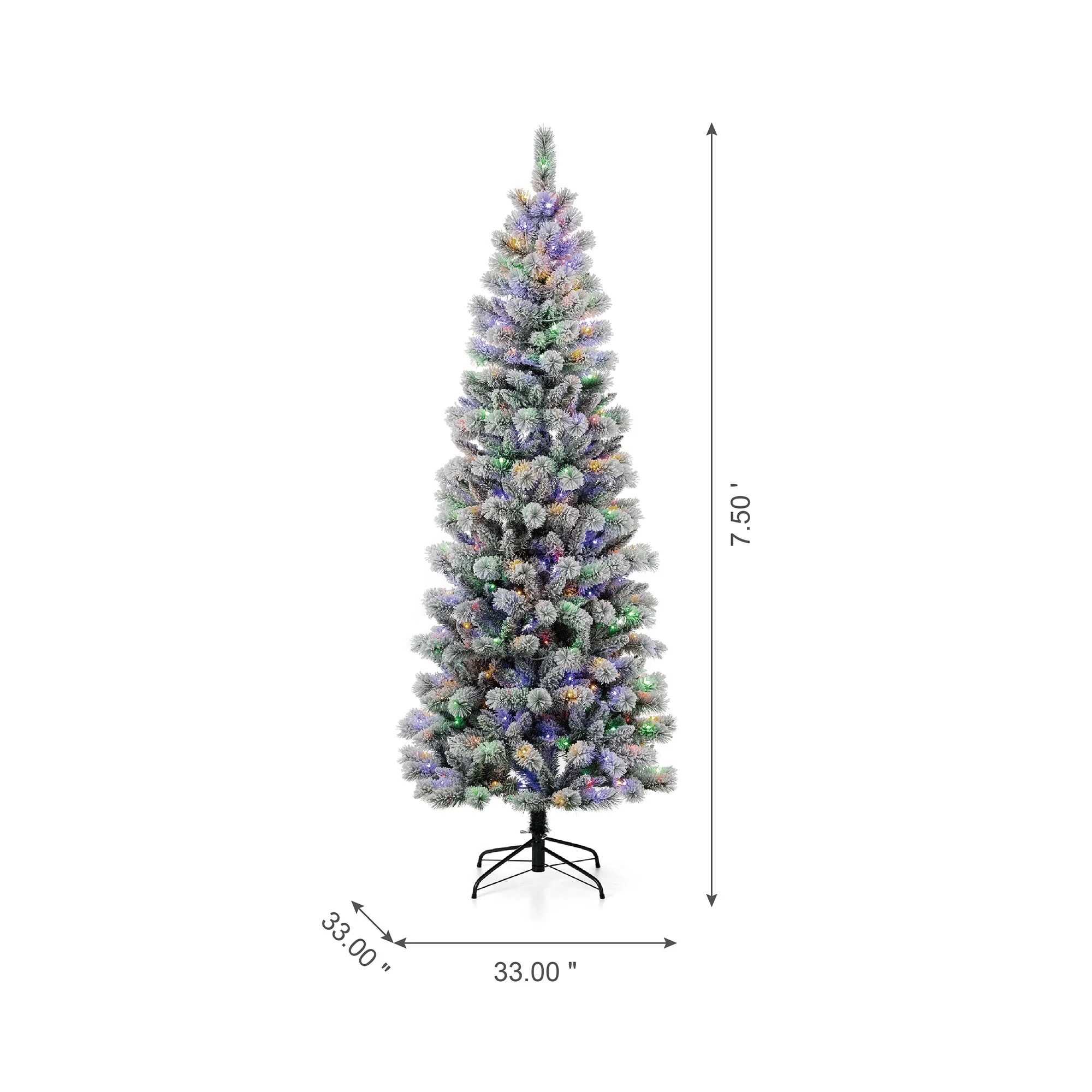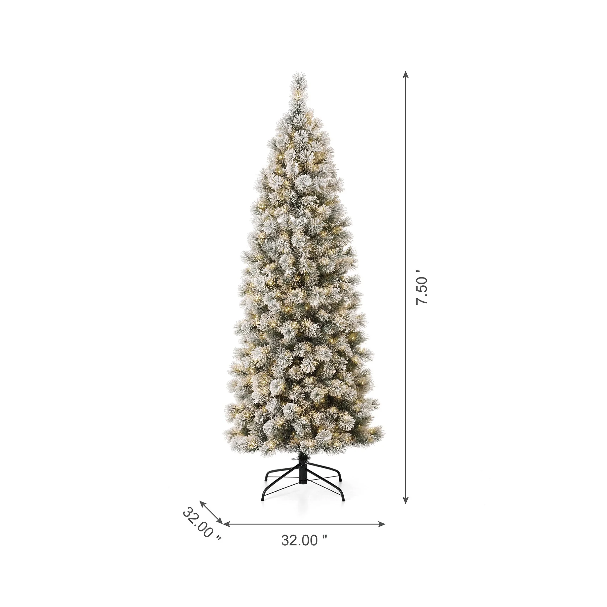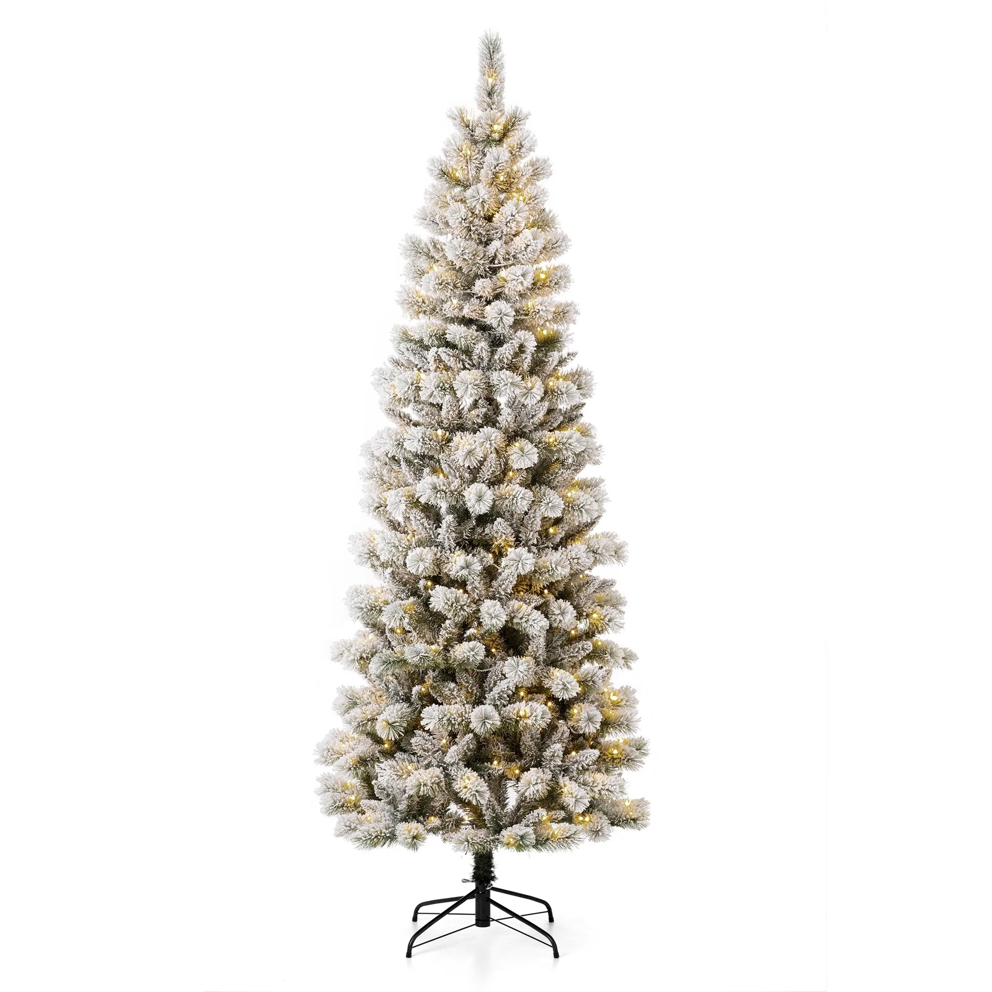 Create a winter wonderland in your home with the Glitzhome Pre-Lit Flocked Pine Artificial Christmas Tree. Made of PVC and metal, this tree has a realistic appearance and an elegant pencil pine style that fits beautifully in both large and small spaces. Choose between warm white or multi-color LED lights, with steady or color-changing settings, to create a festive ambiance. The hinged construction and easy assembly make decorating a breeze.