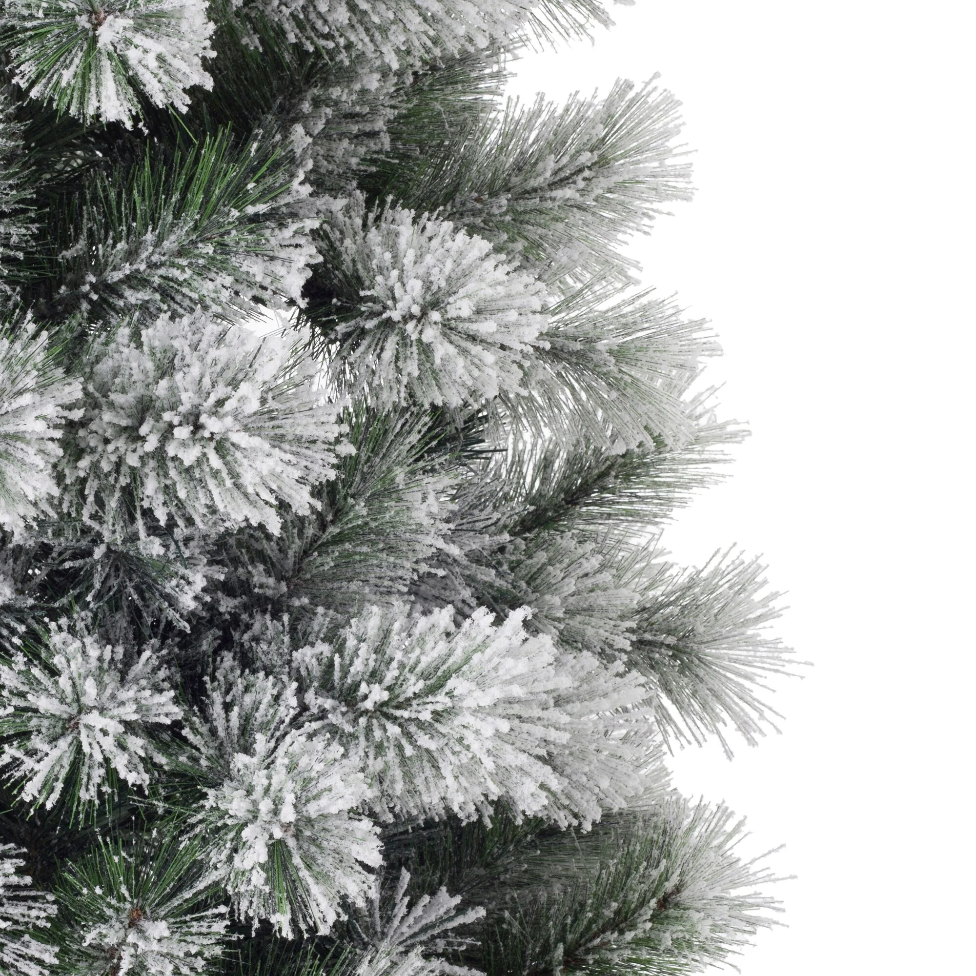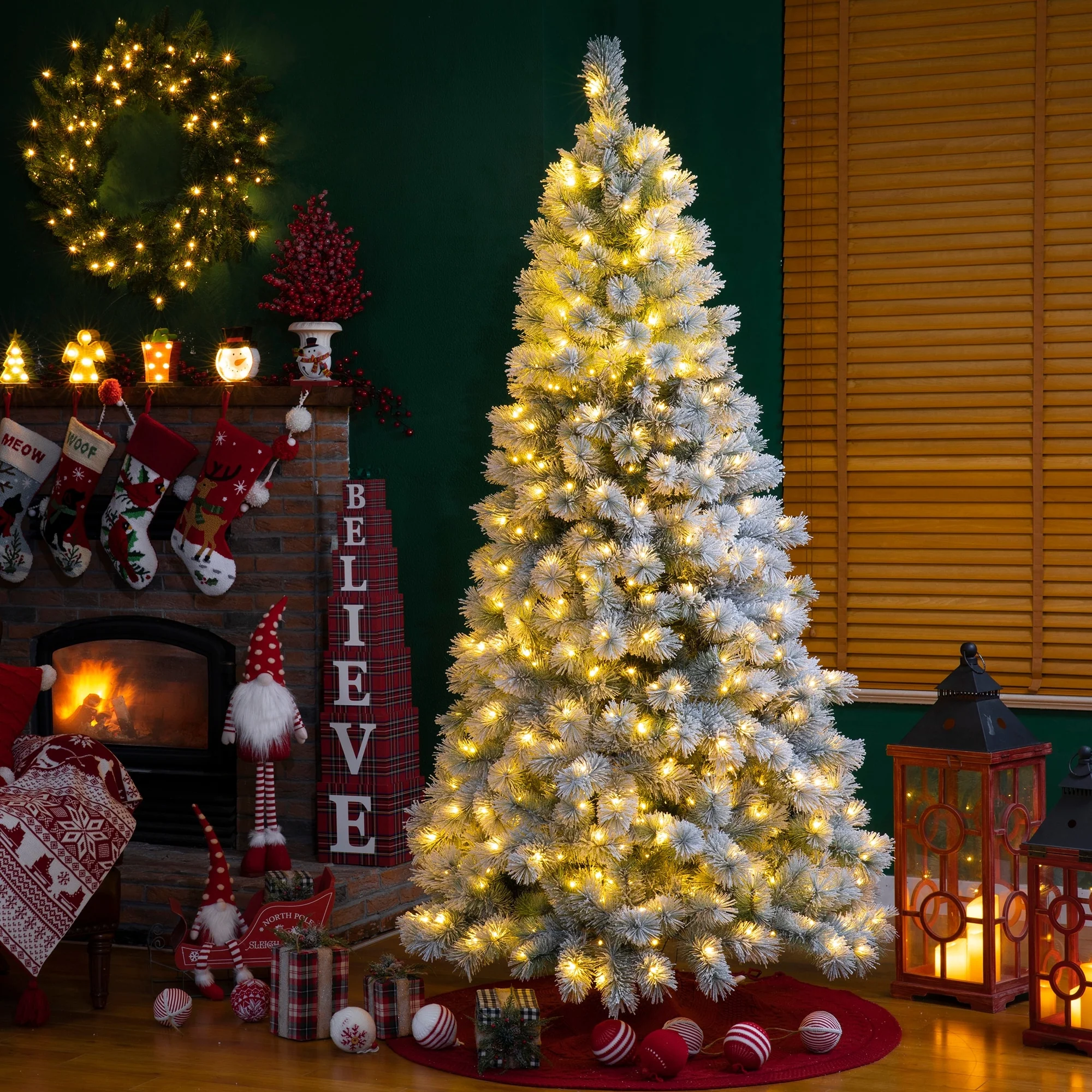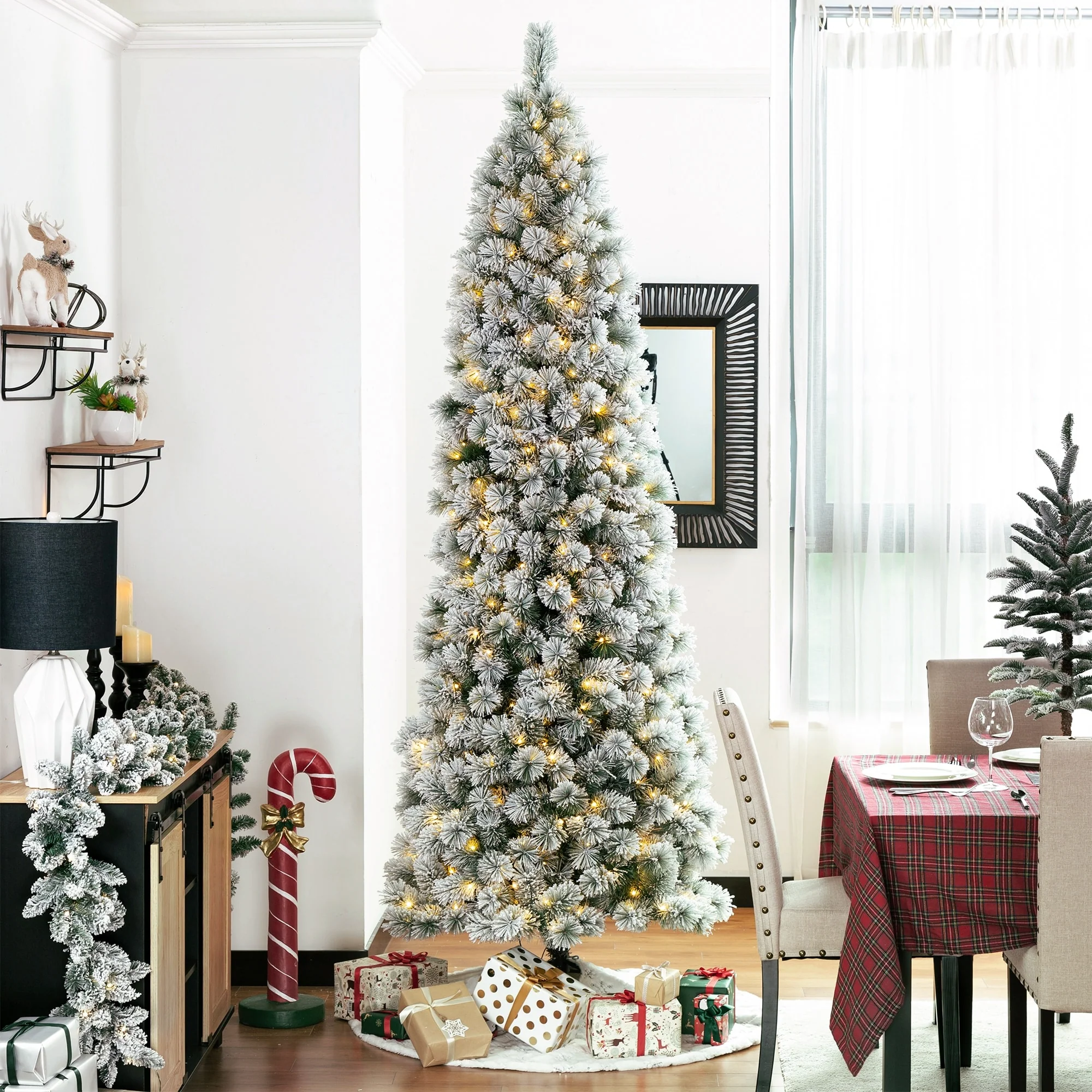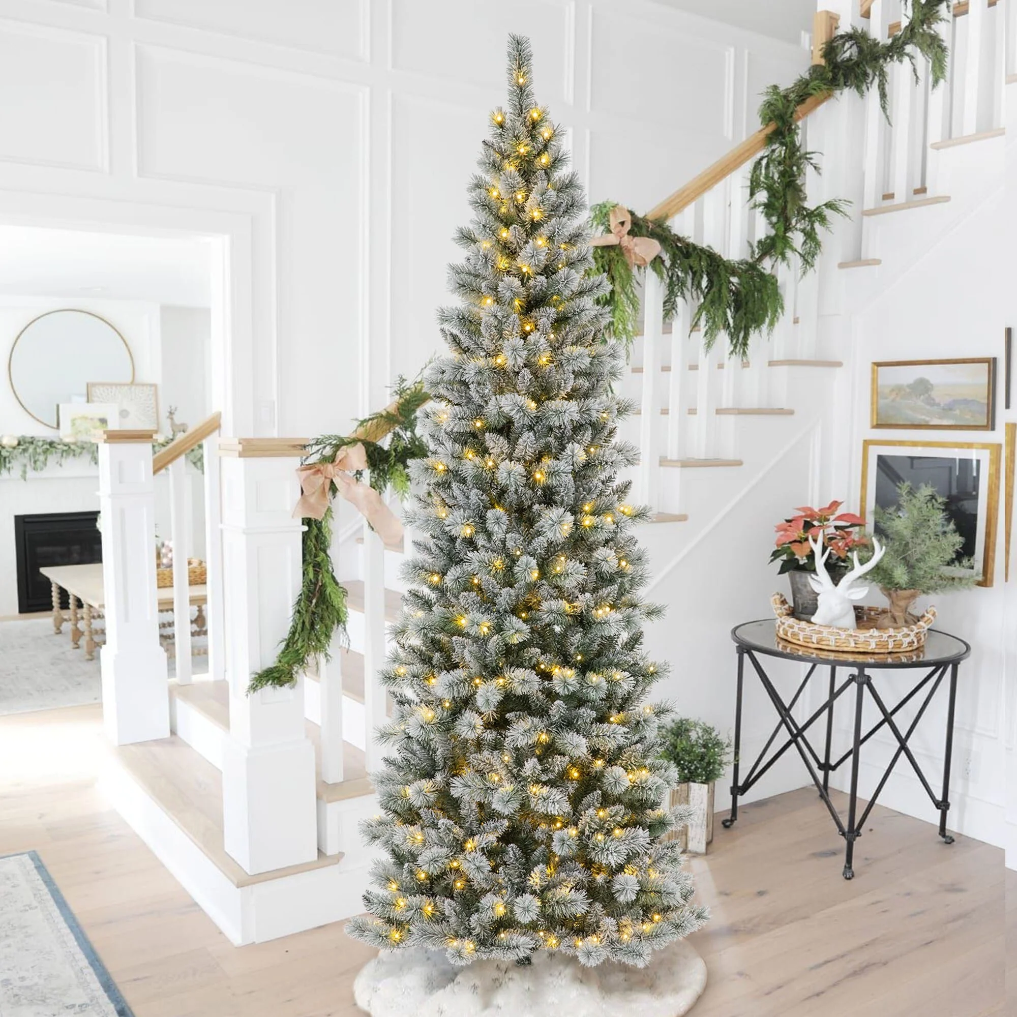 Create a winter wonderland in your home with the Glitzhome Pre-Lit Flocked Pine Artificial Christmas Tree. Made of PVC and metal, this tree has a realistic appearance and an elegant pencil pine style that fits beautifully in both large and small spaces. Choose between warm white or multi-color LED lights, with steady or color-changing settings, to create a festive ambiance. The hinged construction and easy assembly make decorating a breeze.
