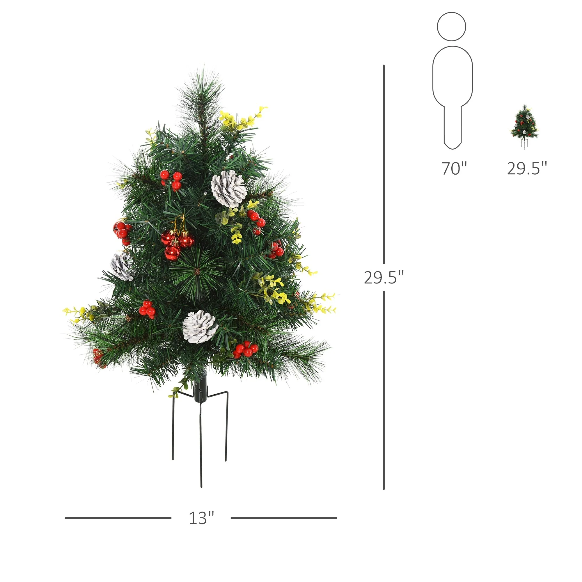 - Outdoor Christmas trees with red ornaments, mistletoe, pinecones, and small bright yellow flowers for a nature-like design