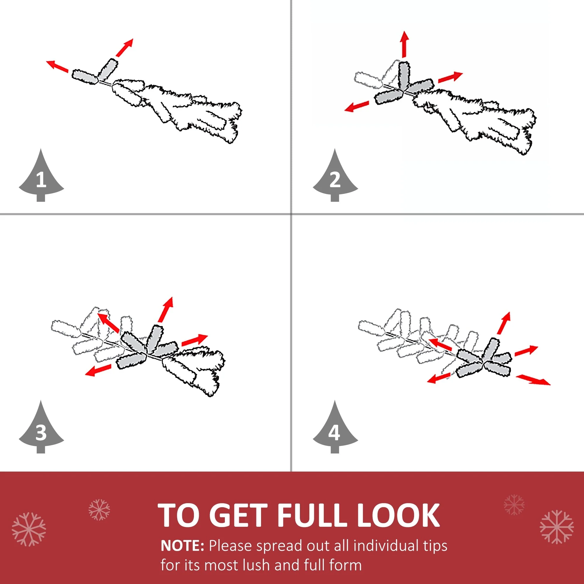 - To get a full and bushy appearance, please remove and spread out all individual tips to get the best possible look from the faux Christmas tree