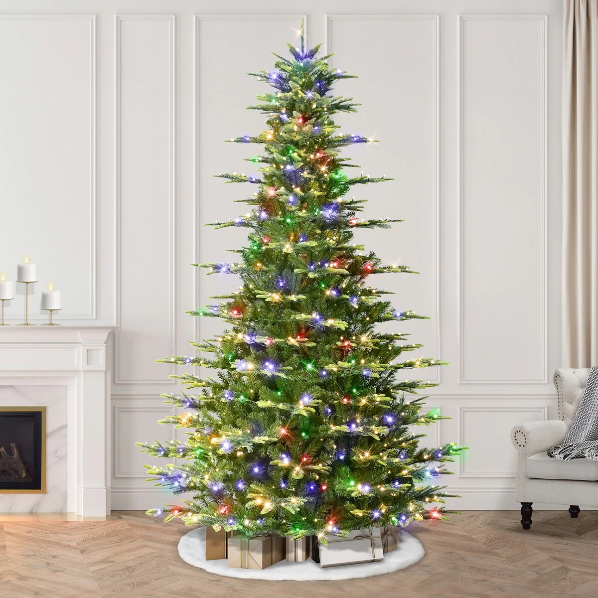 - ELEGANT ARTIFICIAL CHRISTMAS TREE: Features green branches and 800 Dual-Color LED lights that can be switched between multi and clear lights with a convenient foot pedal to brighten your home for a dazzling Christmas display.