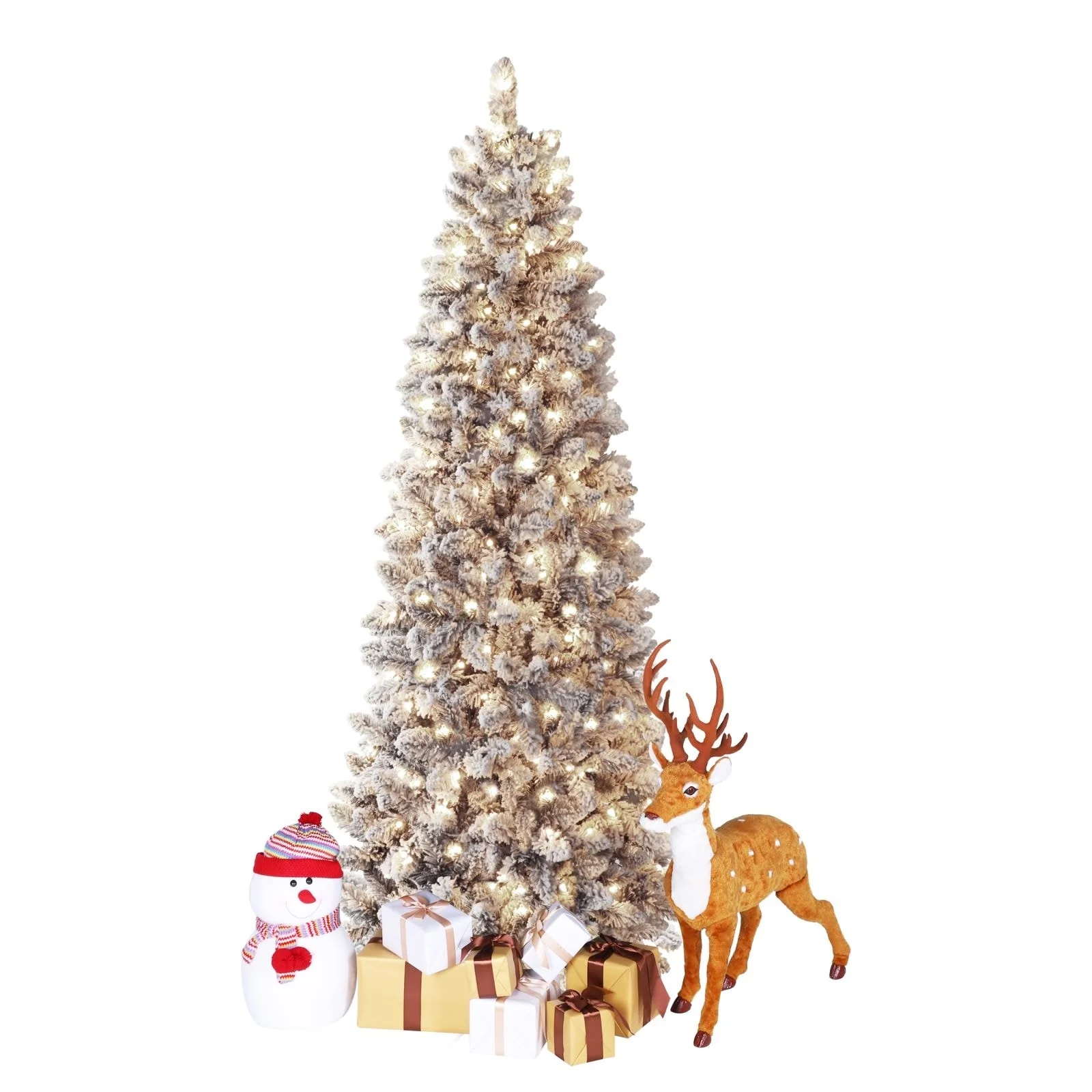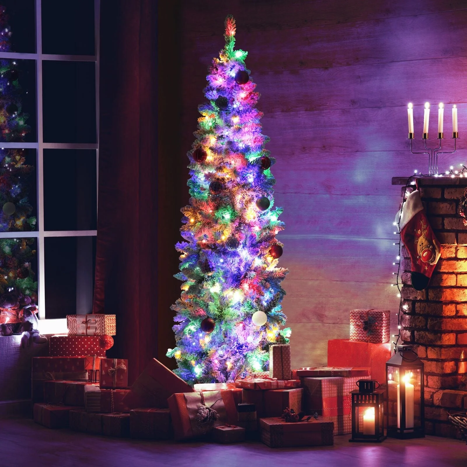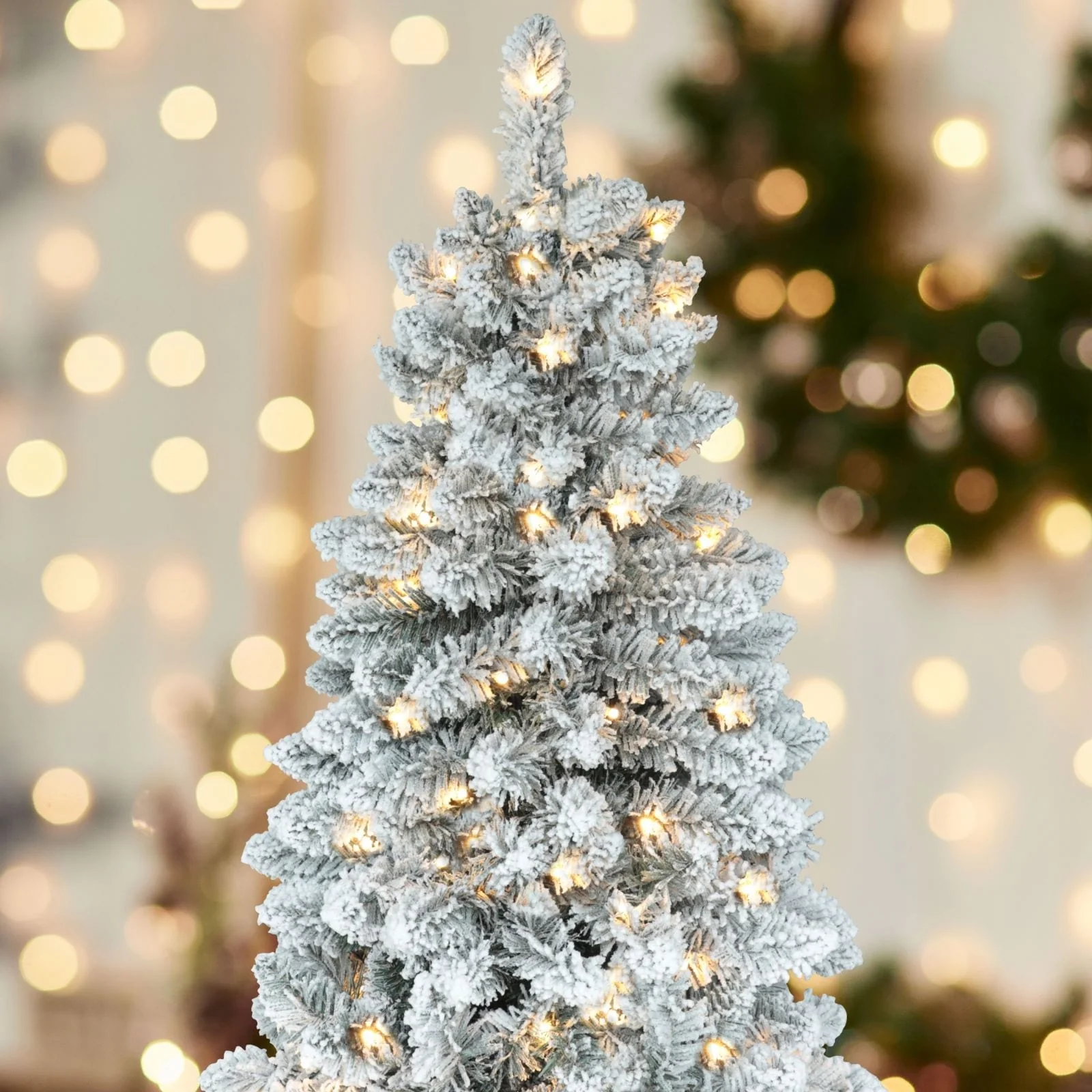 - This snow-flocked pencil Christmas tree with warm white/multi-color lights