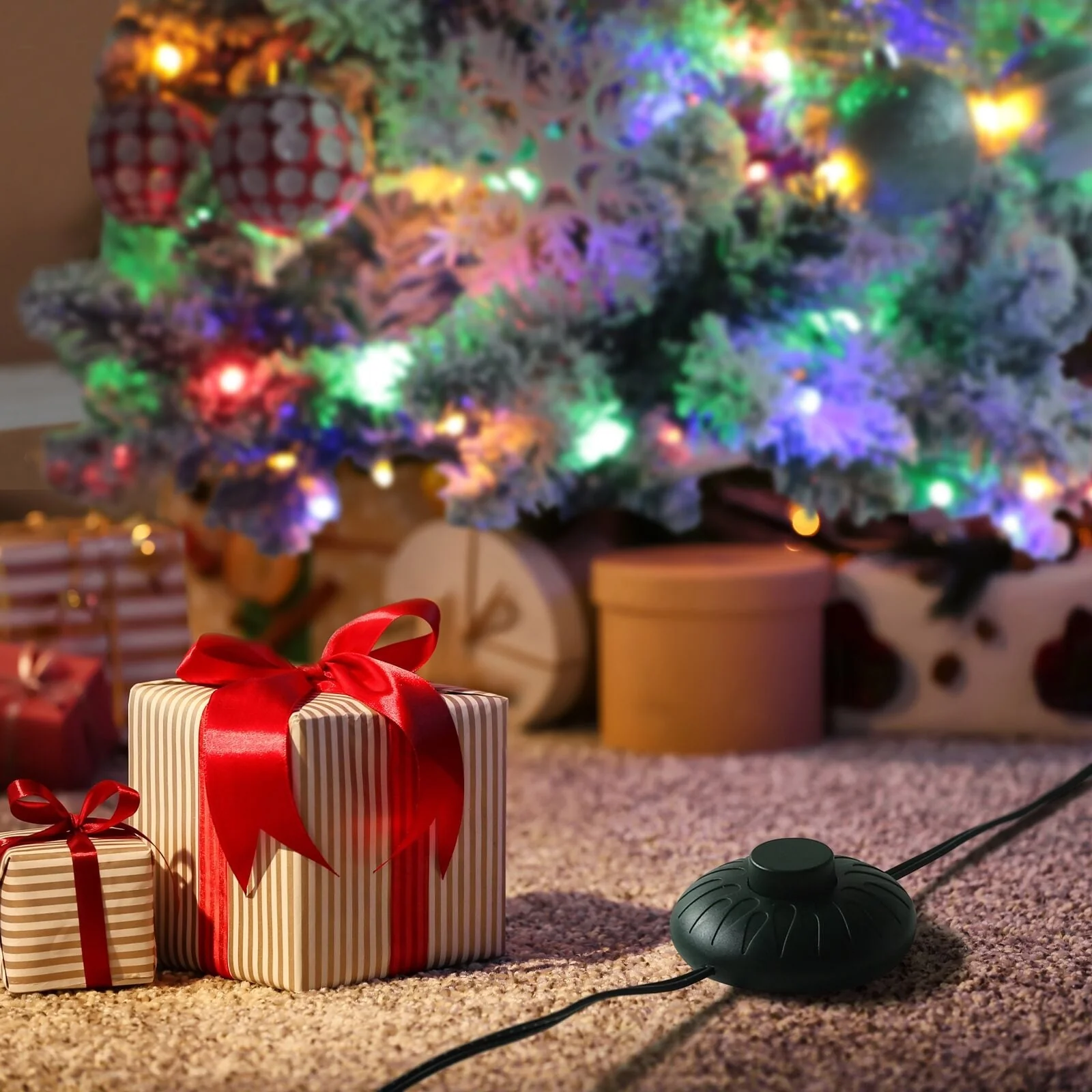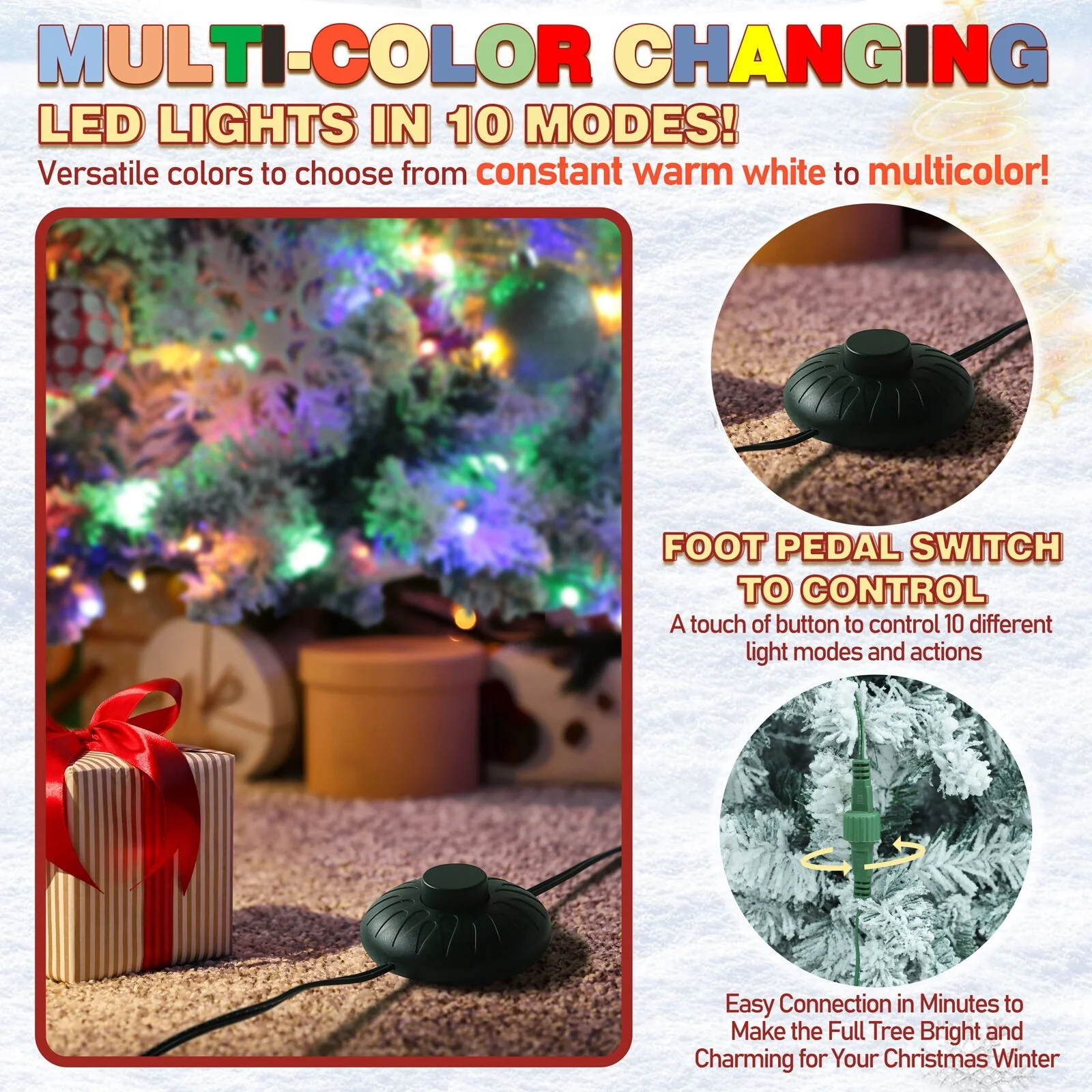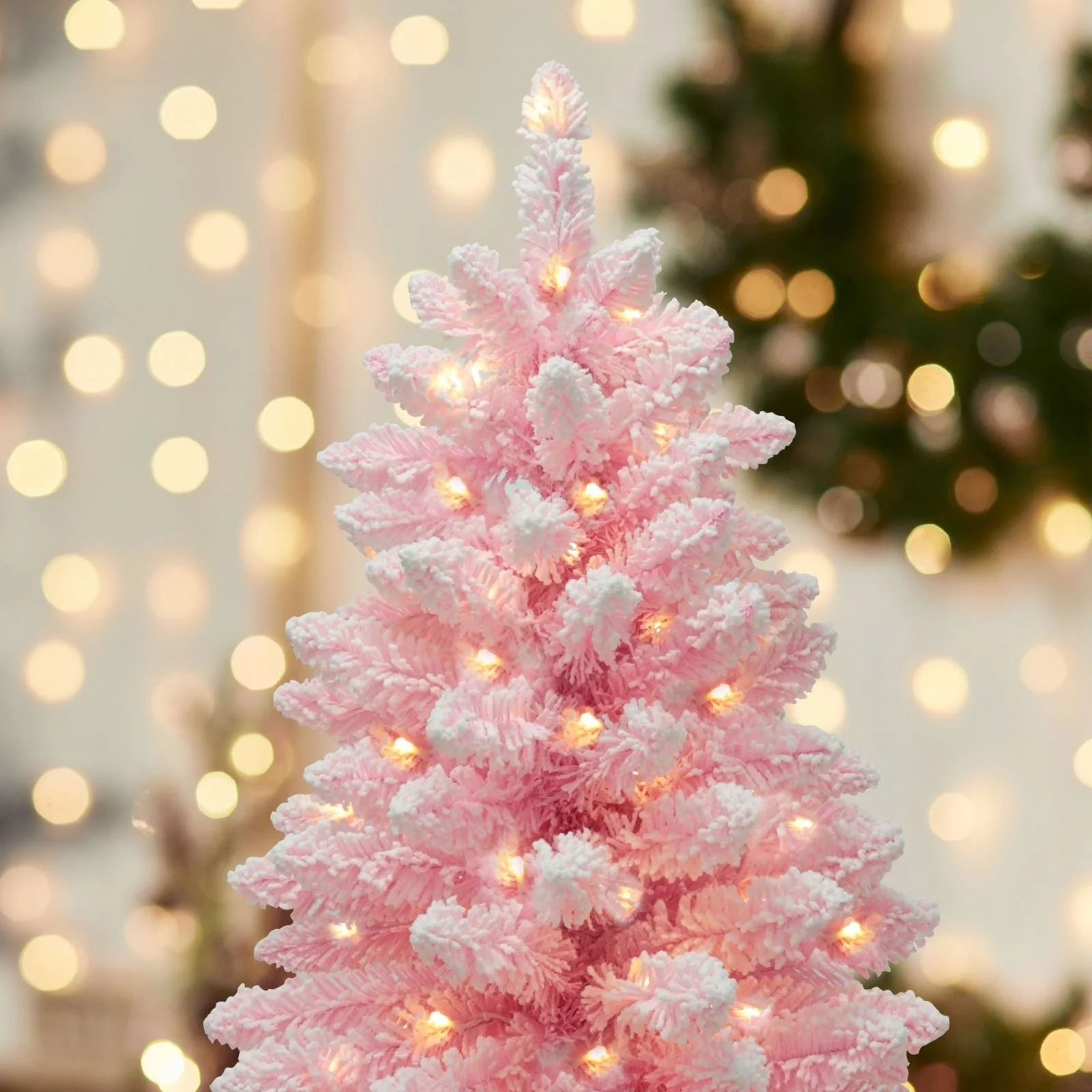 - This snow-flocked pencil Christmas tree with warm white/multi-color lights