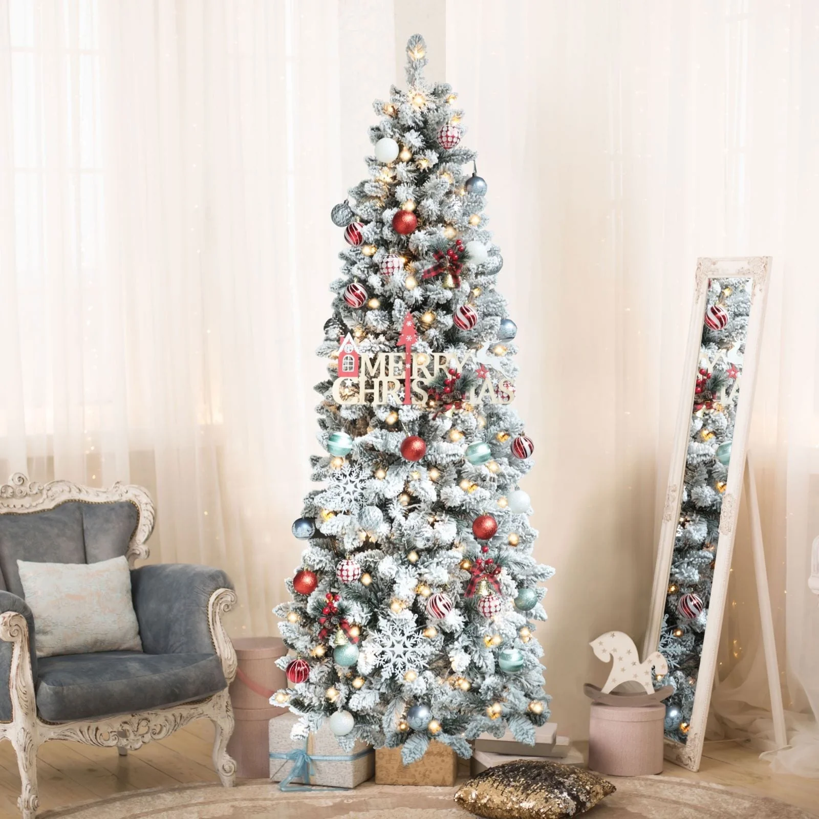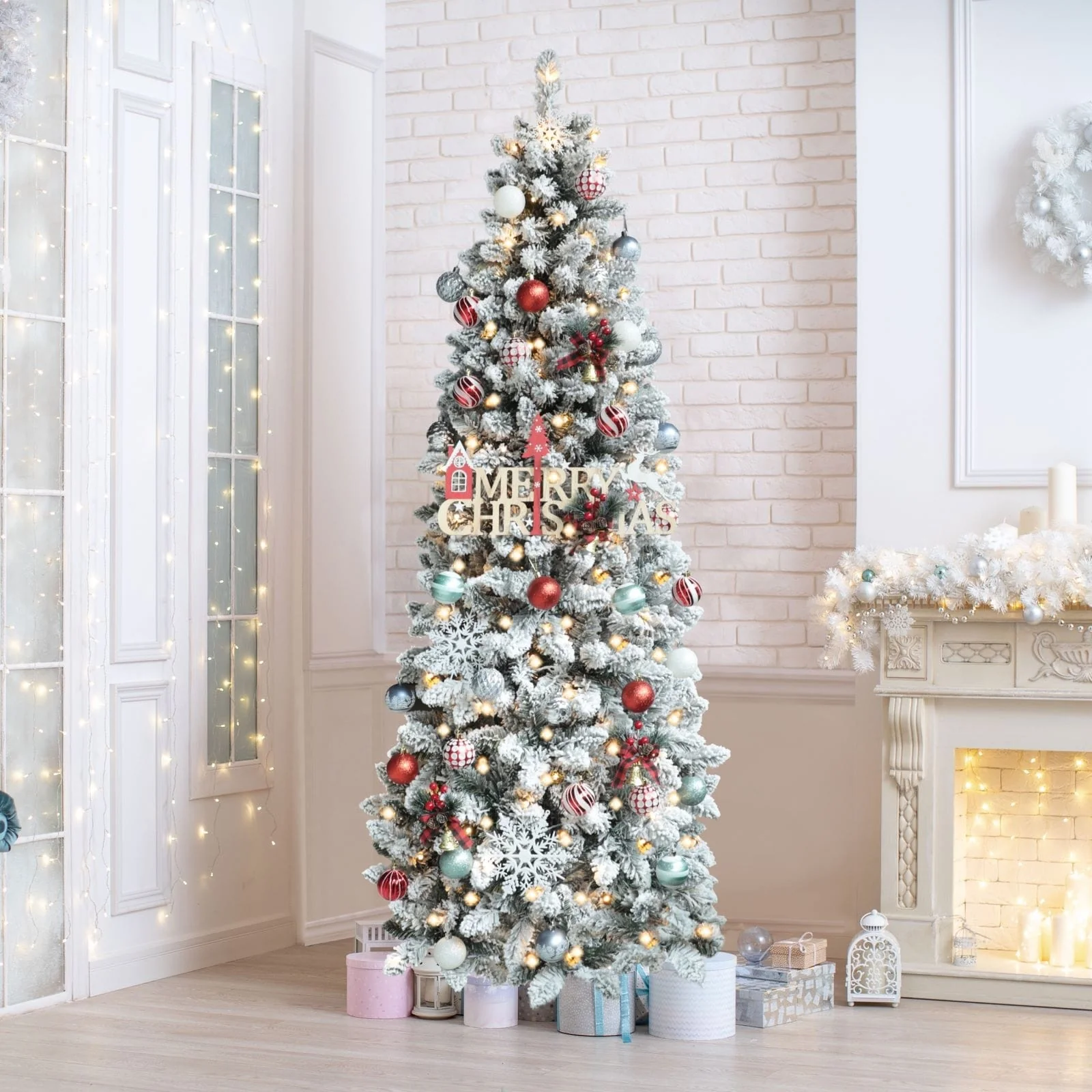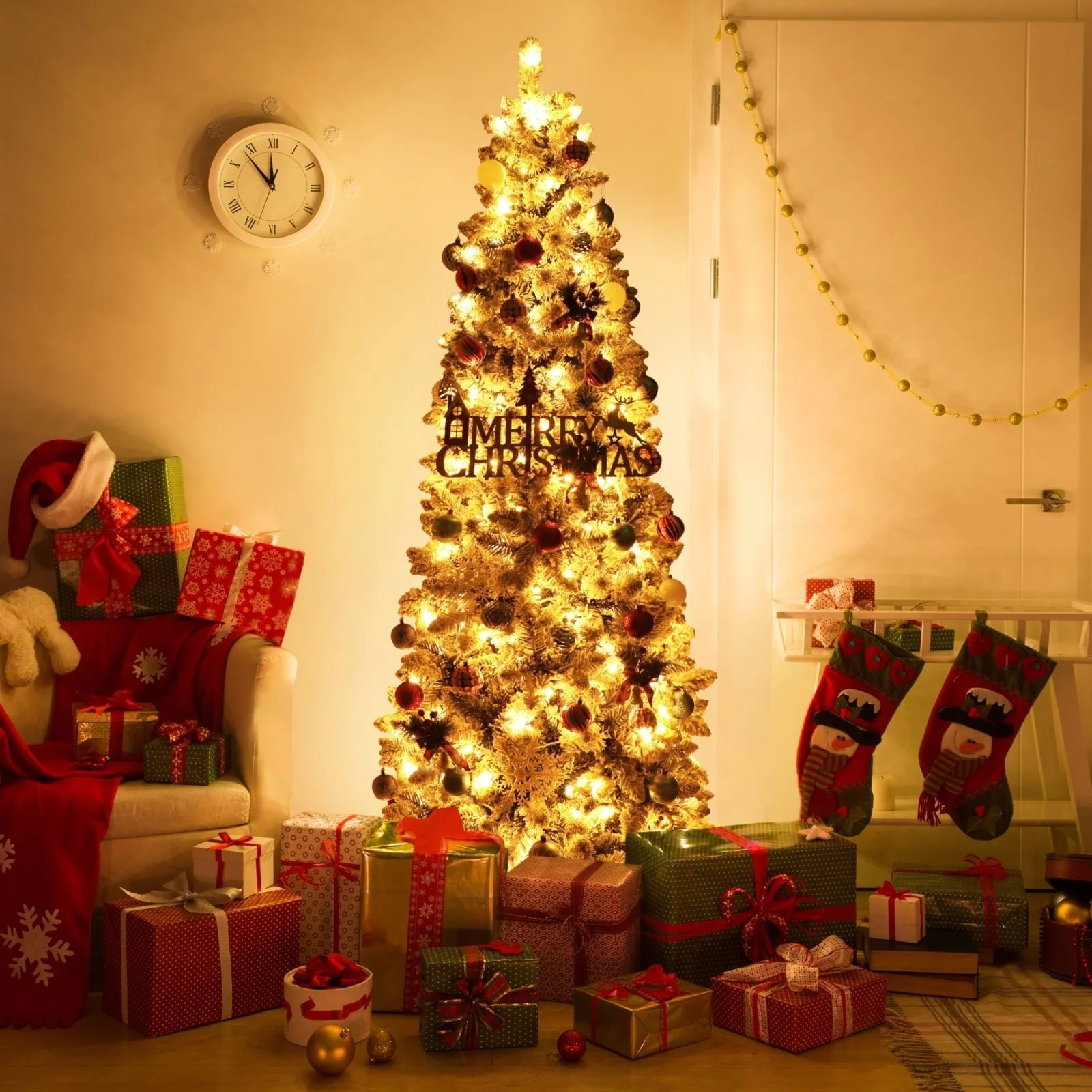 This pre-lit pencil Christmas tree with lights can add your home the best holiday atmosphere, transferring coziness and happiness to your room through the whole Christmas holidays. Feel free to add more decorations to this pre-lit flocked pencil Christmas tree. Warm white LED lights, bright and charming, coupled with realistic pine branches, showing elegance. The Christmas tree also comes with metal screws and a foldable base for safety and security. There's also a non-slip foot mat design at the bottom that helps keep the tree in place and your floor won't scratch. This is the right pre-lit pencil flocked Christmas tree with white snow if you are looking for something durable, non-toxic, environmental-friendly and reusable for the next few years.