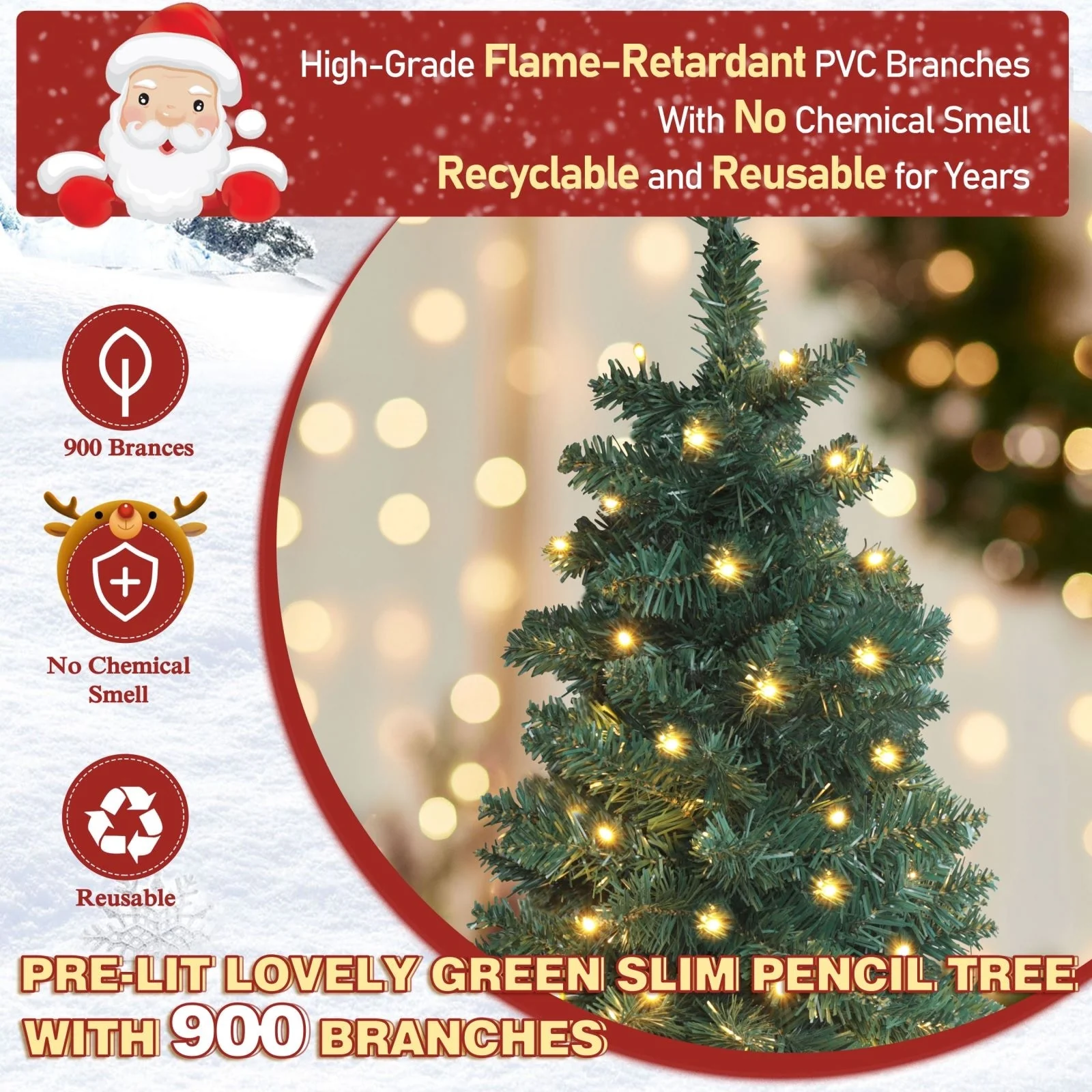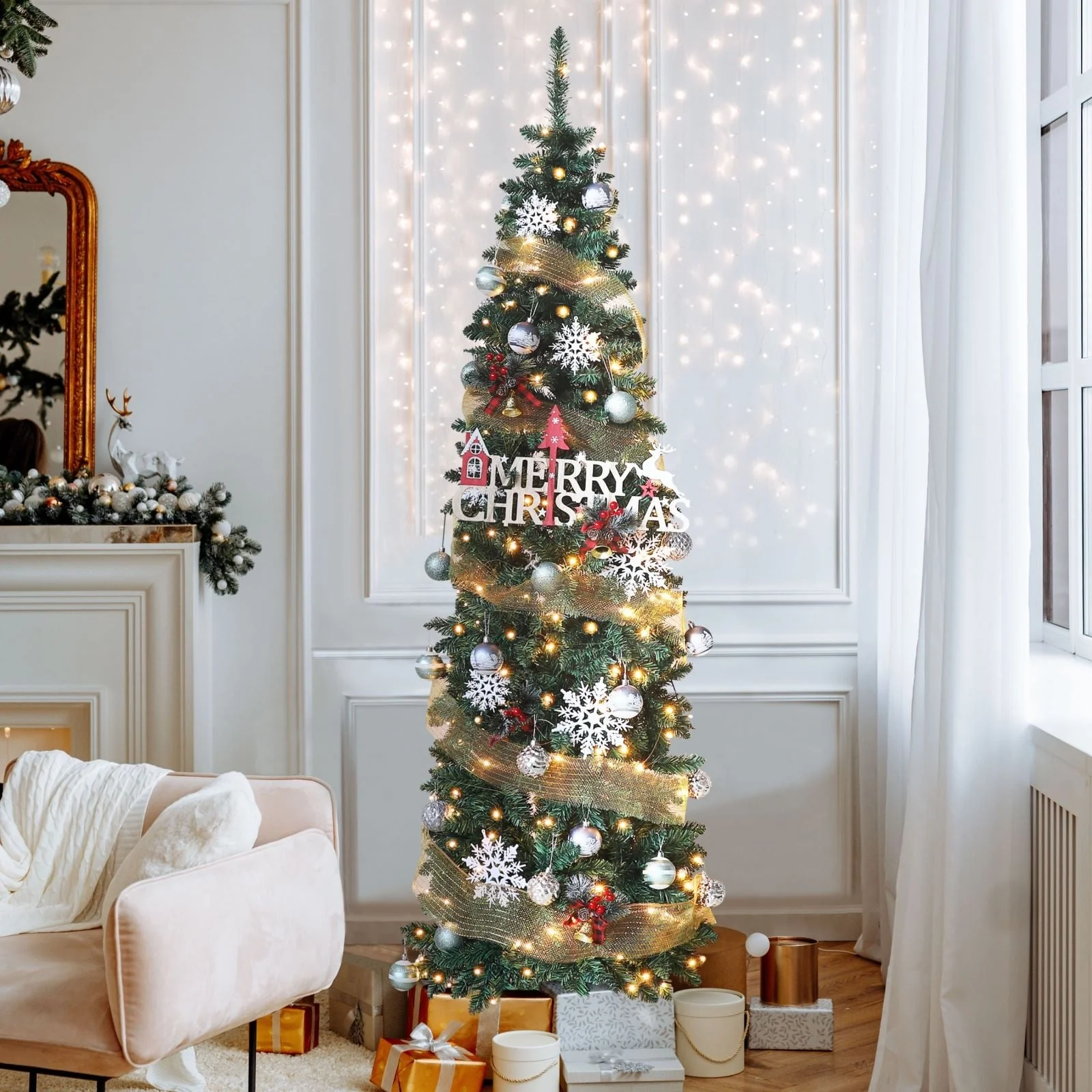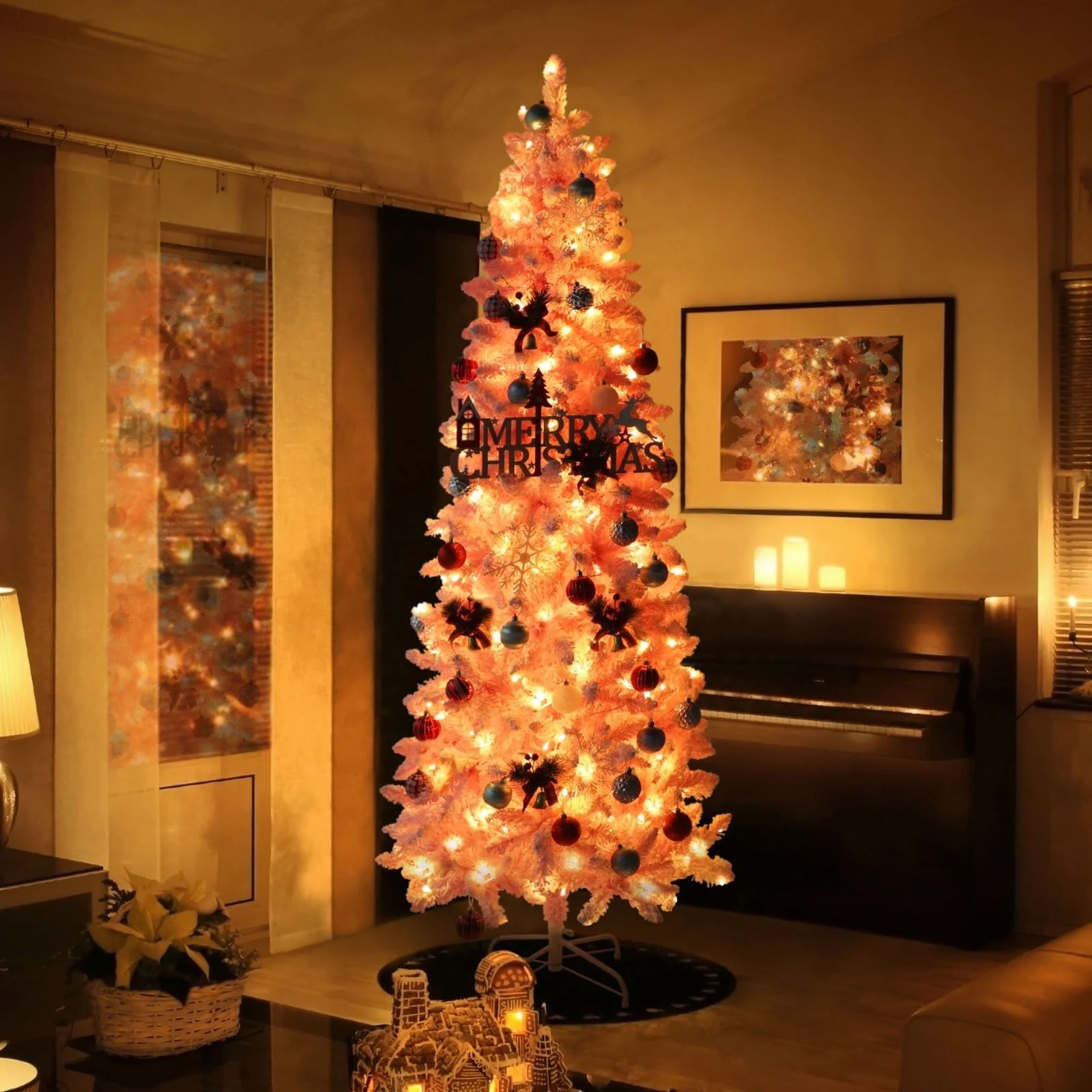 This pre-lit pencil Christmas tree with lights can add your home the best holiday atmosphere, transferring coziness and happiness to your room through the whole Christmas holidays. Feel free to add more decorations to this pre-lit flocked pencil Christmas tree. Warm white LED lights, bright and charming, coupled with realistic pine branches, showing elegance. The Christmas tree also comes with metal screws and a foldable base for safety and security. There's also a non-slip foot mat design at the bottom that helps keep the tree in place and your floor won't scratch. This is the right pre-lit pencil flocked Christmas tree with white snow if you are looking for something durable, non-toxic, environmental-friendly and reusable for the next few years.