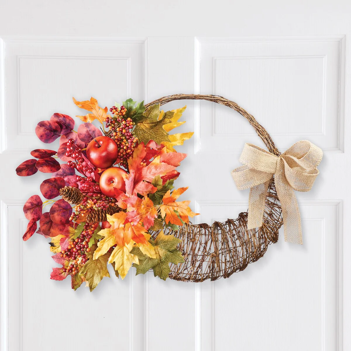 The cornucopia shaped wreath overflows with a harvest of Autumn colored leaves, fruits, berries and pinecones. It's lovely on your front door or anywhere in your home to celebrate the season. Easy to hang, and is finished with a burlap bow. Vine, polyfoam and polyester. 24'L x 16'H.