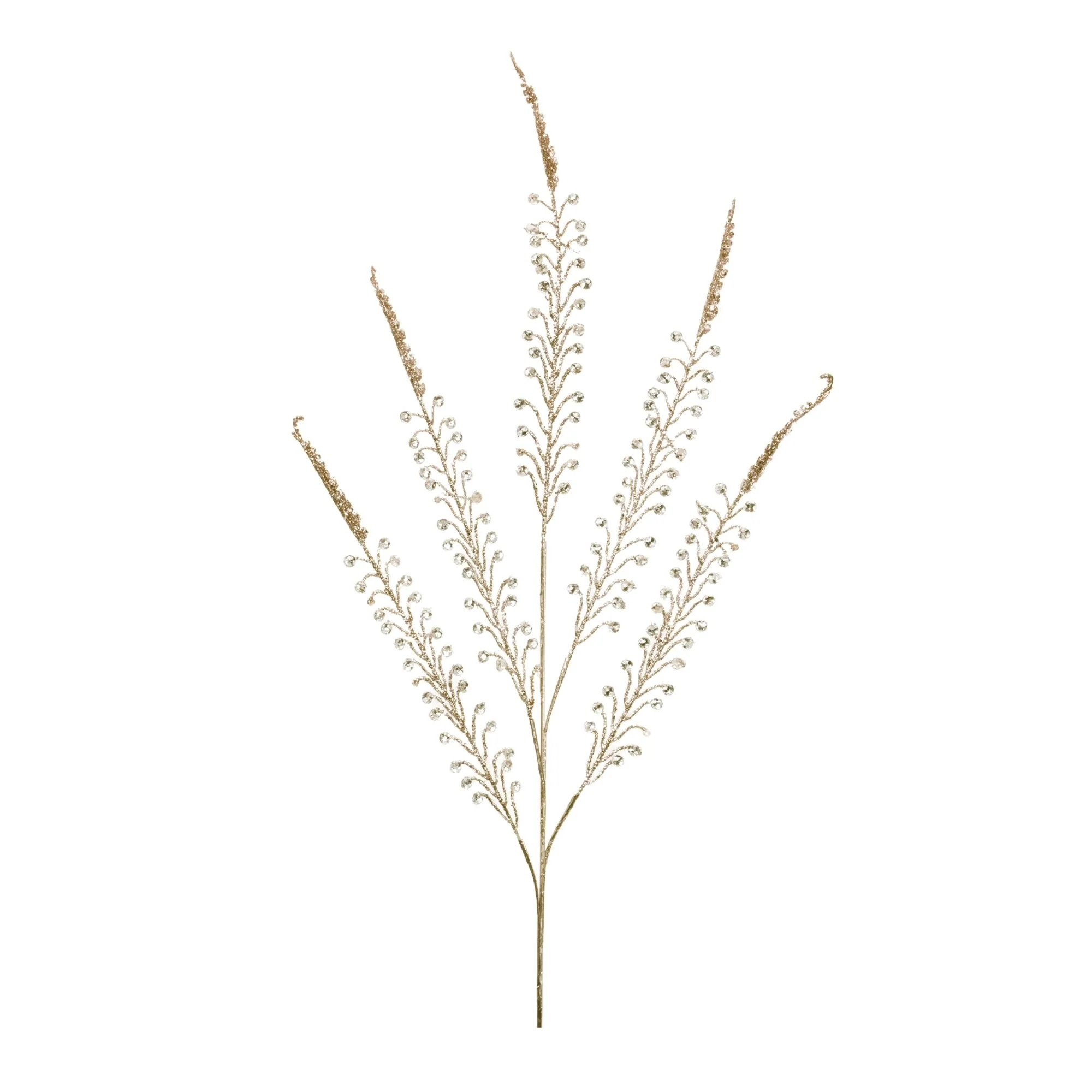 Add elegance and sparkle to your holiday décor with this stunning gold beaded fern spray set. Showcasing rich gold and champagne tones with a refined glittered finish, each spray delivers a luxurious shimmer to your festive arrangements. The detailed fern leaf design adds a touch of sophistication, making it perfect for accenting Christmas trees, wreaths, garlands, or centerpieces. A beautiful way to elevate your seasonal style with timeless charm.