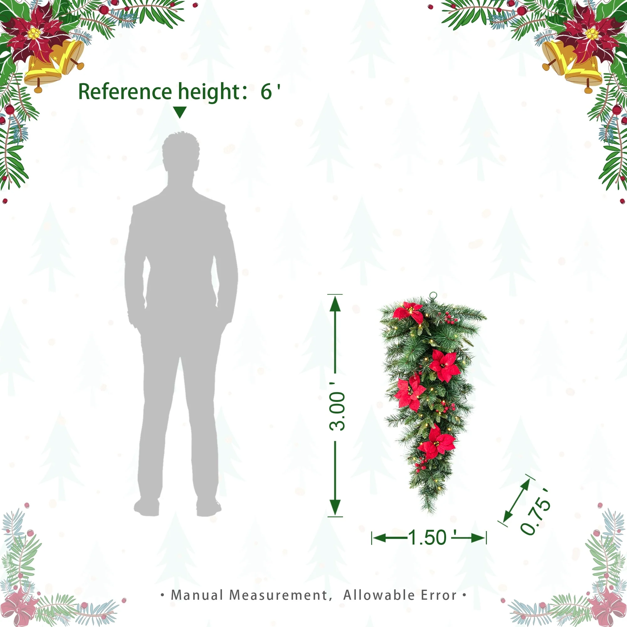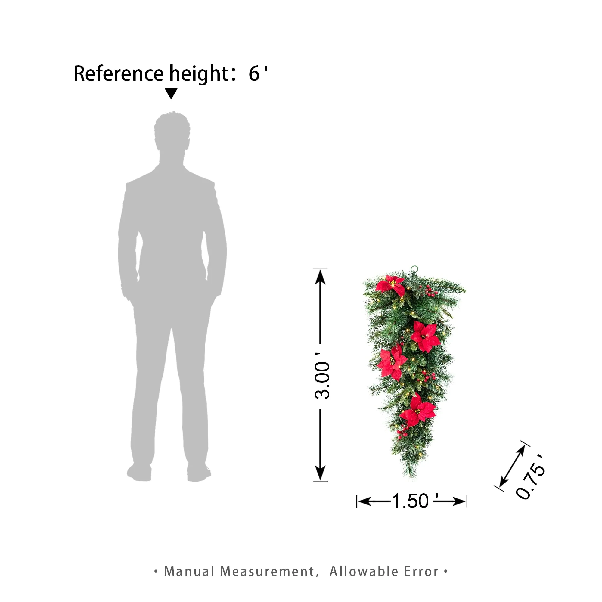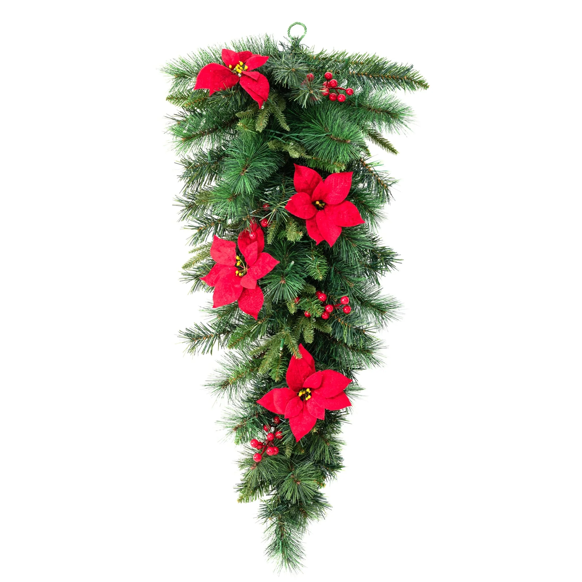 The 3ft mixed tips pine teardrop swag and the 3ft greenery mixed tips pine teardrop swag showcase a festive design that's ideal for creating a Christmas feel on doors or above mantels.Created with artificial pine, red berries, red poinsettias and pinecones. Very romantic snow gradient on pine needles creates a winter wonderland around your home. Product may ship compressed -You can adjust all the branches with an elegant look like the images.