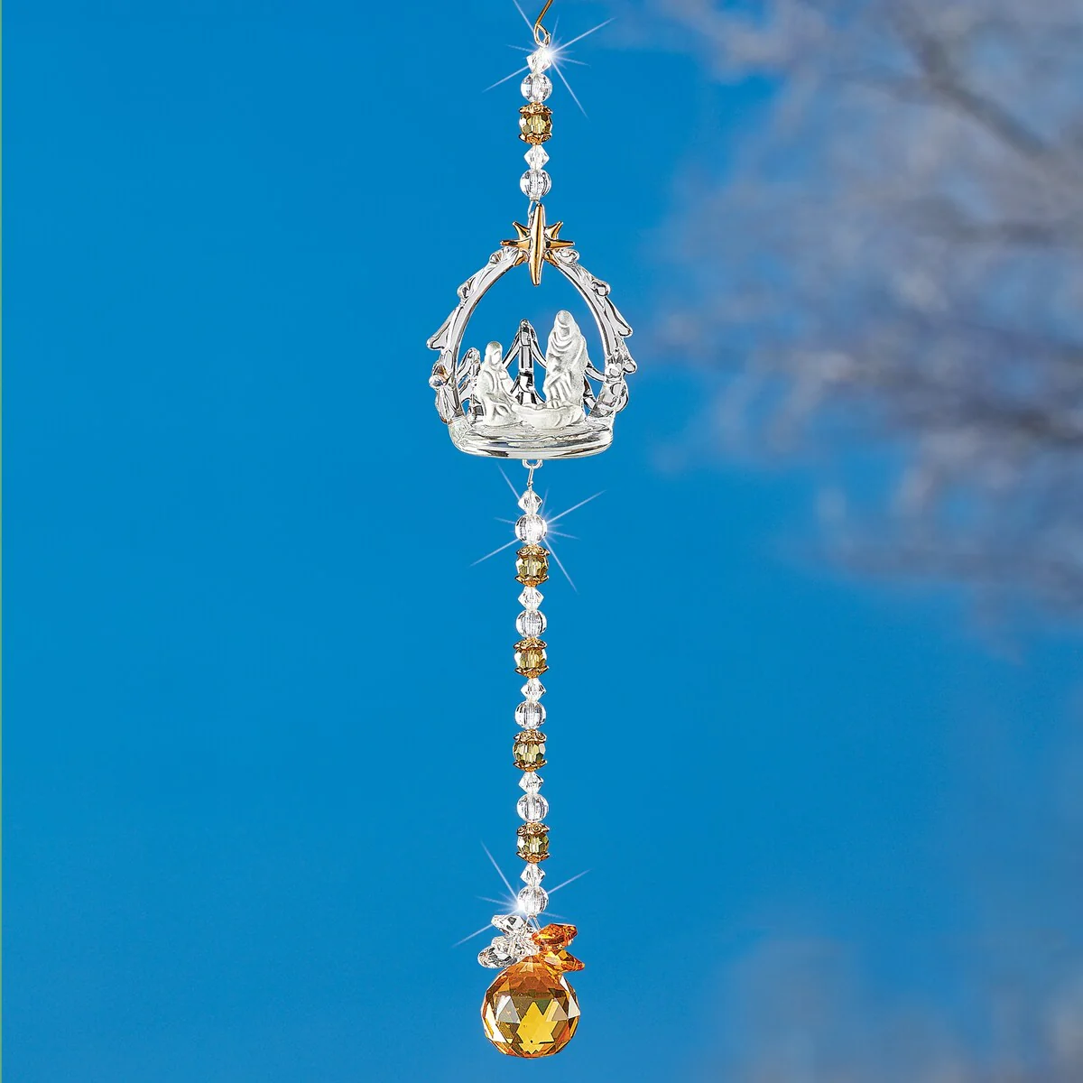 With a beautiful Nativity scene in the center, this suncatcher makes a stunning addition to a sunny window. The center design sparkles in the sun, and the faceted beads below cast a rainbow of glistening light around the room. Hook at the top makes hanging easy. Glass, acrylic and iron. 2 1/4'Dia. x 14 1/2'H.