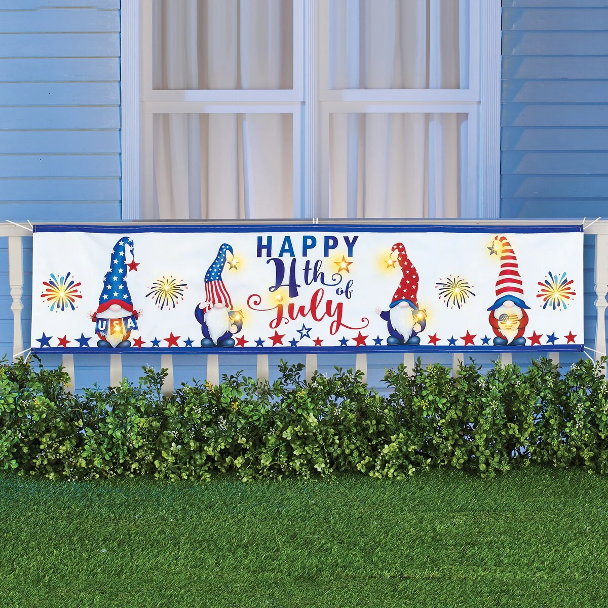 Hang this colorful banner from your porch railing or fence for a festive display. The lighted banner features a 'Happy 4th of July' greeting along with 4 patriotic gnomes, fireworks and stars, while 13 white LED lights add sparkle and shine. Requires 3 'AA' batteries (sold separately). Includes on/off switch and rope ties to make hanging easy. Wipes clean with damp cloth. Polyester and plastic; imported. Measures 58'L x 13 1/2'H.