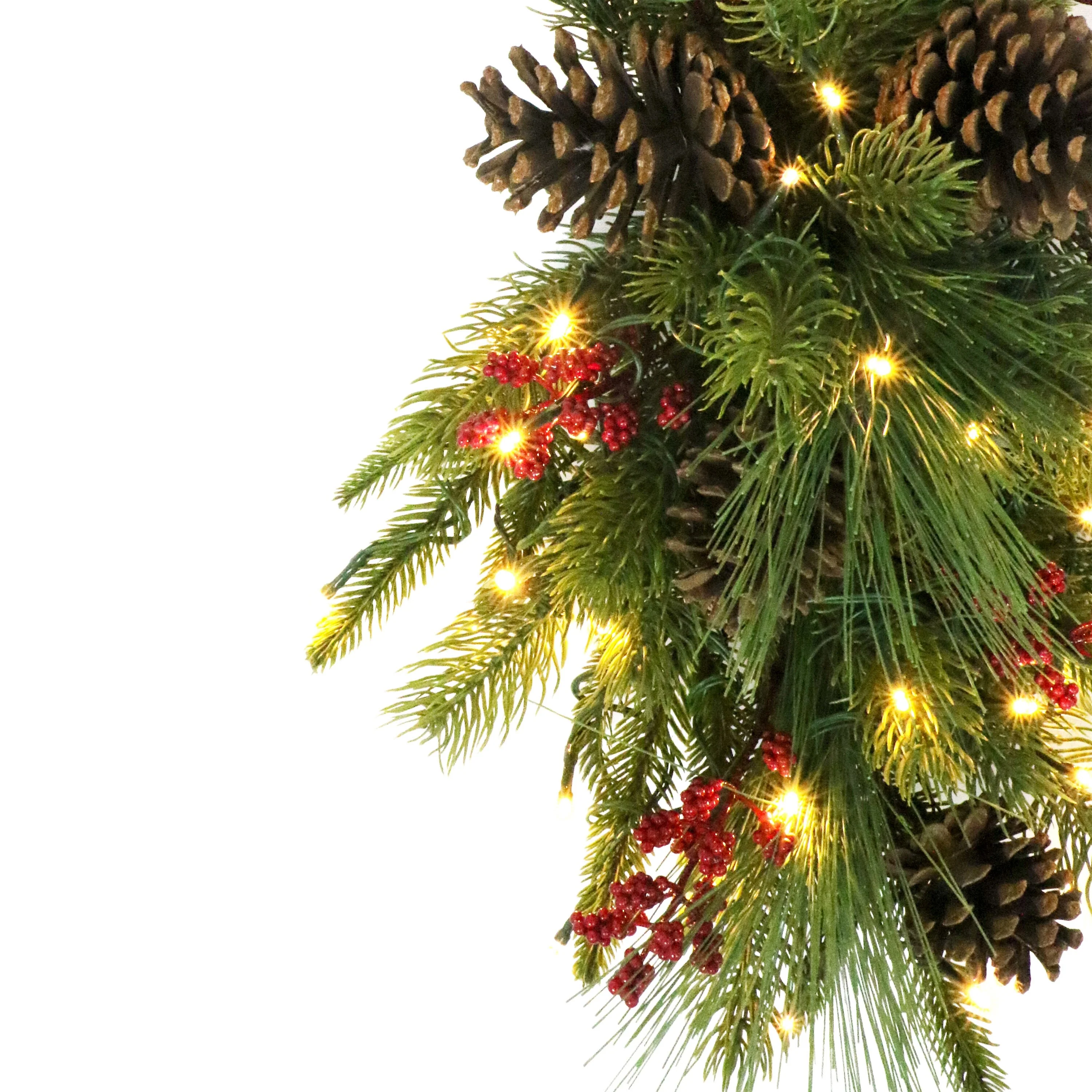- 28' PRE-LIT BATTERY-OPERATED ON/OFF TIMER CHRISTMAS SWAG: Comes with 70 warm white LED lights, ornaments, pinescones and berries providing a soft, inviting glow. The lights are already integrated, so there is no need for extra installation and comes with an 8-16 hour on/off timer for your convenience. Please note: 3 D batteries are not included with the Puleo International 28' Pre-Lit Artificial Banister Swag.