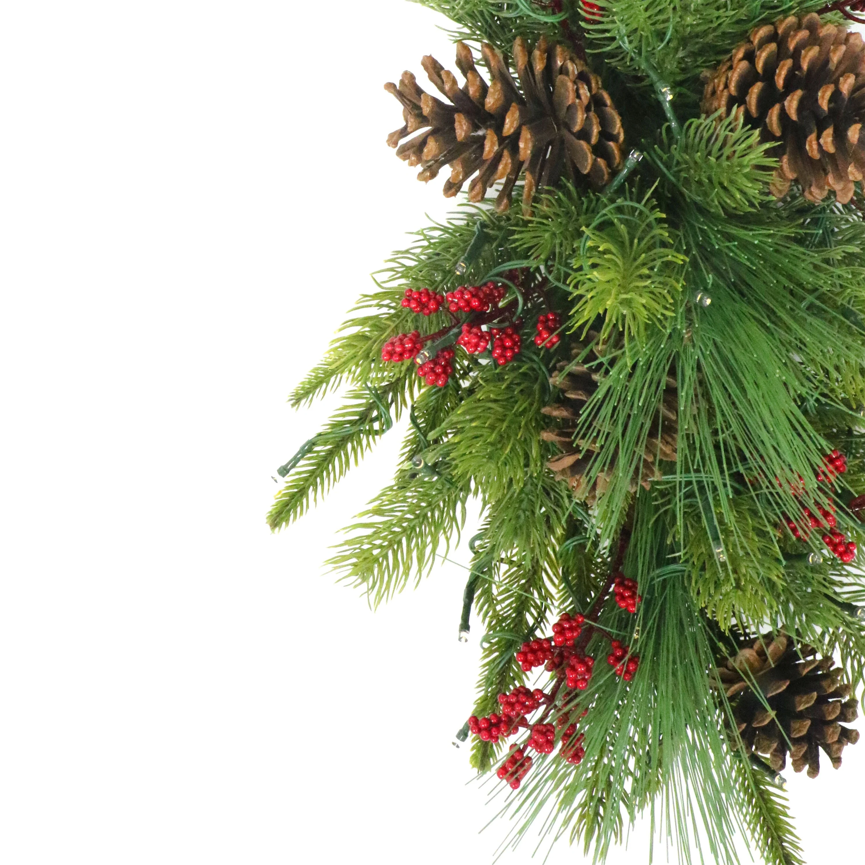 Transform your home into a winter wonderland with the Puleo International 28' Pre-Lit Artificial Red and Green adorned with ornaments, pinecones and berries Banister Swag. Draped in soft, lifelike greenery, this elegant swag brings the spirit of the season to life. The 70 warm white LED lights cast a gentle, enchanting glow, turning any space into a cozy, festive haven. Perfect for placing anywhere inside or outside your home, it adds just the right touch of warmth and charm. No need to worry about upkeep—this pre-lit, artificial beauty will shine season after season, keeping your home adorned in holiday magic. Let it become the centerpiece of your seasonal decor and create memories that will last a lifetime.