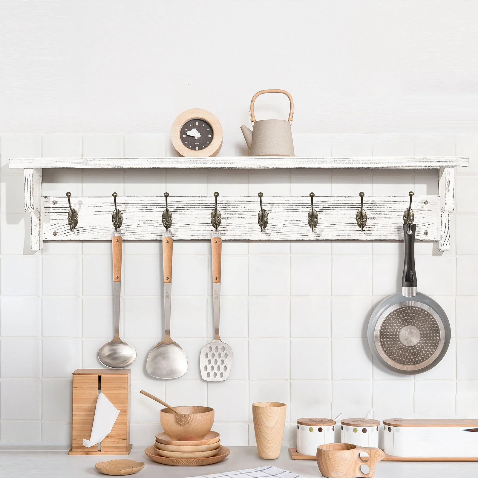 💡【Multifunctional Hooks & Shelf 】This multifunctional wall mount coat rack comes with 8 heavy-duty metal hooks to hold coats, bags, scarves, umbrellas, towels, keys, and other accessories. It is equipped with a floating shelf, perfect for displaying and storing something like books, pictures, figurines, collectibles, medicine, spices, etc.